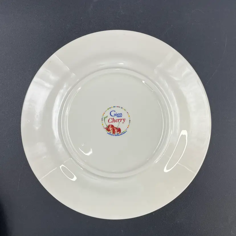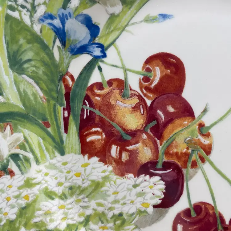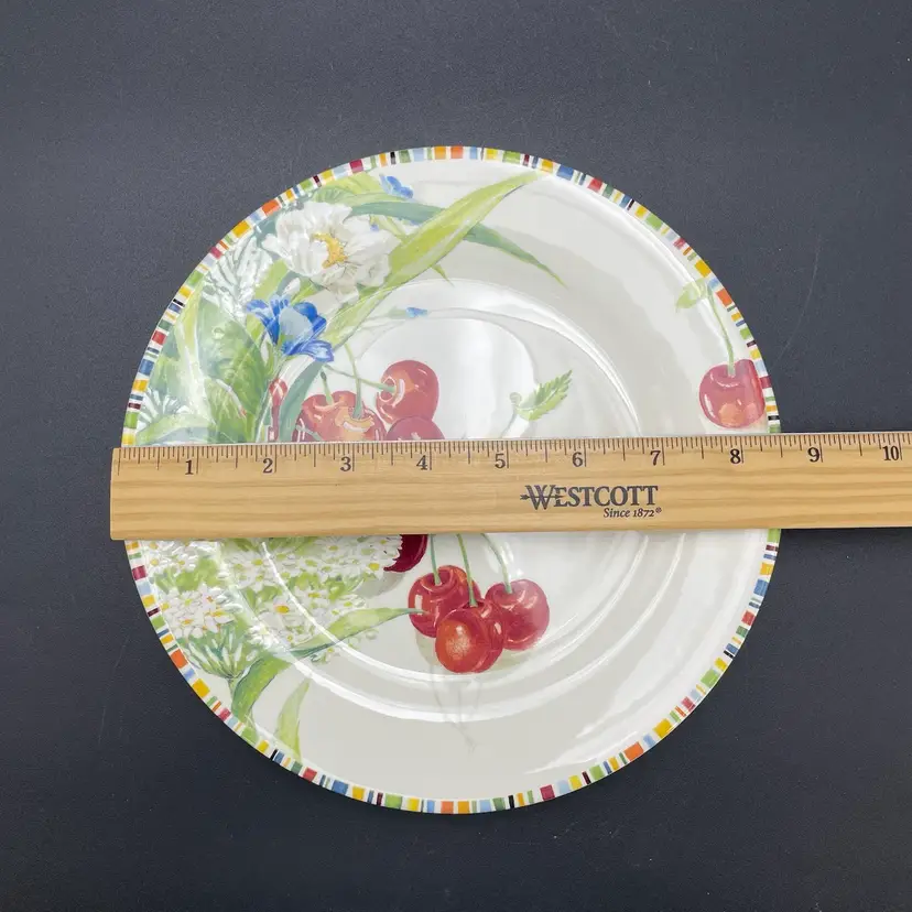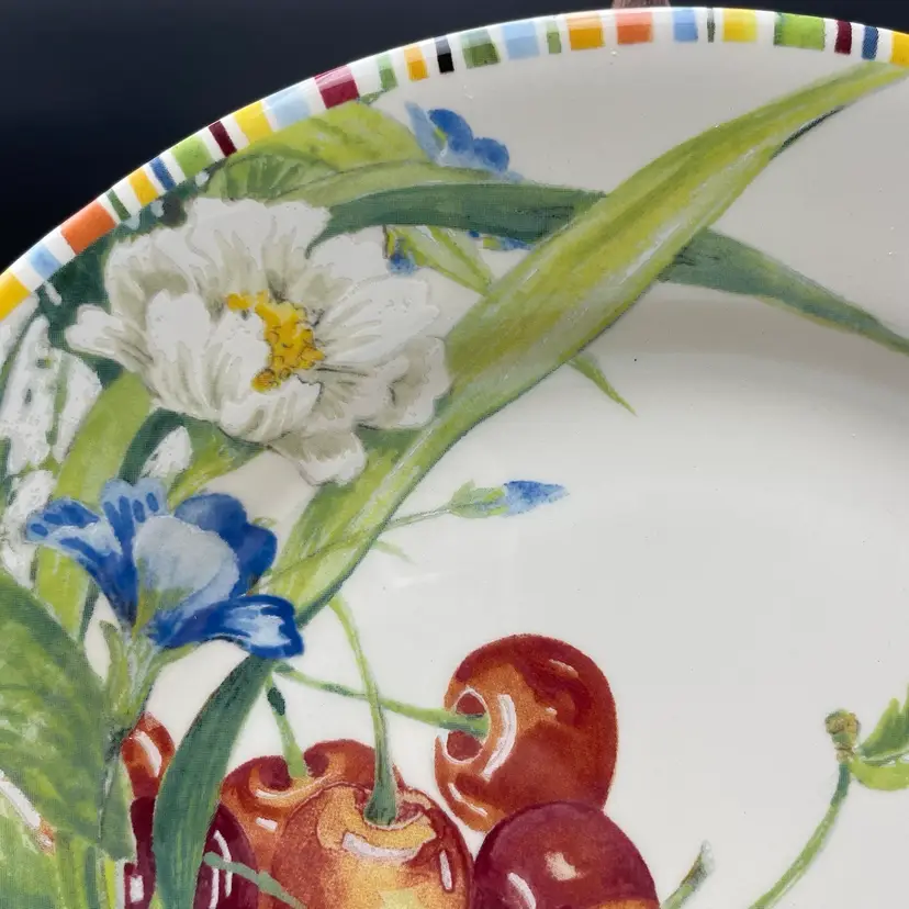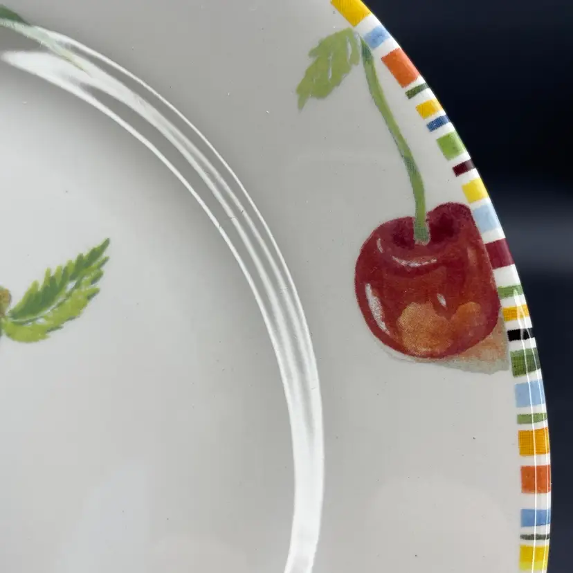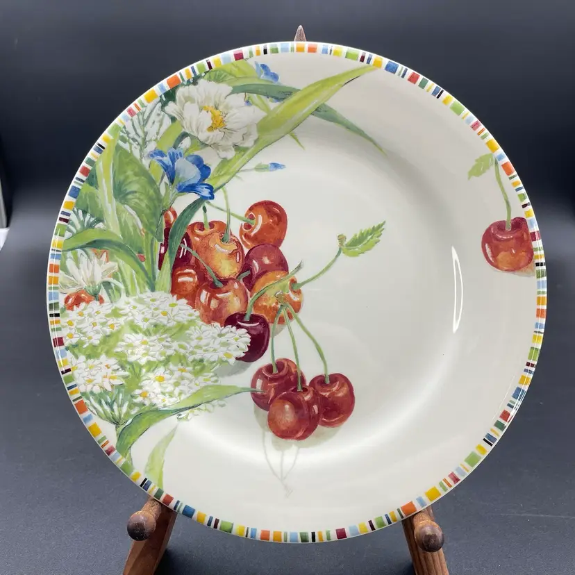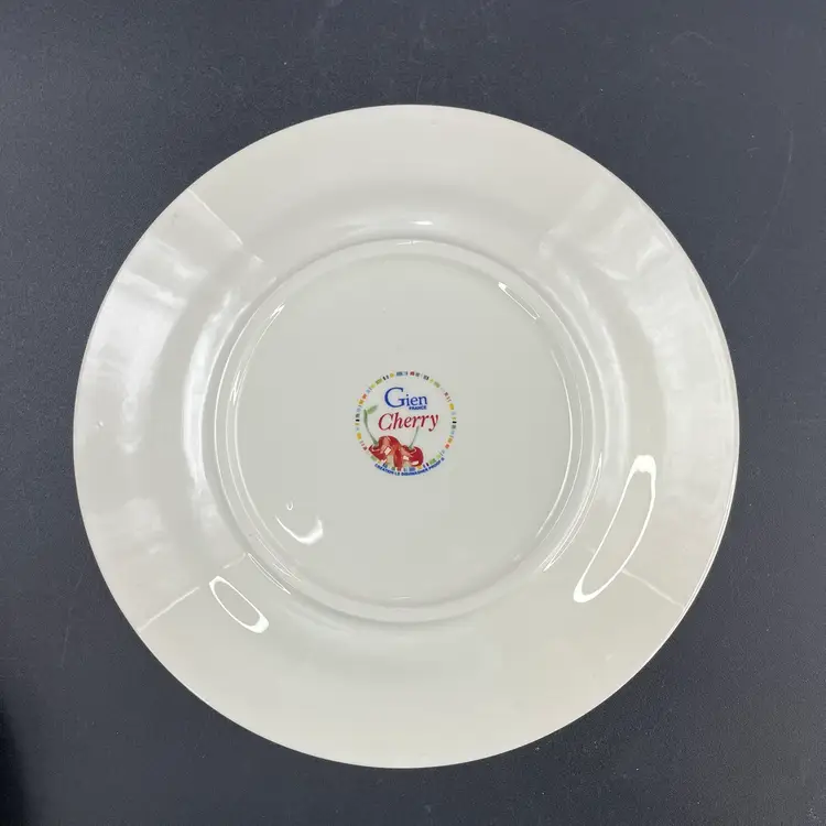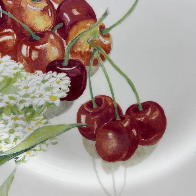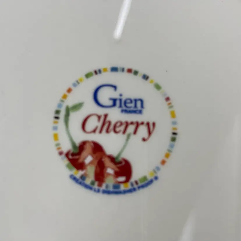 This is a set of 2 Faiencerie de Gien Cherry salad or dessert plates. Marked on bottom. Made in France. Each measure approximately 8.5" in diameter. No chips or cracks. Stand not included.