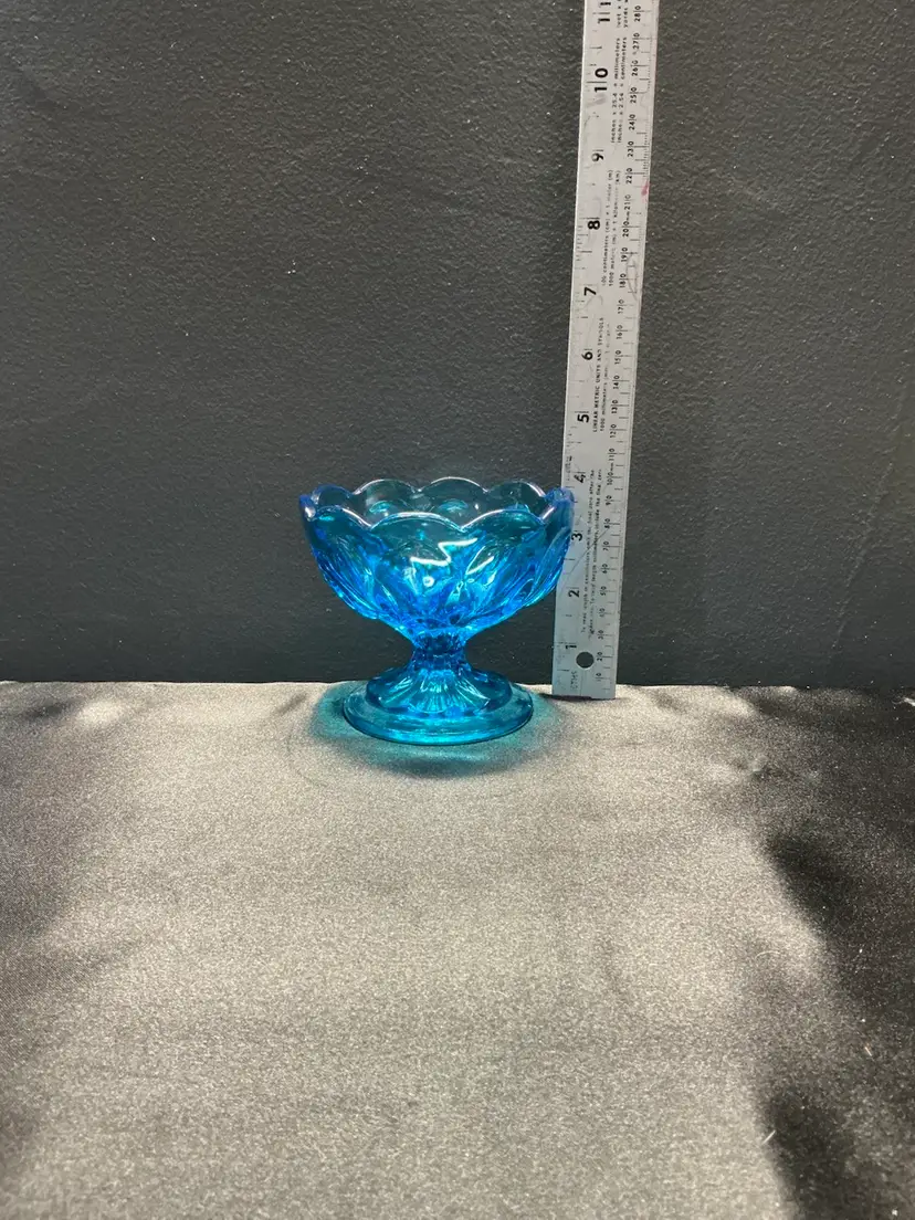 The Fairfield Laser Blue compote dessert dish bowl by Anchor Hocking is a vintage piece of pressed glass from the 1970s. This elegant bowl features a beautiful blue color with a laser-cut design, adding a touch of sophistication to any table setting. Perfect for serving desserts or candies, this vintage piece is a charming addition to any collection of decorative cookware and serveware. Made by a reputable brand like Anchor Hocking, this compote dessert dish bowl is sure to be a conversation starter at any dining occasion.