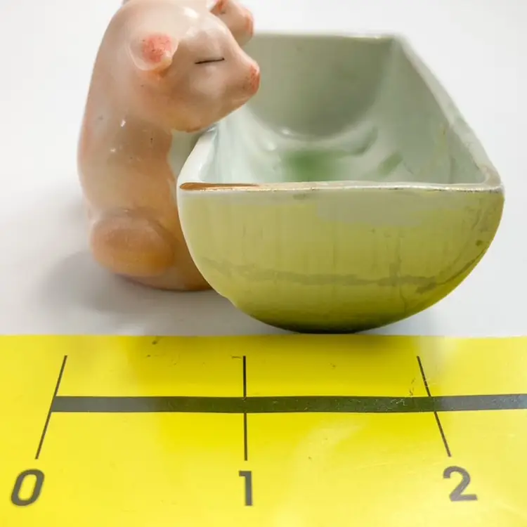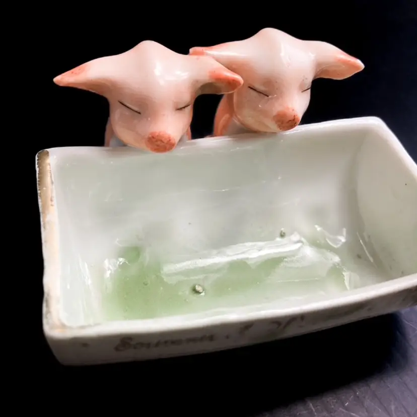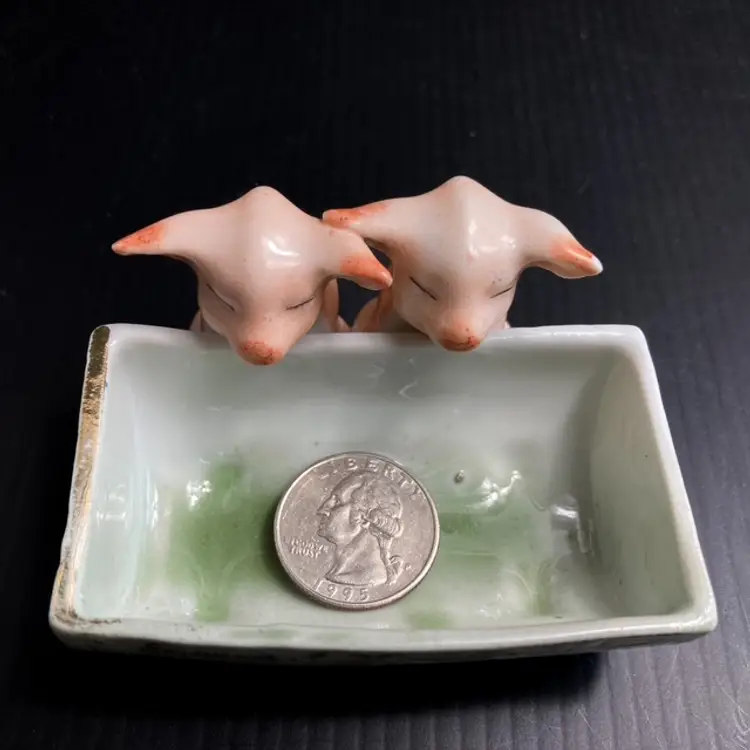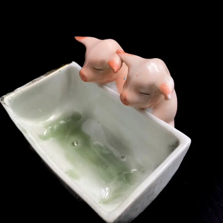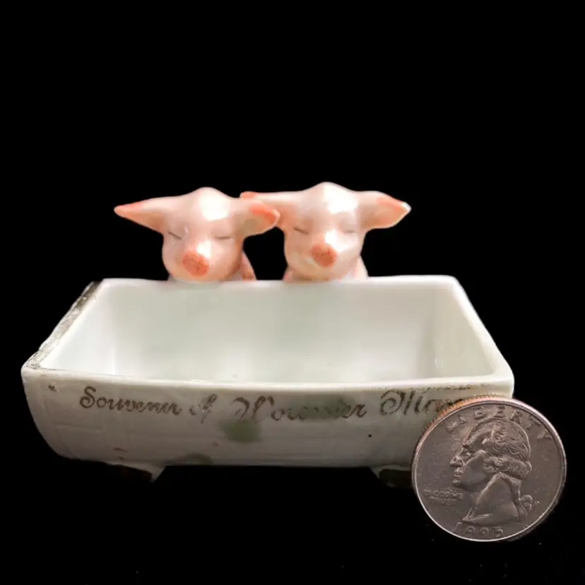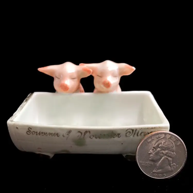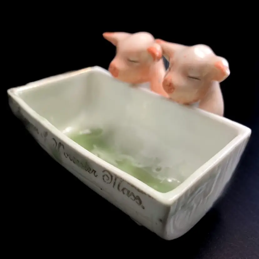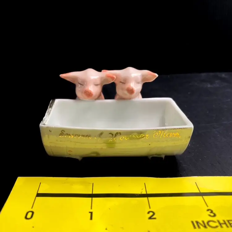 Charming pair of pigs at the trough. Massachusetts fair souvenir Toothpick/Salt Holder made in Germany. Quite a bit of wear on gilded edges and glaze. Small chip on one ear-please see photos. bmtk98