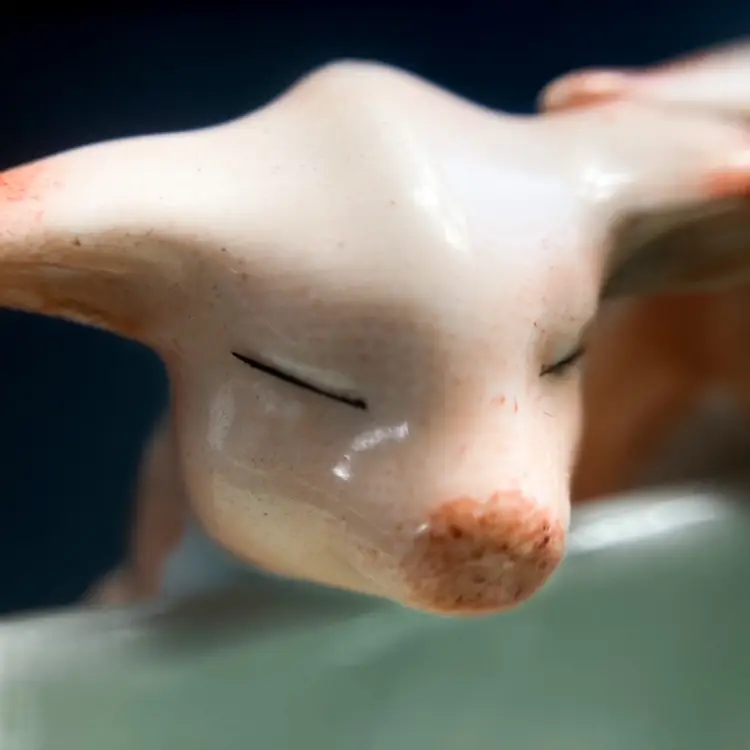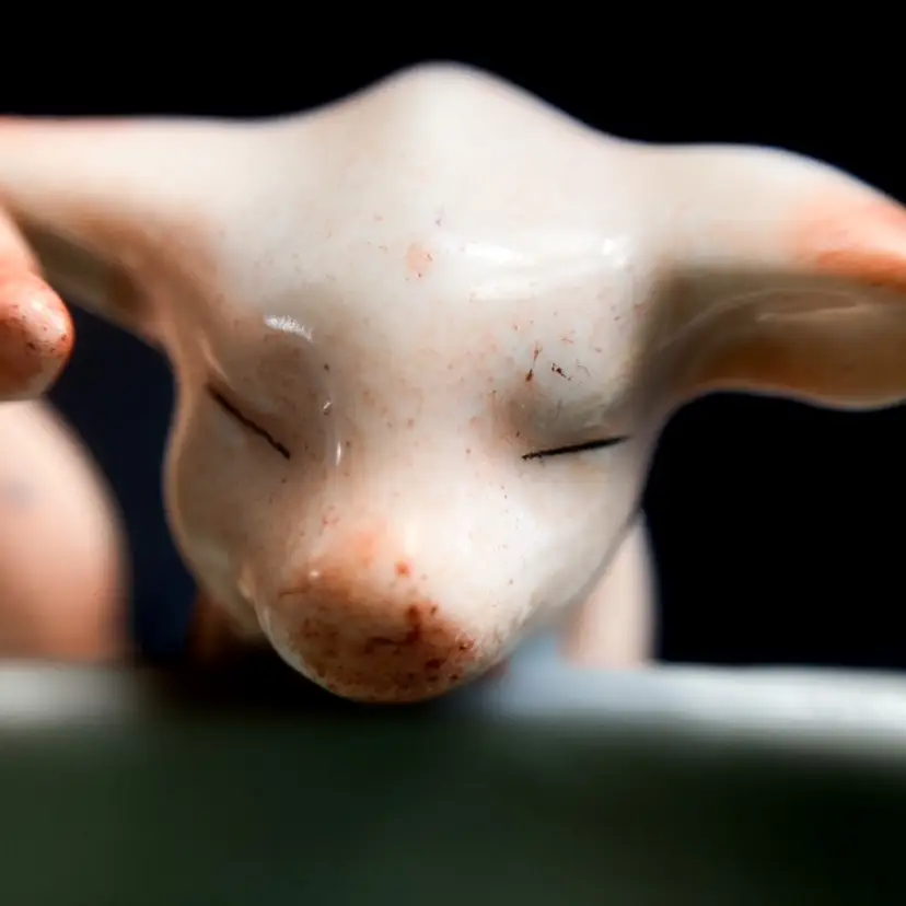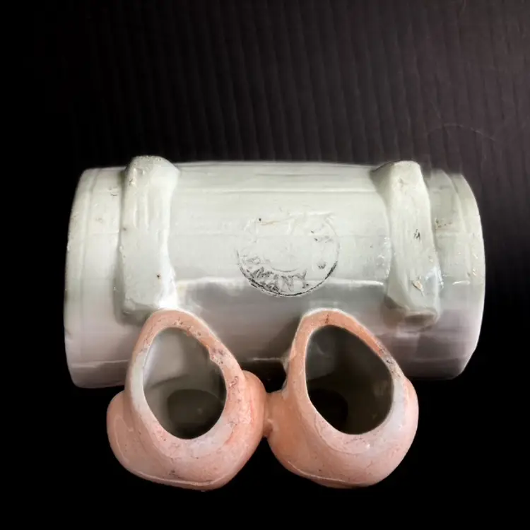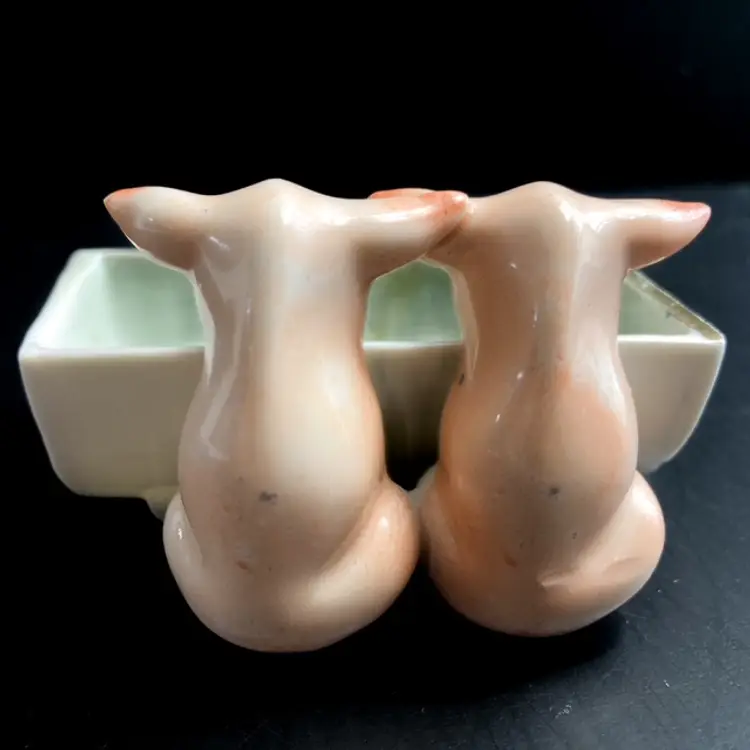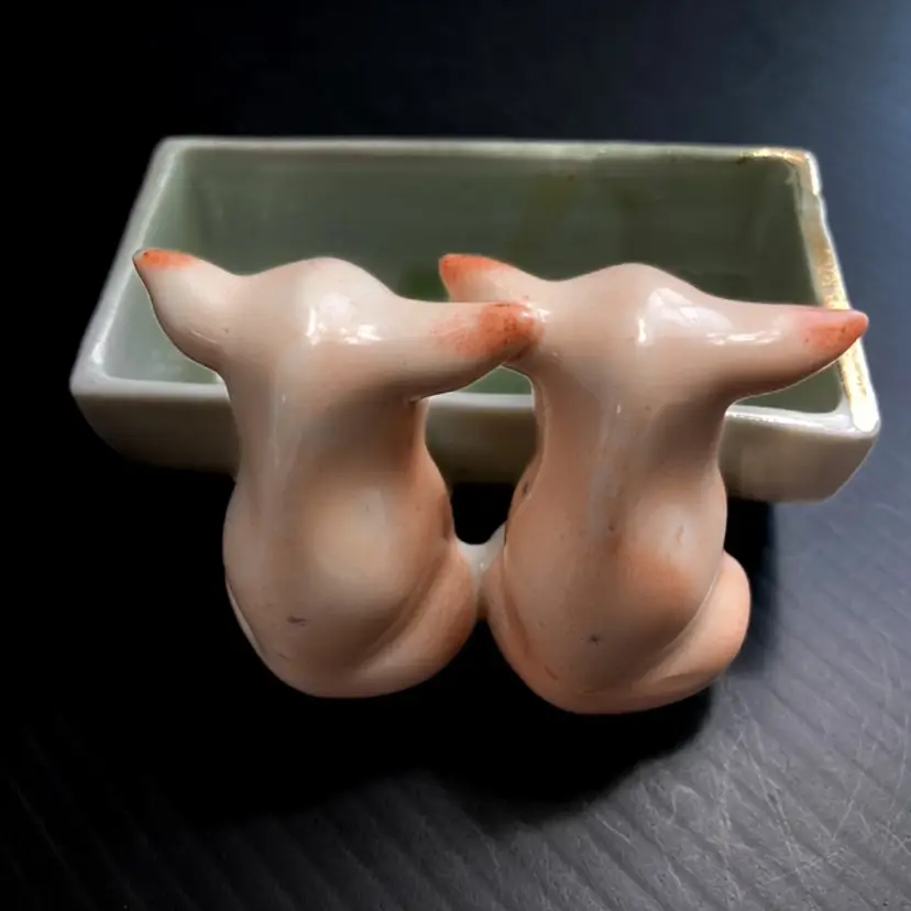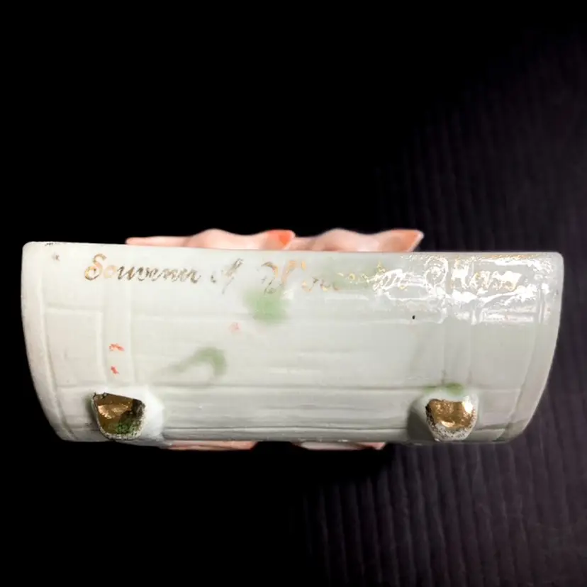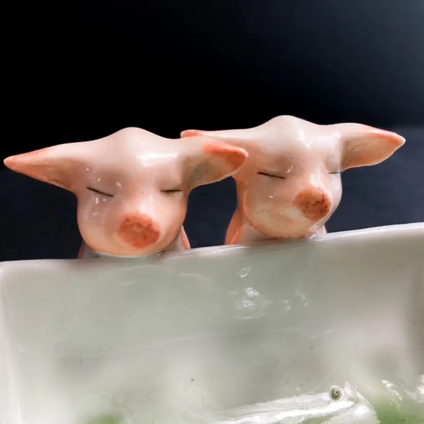 Charming pair of pigs at the trough. Massachusetts fair souvenir Toothpick/Salt Holder made in Germany. Quite a bit of wear on gilded edges and glaze. Small chip on one ear-please see photos. bmtk98