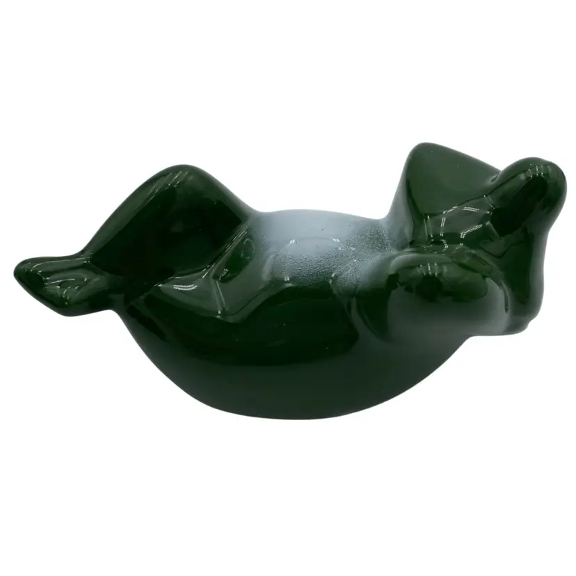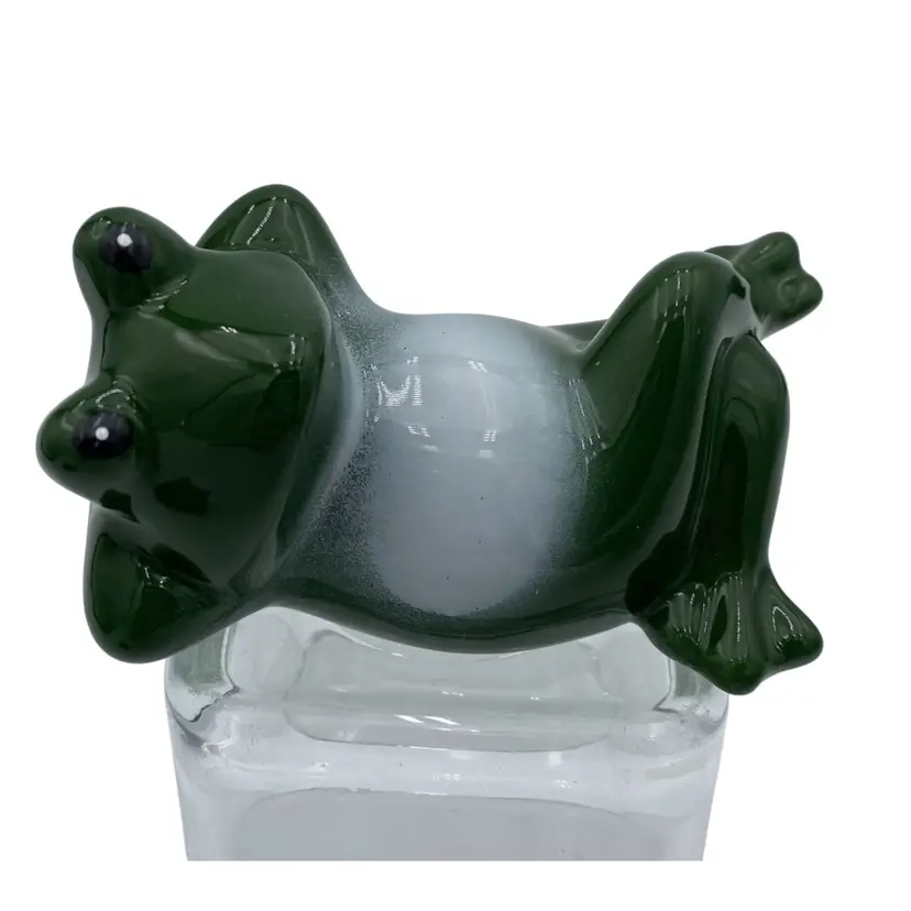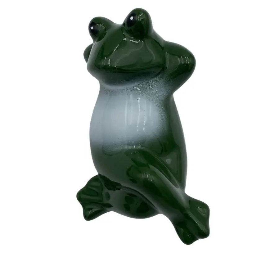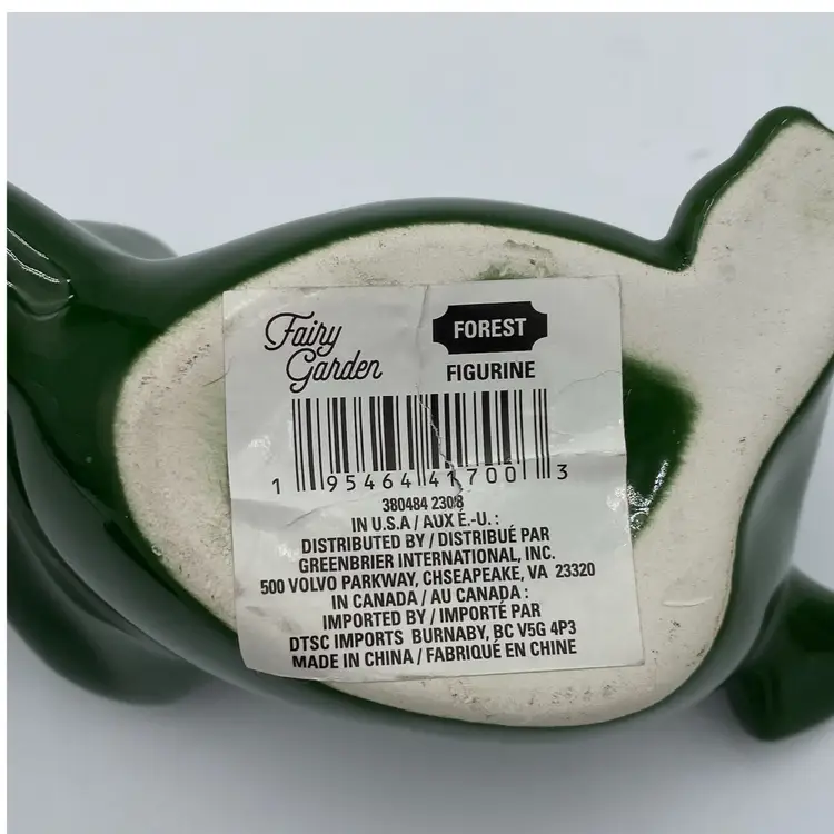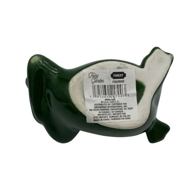 Add a touch of nature's whimsy to your home with this beautiful Fairy Garden Forest Figurine. This porcelain figurine features a reclining dark green frog with a white belly, happy and relaxed! Measuring 4.5 inches in length and 2.5 inches in width, this small but charming figurine is ideal for use on a porch, a shelf inside, in your garden, or anywhere you wish to add some fun. The frog figurine is made in China and comes with its original sticker. This figurine is perfect for those who love frogs, and it weighs only 3.5 ounces. Bring a touch of nature to your home with this delightful Fairy Garden Forest Figurine.