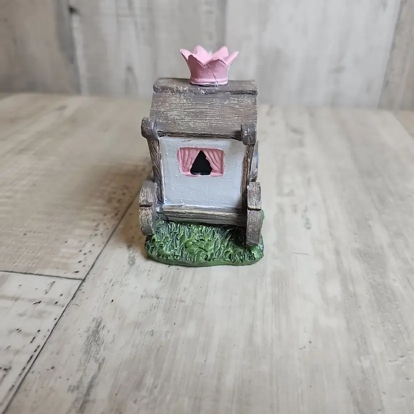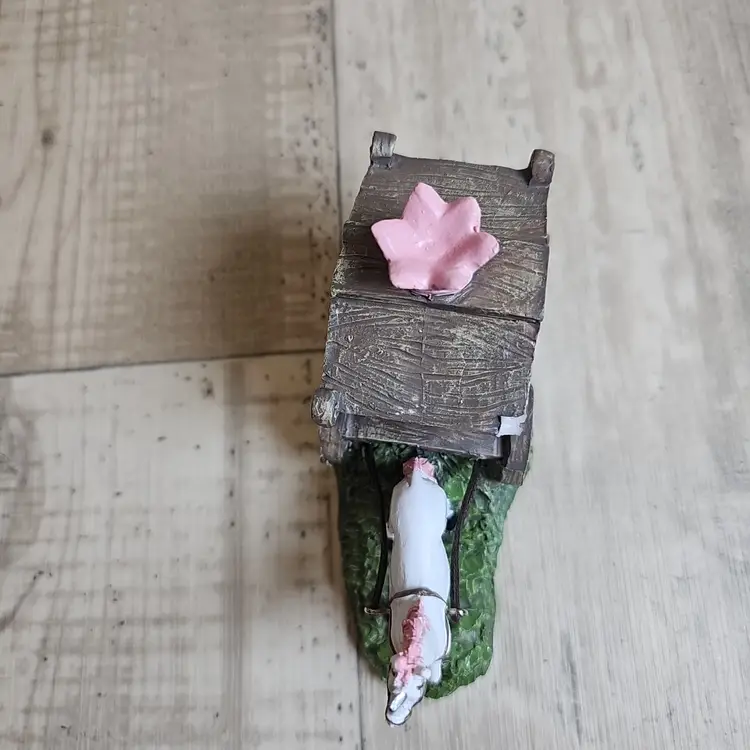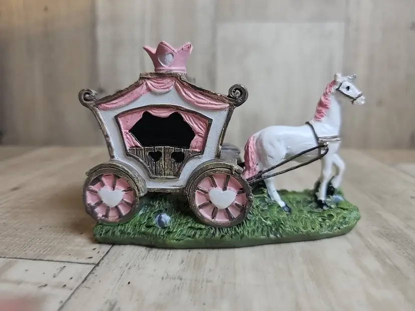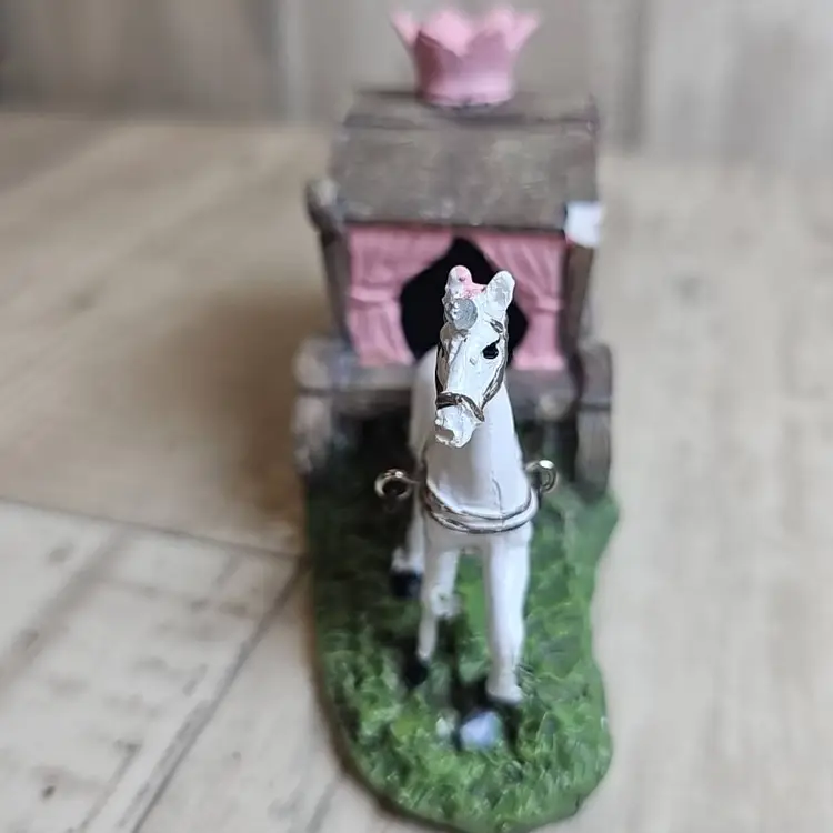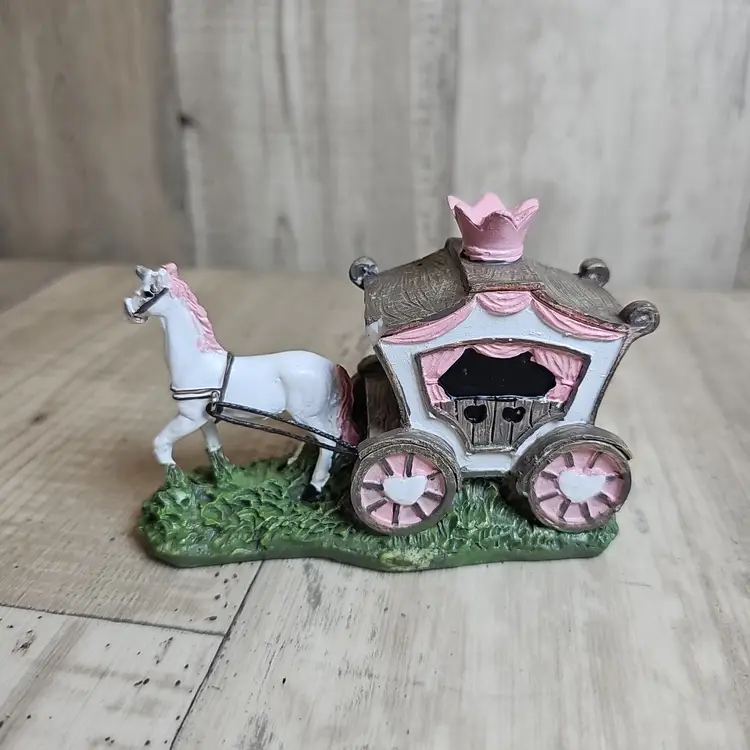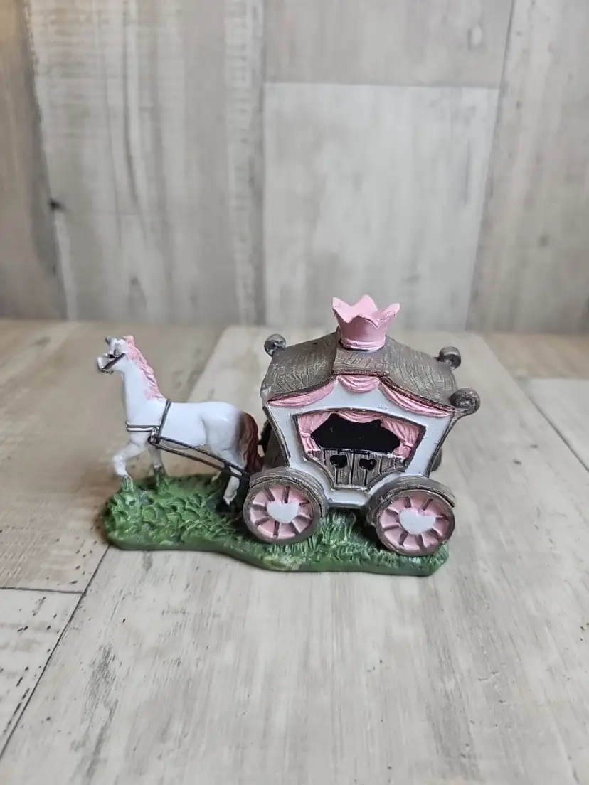 Resin fairy tale carriage with white horse and pink accents. Perfect for fairy gardens, princess displays, or whimsical décor. Hand-painted details with heart wheels and crown top carriage.