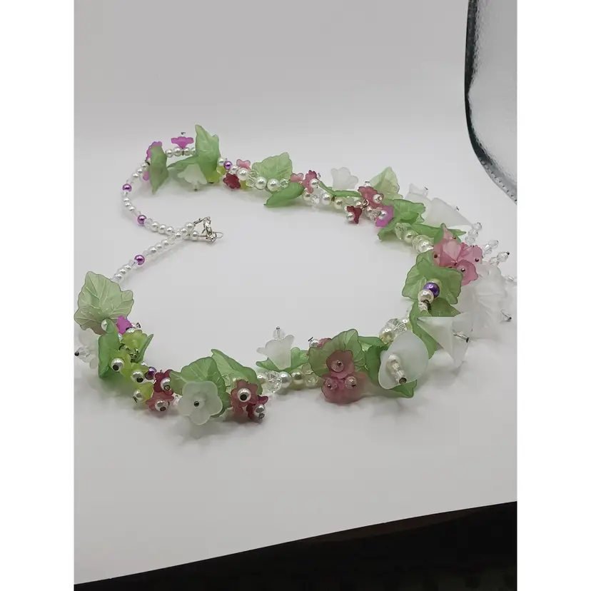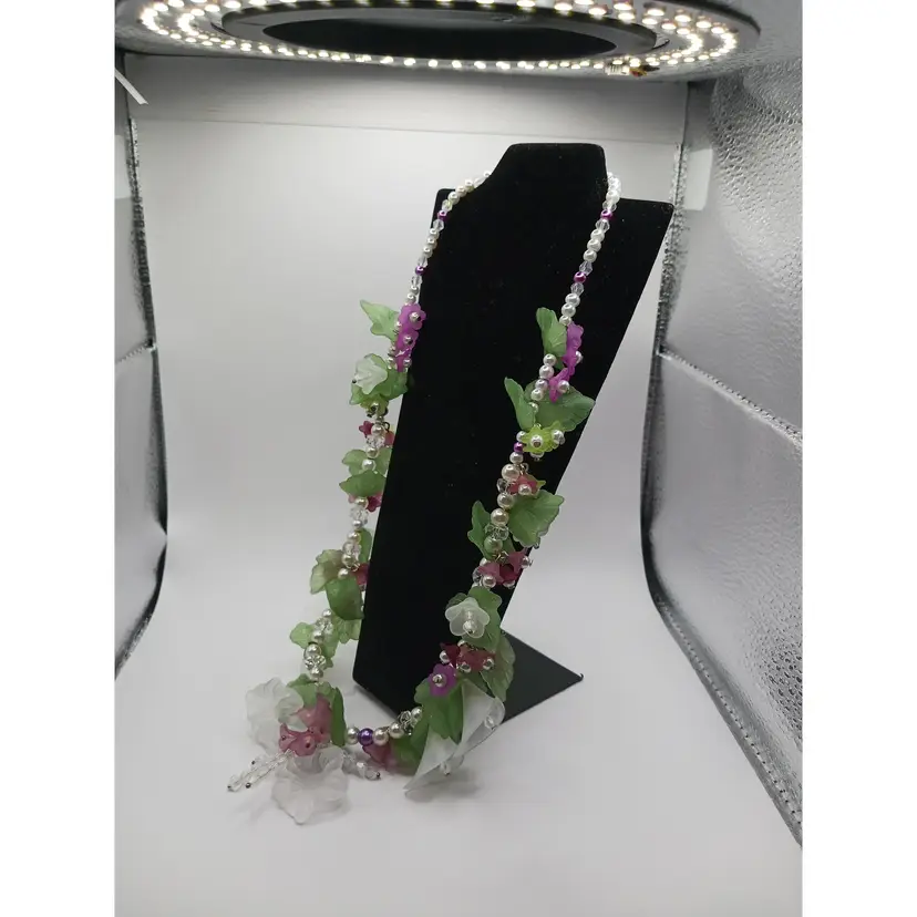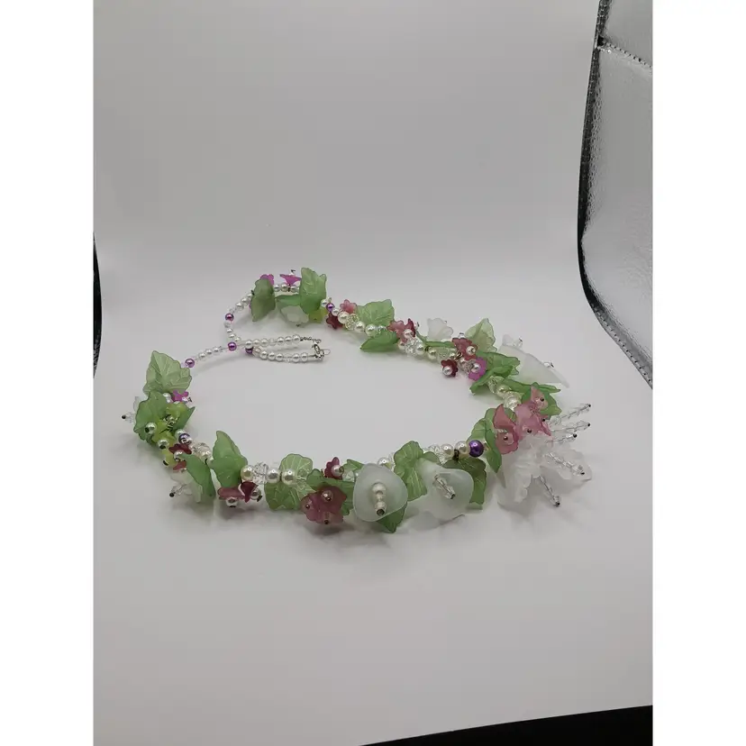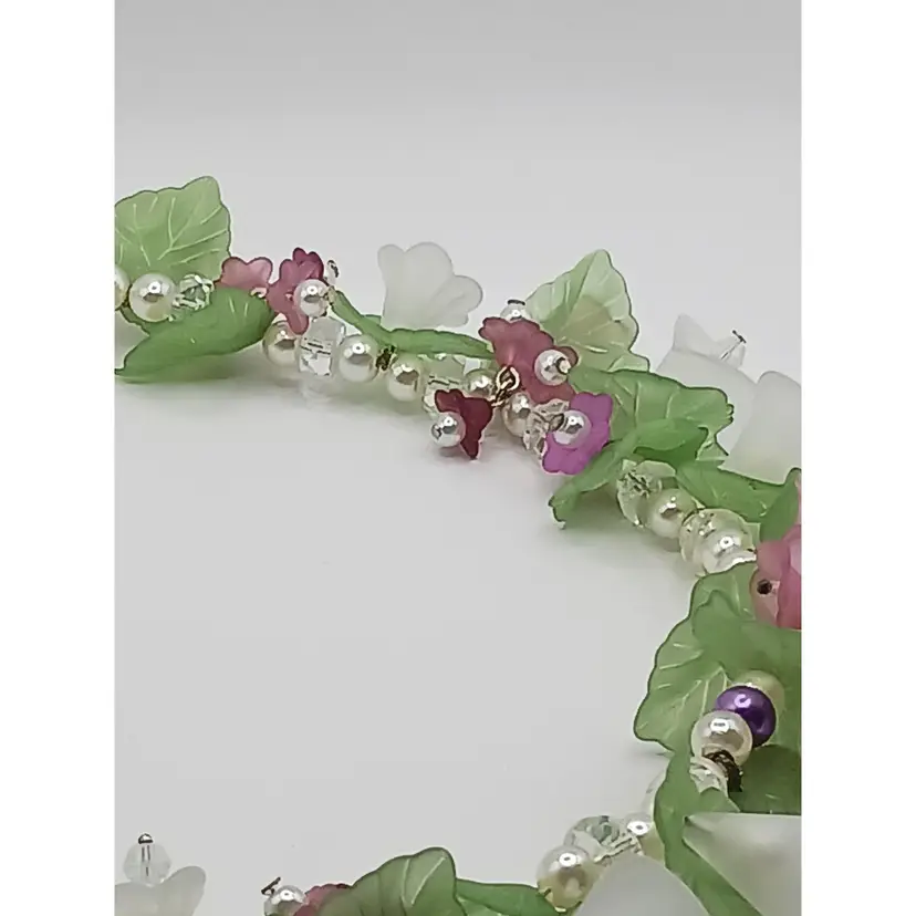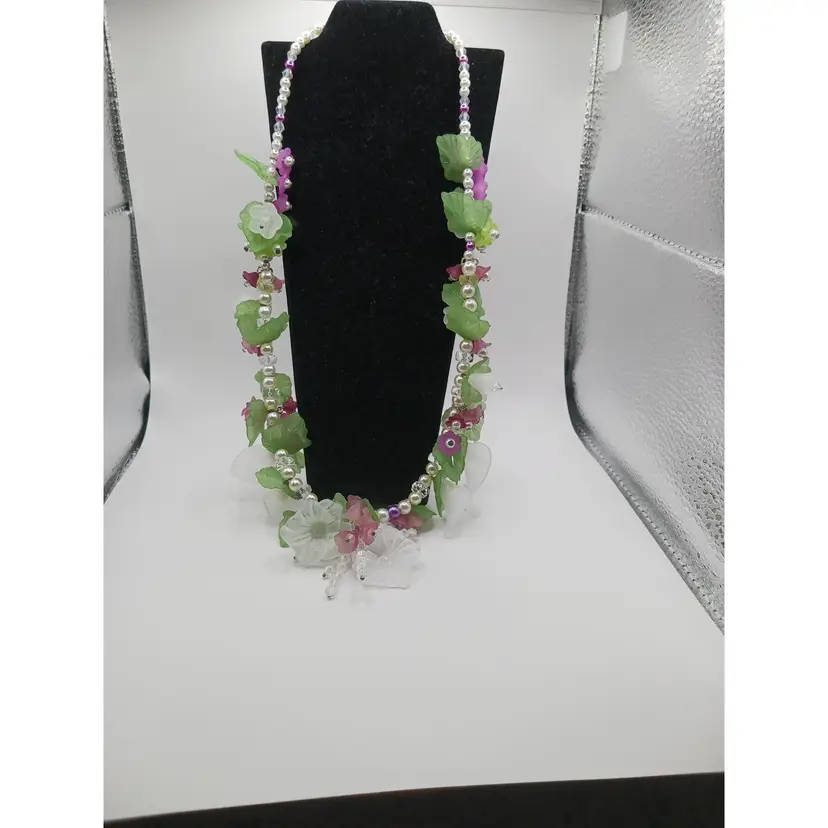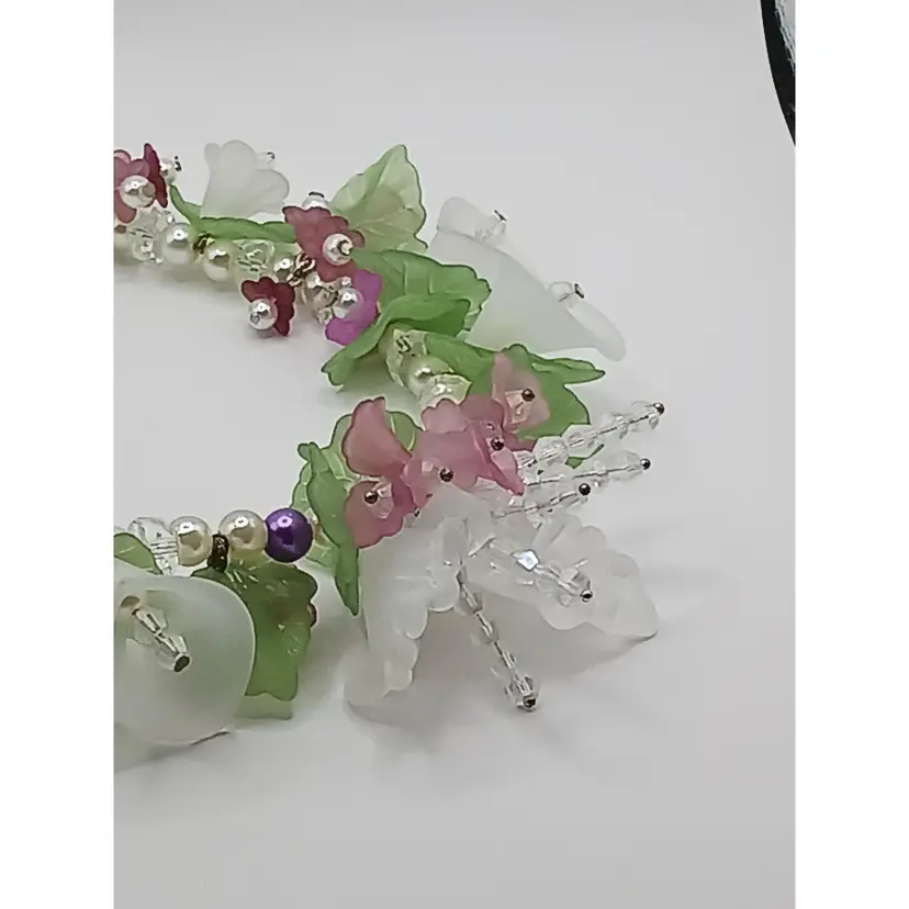 NM2286 – A Fairy Garden to wear all day! White Calla Lilies and purple and lavender flowers of Acrylic and Ivy leaves have been set off with Crystal bicone beads and Cut Crystal spacer beads and body of necklace also has Glass Pearl Beads with purple glass pearl beads to help accents this 21 inch necklace.
