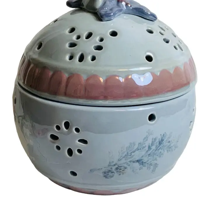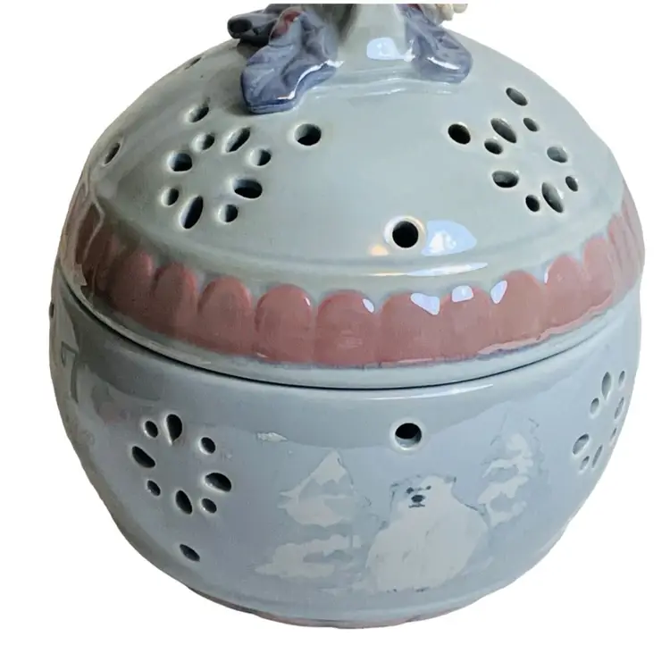 Gorgeous ceramic Christmas fairy light. It in in great condition. No chips or cracks. It is approximately 6.5” tall and 6.5” in diameter. Stunning. Features a lovely Nordic winter scene with a pilar bear and some evergreens. Lovely!