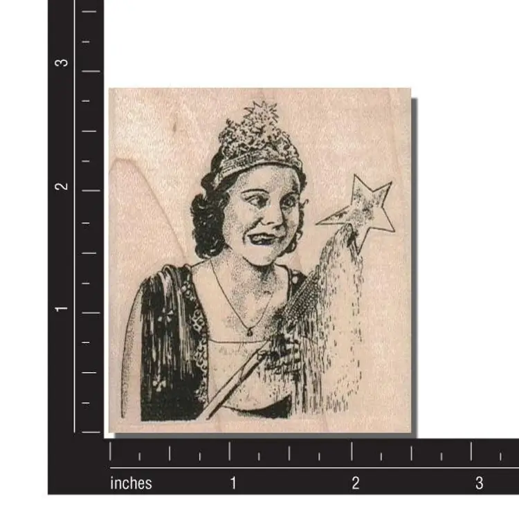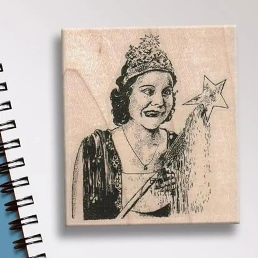 Fairy Woman With Star Wand and Crown Rubber Stamp Size: 2-3/4 x 2-1/2 inches Wood Mounted Red Rubber Handmade • Perfect for card making, gift tags, scrapbooking, journaling, crafting and anywhere you need to stamp a crazy woman.