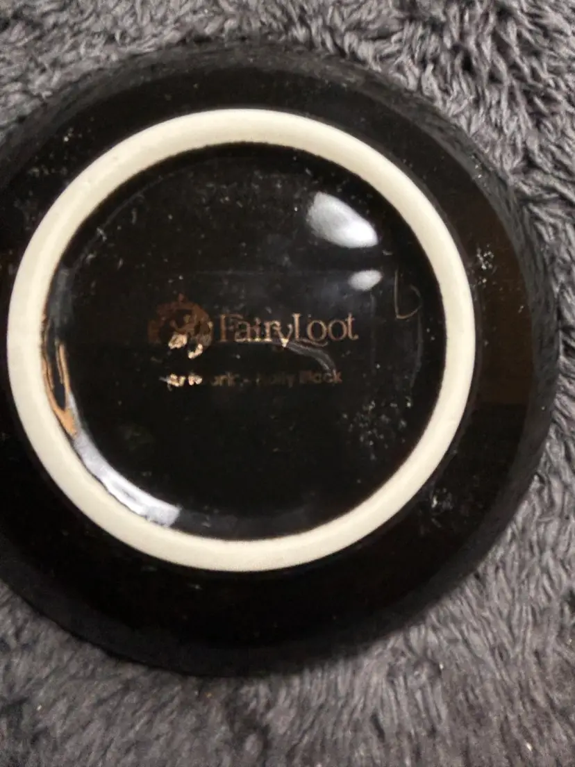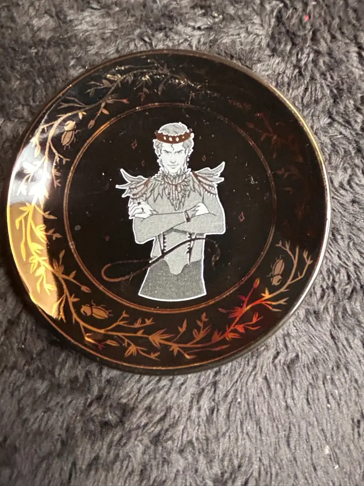 This piece was released as a FairyLoot Exclusive item, specifically designed by the artist ARZ28 for their monthly subscription box. The tray is approximately 4 inches in size and features metallic gold-foiled detailing of vines and beetles surrounding the central character illustration