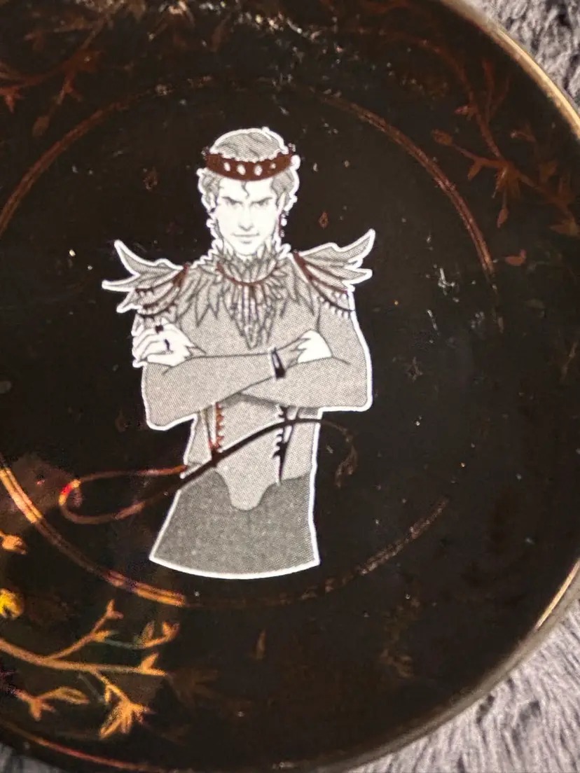 This is an official Cardan Trinket Tray, a ceramic dish featuring the character Cardan Greenbriar from Holly Black's The Folk of the Air trilogy (specifically The Cruel Prince).