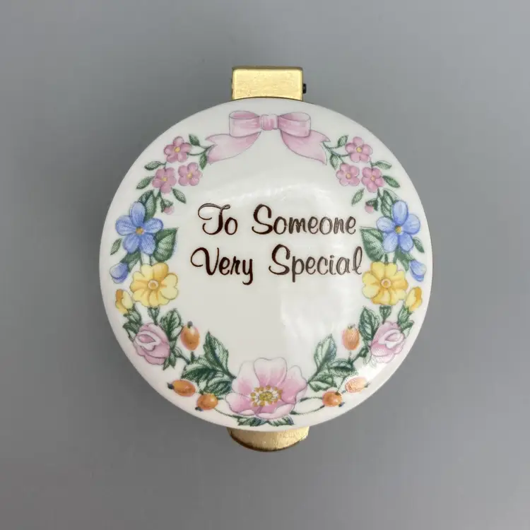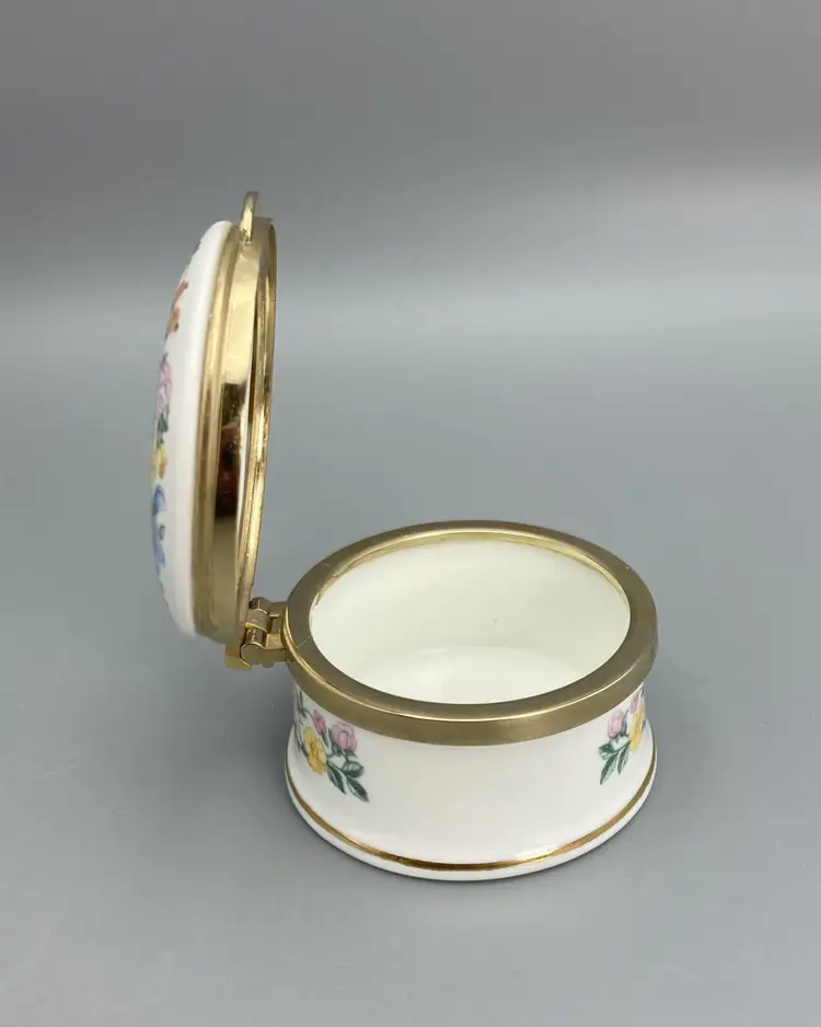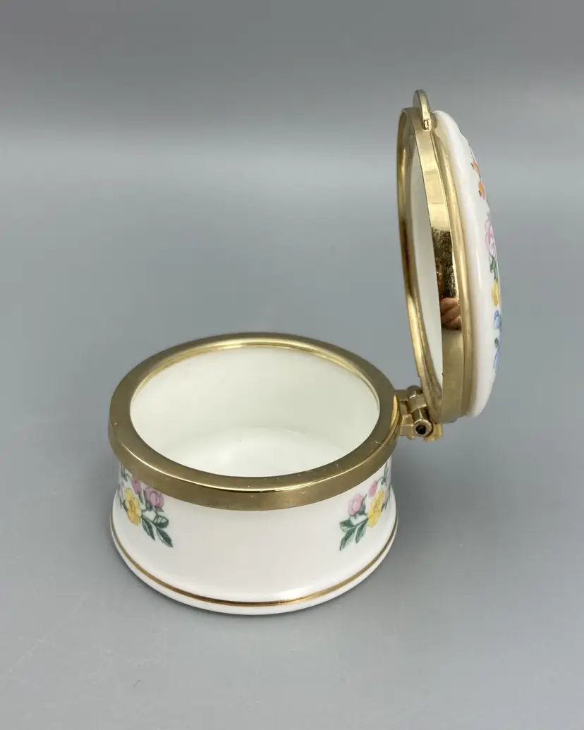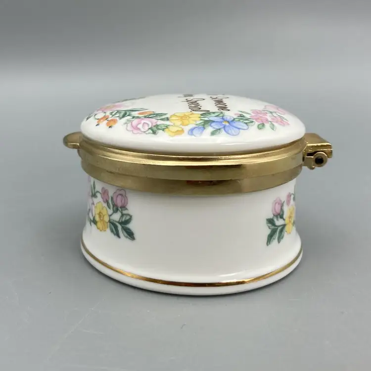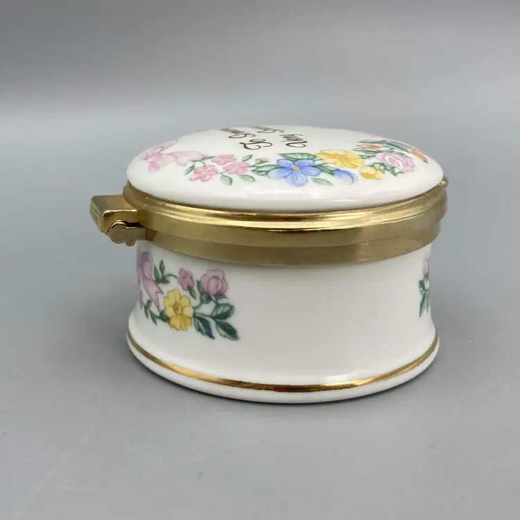 This trinket box is in good condition. It measures approximately 2" across and 1 1/2" tall.