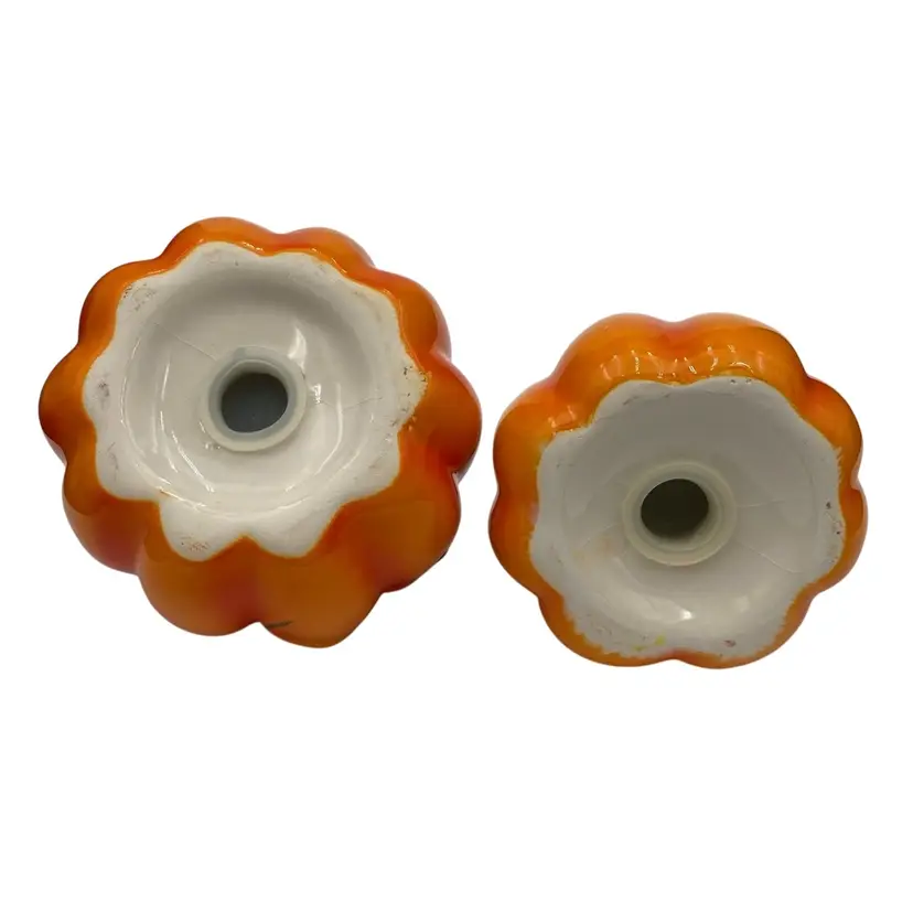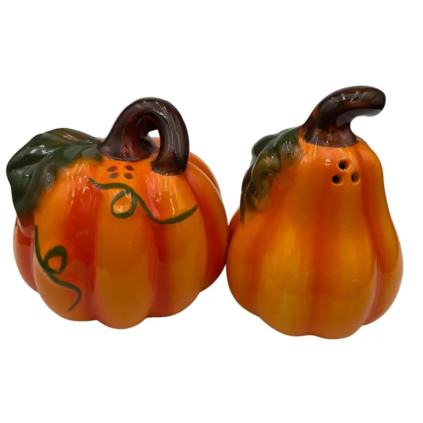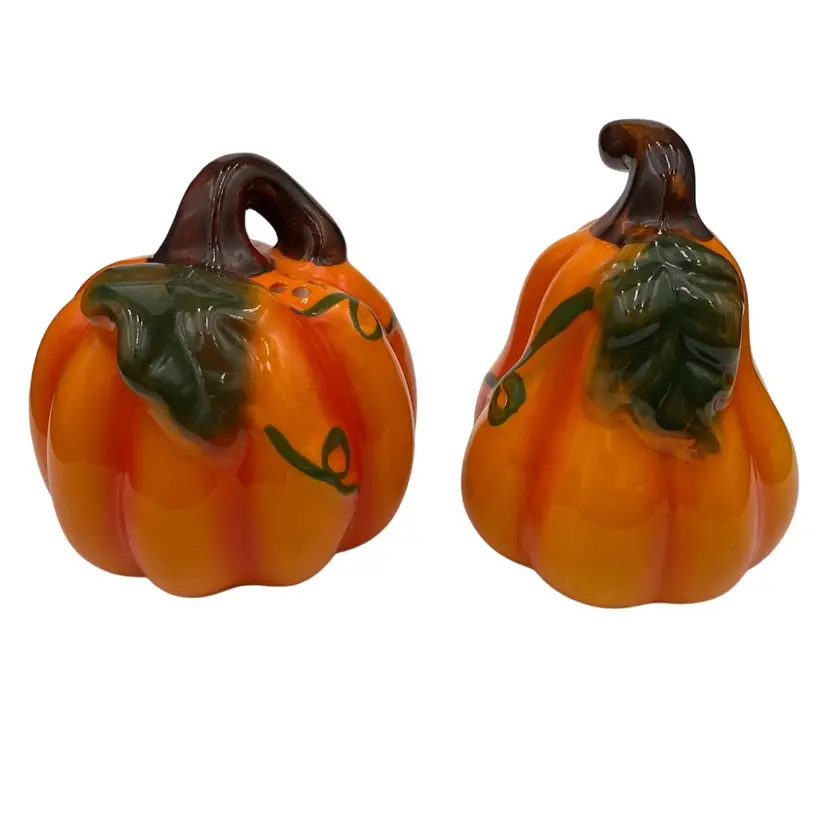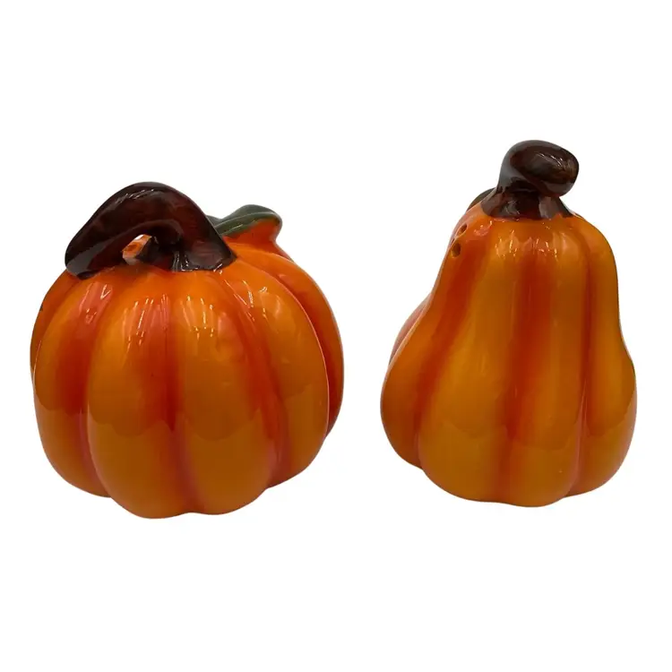 These painted Pumpkin Ceramic Salt & Pepper Shakers are the perfect addition to your autumn decor. The set includes two medium-sized shakers in a festive orange color. Imported from China, these original shakers are sure to brighten up your dining table with a touch of Fall themed flair. They would work well for the fall season, Halloween or Thanksgiving.