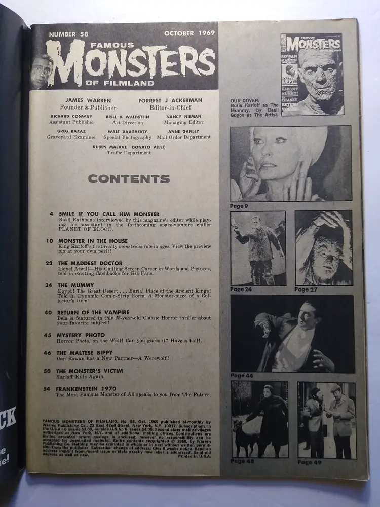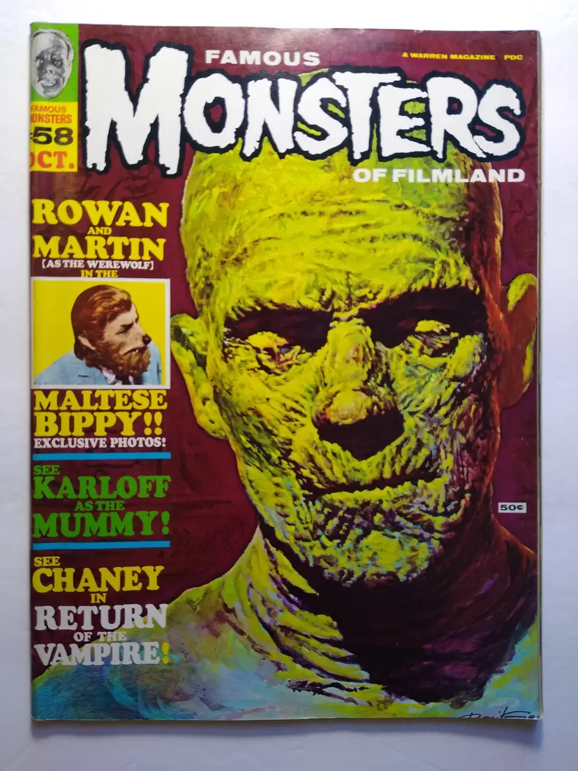 Dive into the golden age of horror with Famous Monsters of Filmland Magazine, Issue #58, from October 1969. This vintage collectible features the iconic Mummy cover art by the legendary Basil Gogos. Inside, you'll discover thrilling articles and exclusive photos, including a spotlight on Rowan and Martin as The Werewolf from "The Maltese Bippy," plus a look at Boris Karloff as The Mummy and Lon Chaney Jr. in "Return of the Vampire." Explore classic film history and the creatures that defined a generation.