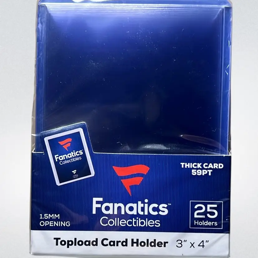LIMIT 4 Please! Fanatics 59pt Thick Toploaders 25pc pack. Please contact to discuss shipping and price for larger quantities. FIRST TIME CUSTOMERS: GRAB 2 AND USE CODE MBB FOR $5 OFF! (first timers only also get free shipping, hobby hack!) This is a stacked shipping item and will not ship until the “shipping request” is purchased for $6 or you have an item purchased that includes free shipping to combine it with. There is no deadline to purchase shipping and your stack is saved indefinitely.