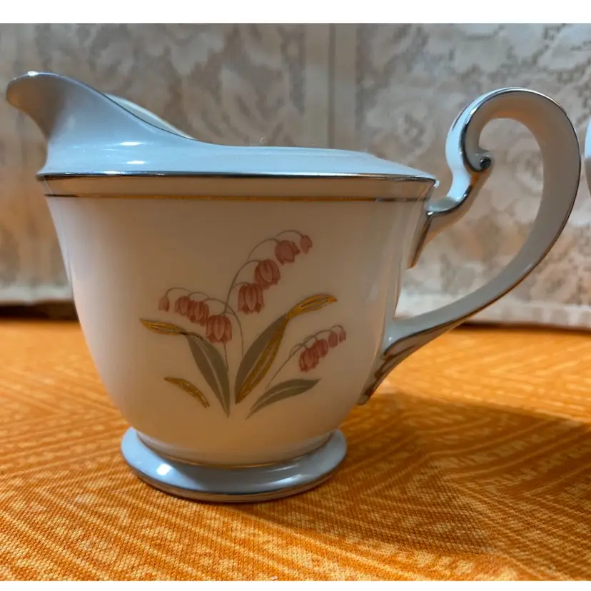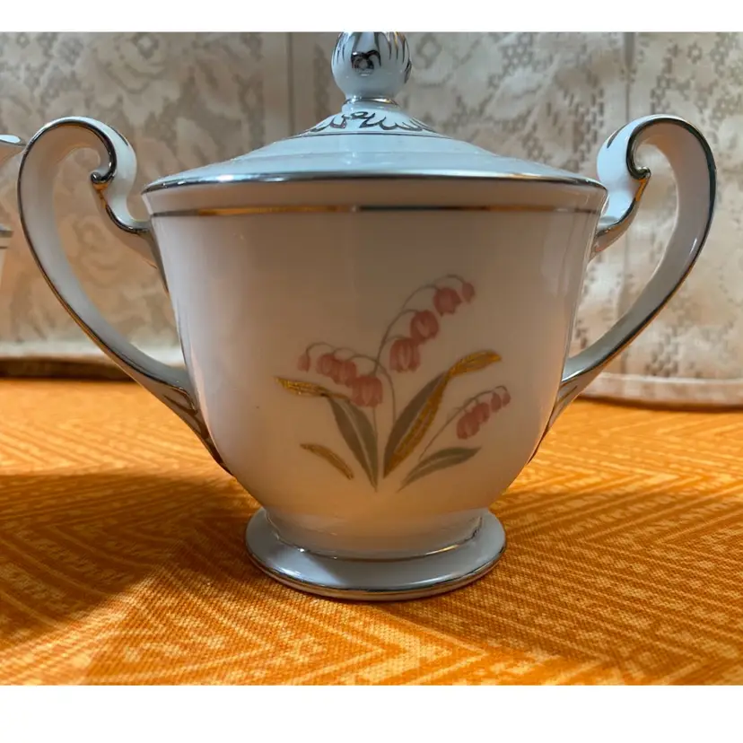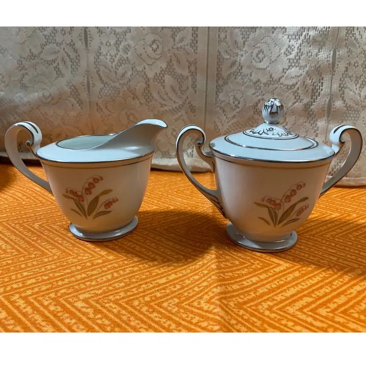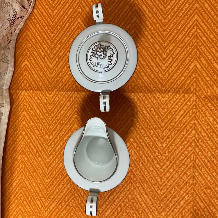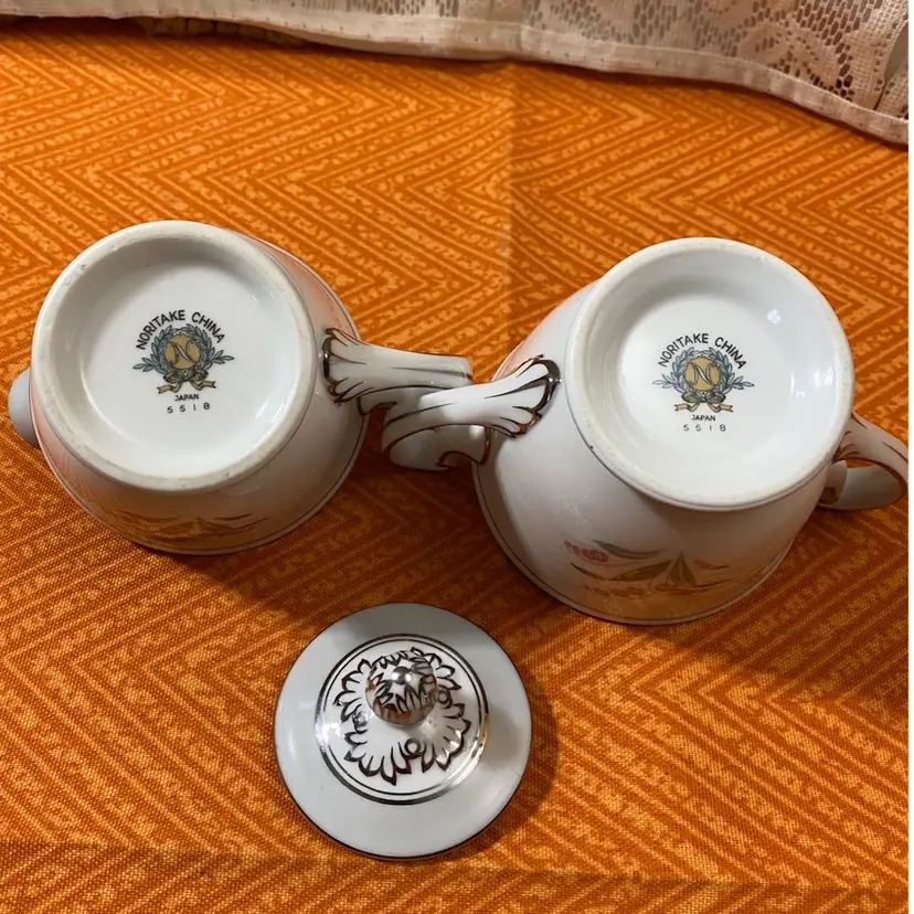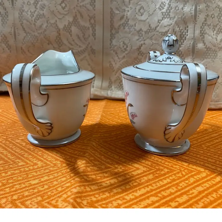 Creamer measures: 3 1/2” x 5”Sugar Jar measures: 4 1/2” x 5”. Overall good condition there is one area on the sugar jar that has a scratch through the silver leaf as seen in the last photo.