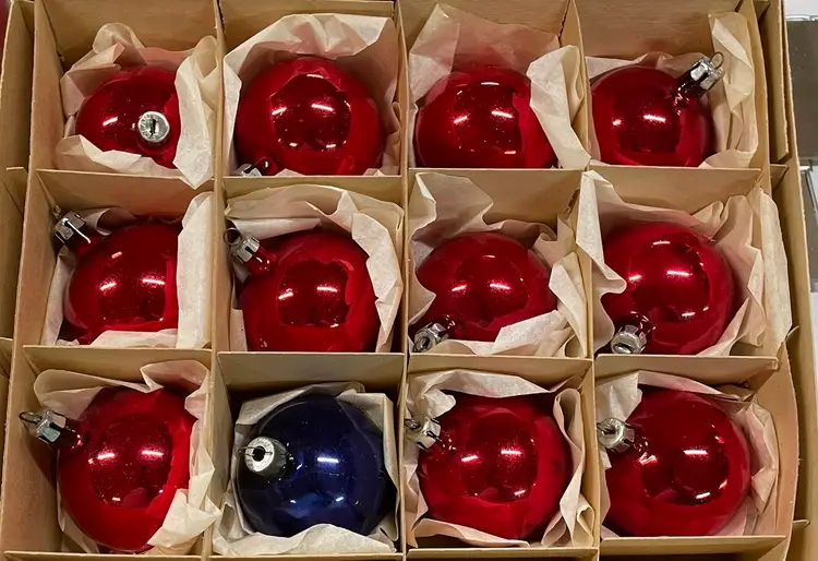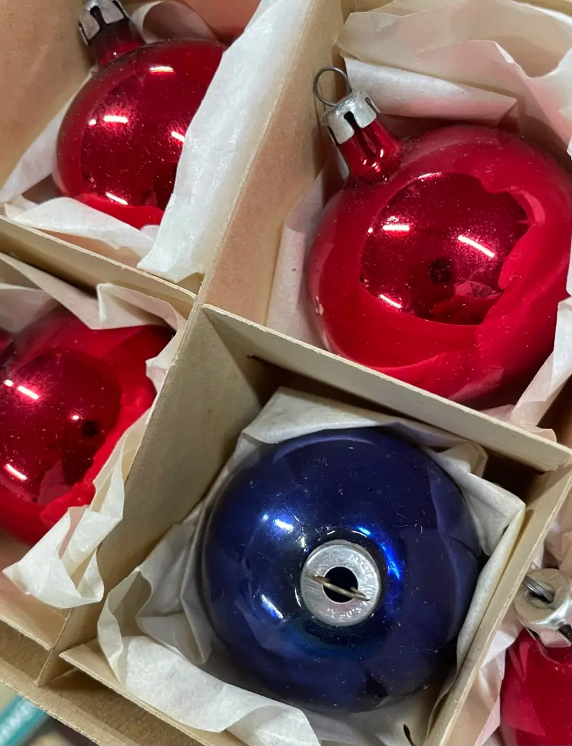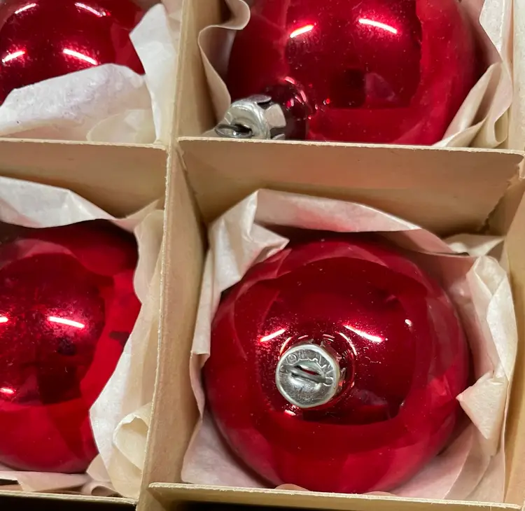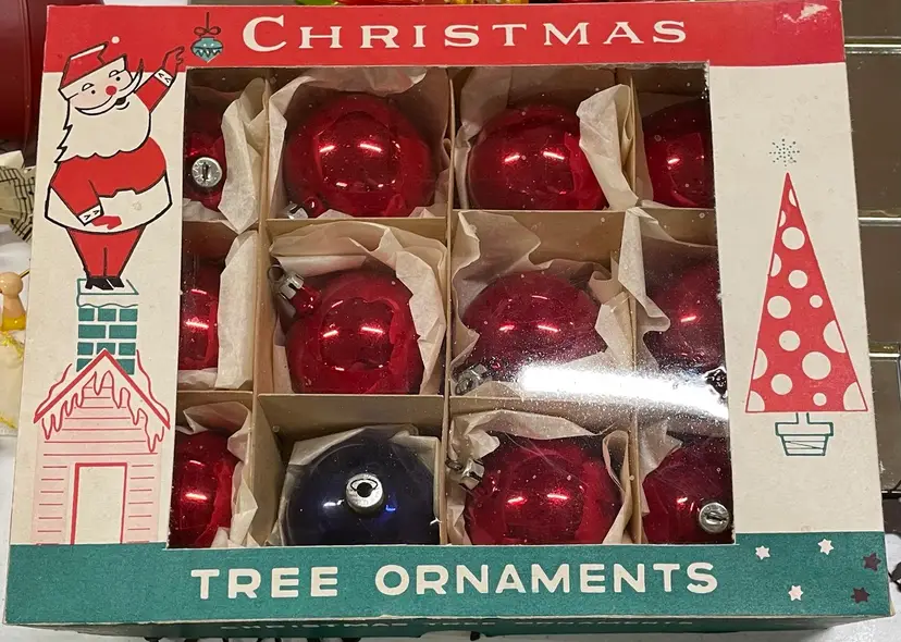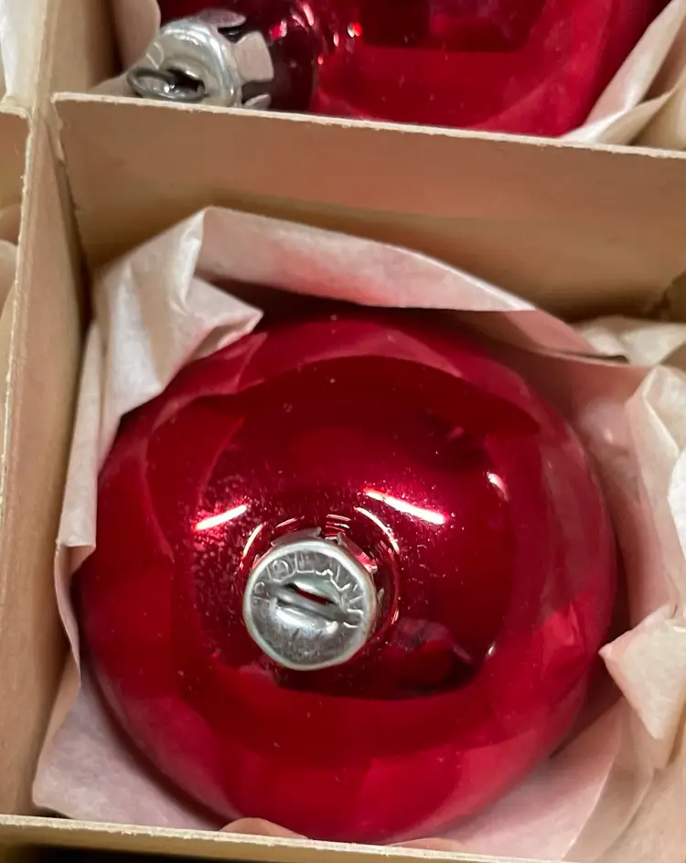 Vintage set of 11 red ornaments from Poland and 1 blue Made in the USA ornament. All in very good condition.