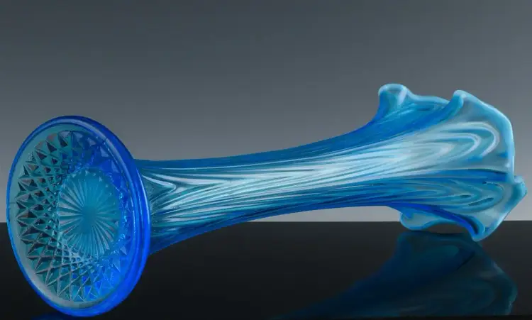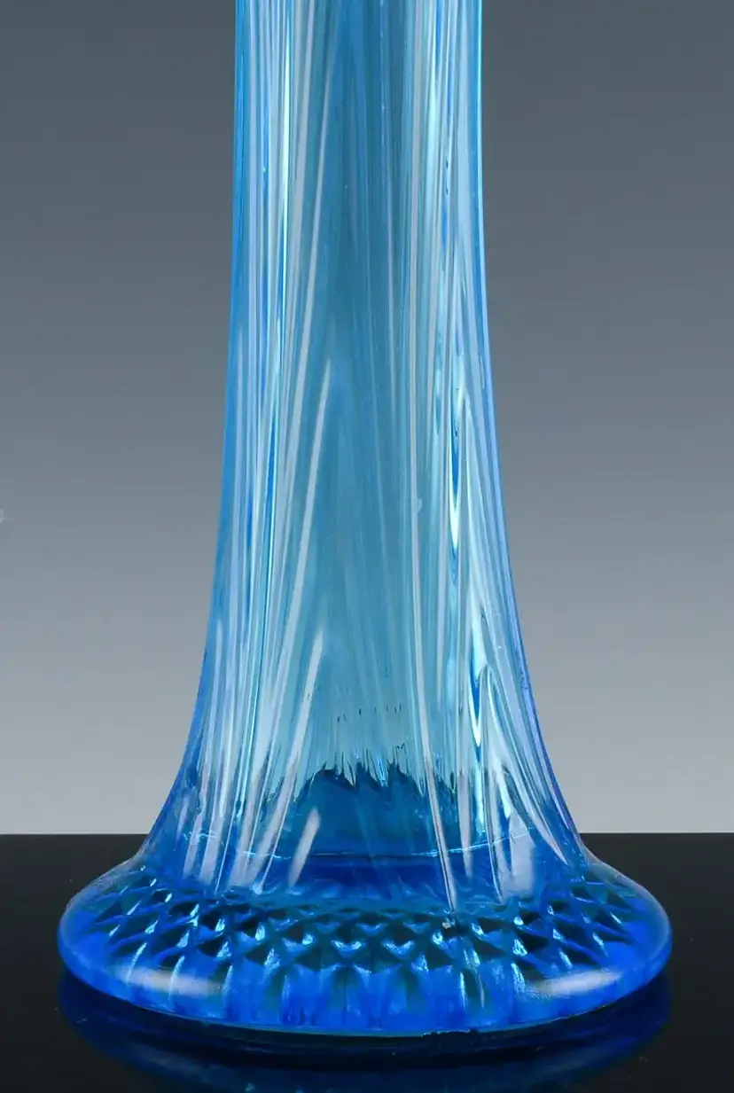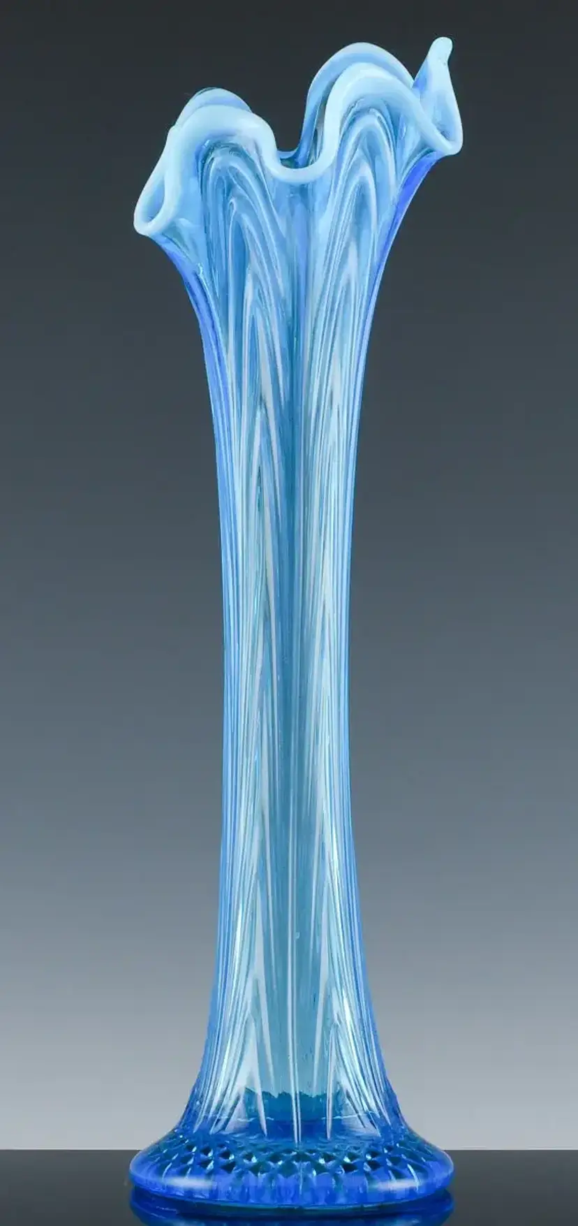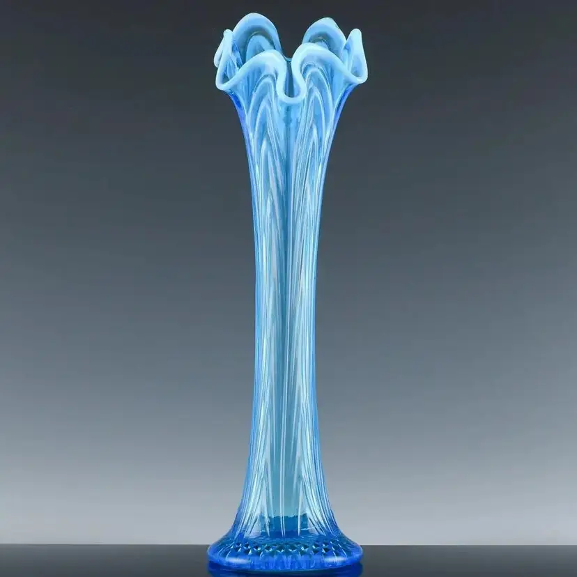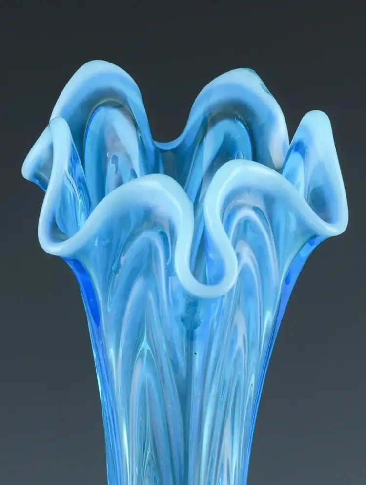 Presented for your consideration is a Fenton Art Glass Swung Vase. This is a very fine example, being Vintage in age and having some very superb colors. The blue and white Opalescent design is very eye catching and hard to find. This example is made by Fenton, well known for their excellent and collectible designs of glass. Swung vases are super hot right now and this rare example is an excellent addition to any collection or would make an outstanding gift to someone dear to you. They just don't make stuff like this nowadays.