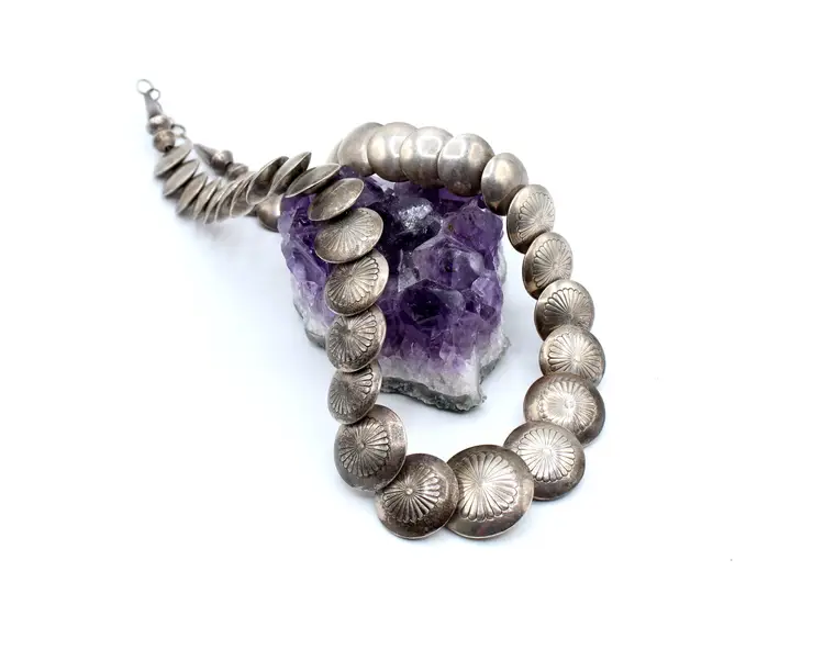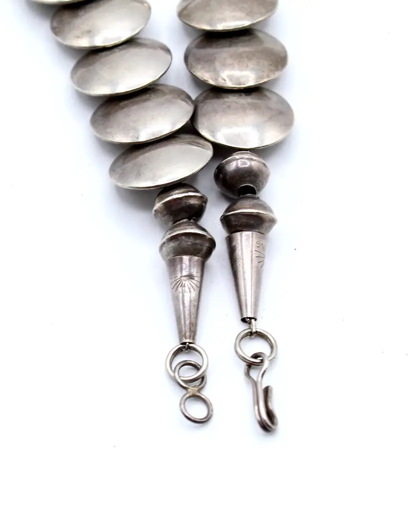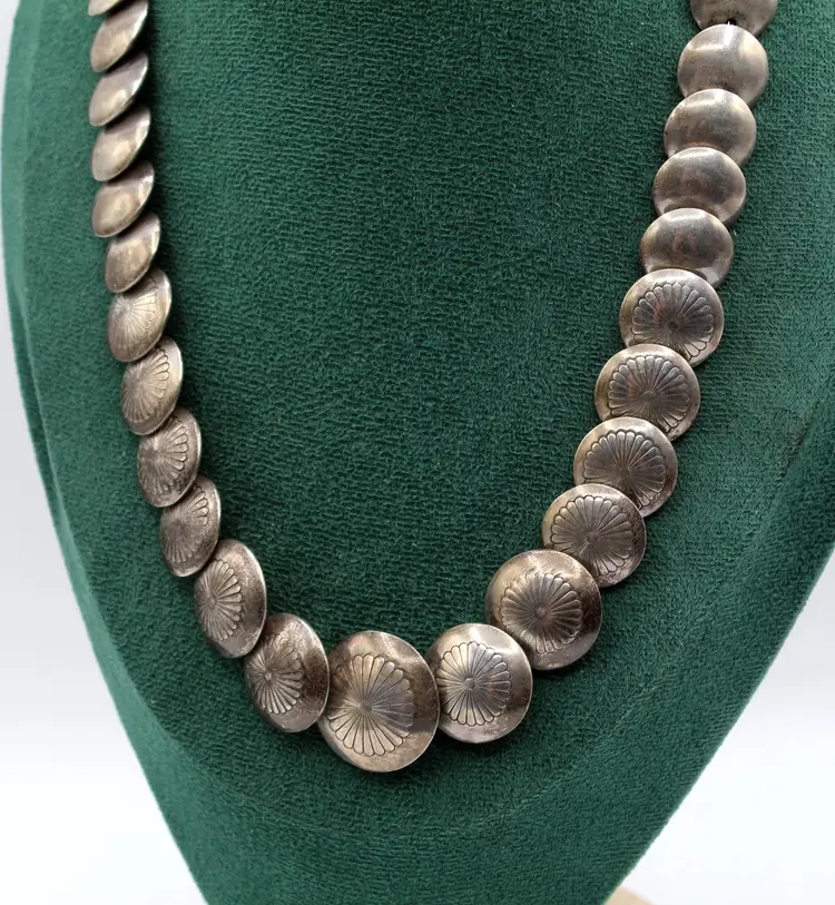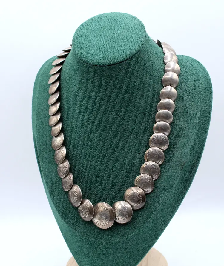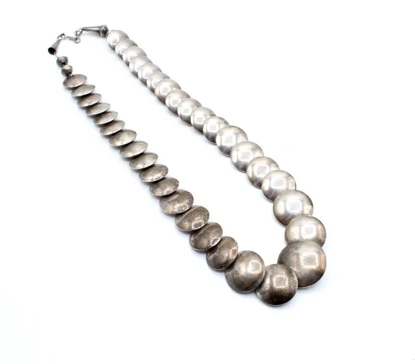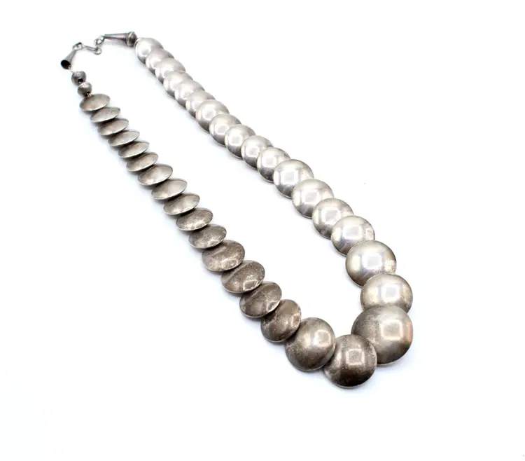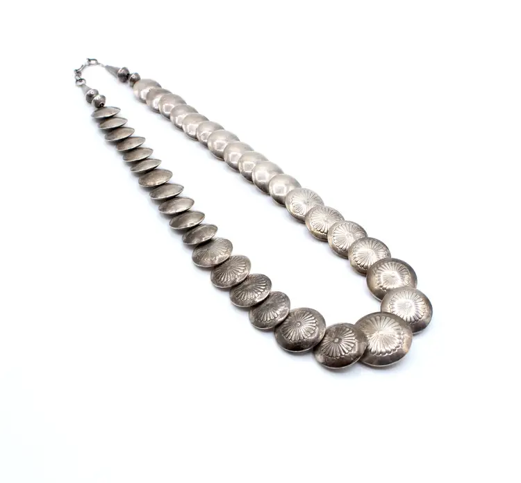 Fantastic unsigned hand stamped design graduated beads strung on a chain. Finished with sterling findings and hook closure. Beads measure 15.59mm-24.94mm.
