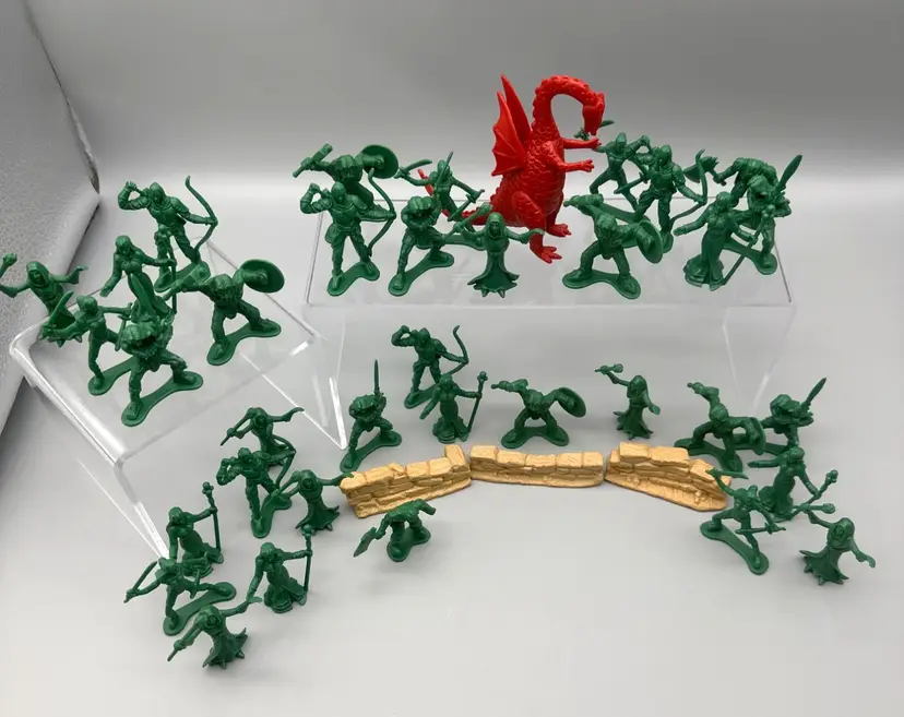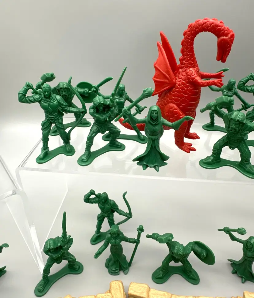 Embark on an epic tabletop adventure with this enchanting set of green warriors, a fierce red dragon, and golden faux stone walls. These finely detailed figurines bring legendary battles to life, inspiring tales of valor, mystique, and mythical triumphs. Perfect for imaginative play or as a nostalgic collection.