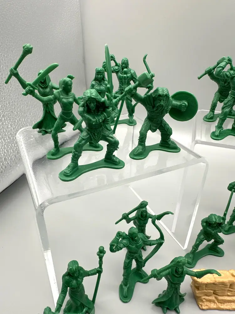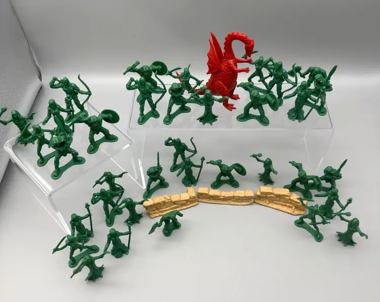 • Includes detailed figurines • Features green warriors & red dragon • Golden Faux stone wall accessories • Crafted in durable plastic • Perfect for play or display-Total of 39 Pieces