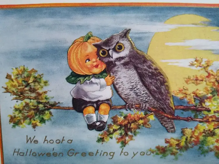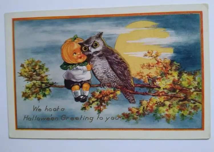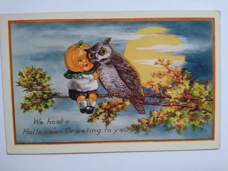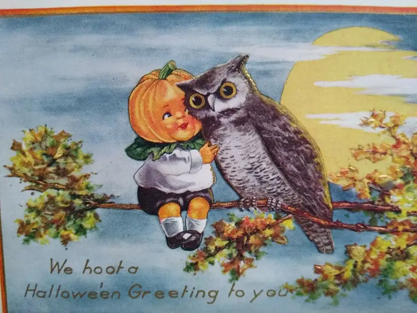Antique non posted vintage original Halloween postcard. Features a pumpkin head boy sitting in a tree with owl. Embossed graphics. Clean condition with writing on back and light corner/edge wear. See photos. Stock #186.