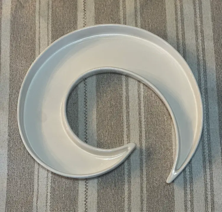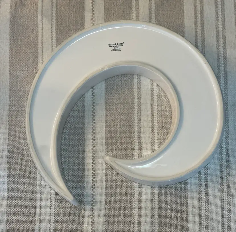 The Faria & Bento White Ceramic Crescent Swirl Shaped Serving Dish is a medium-sized, round ceramic tray handcrafted in Poland. It features a glossy white finish with a swirl pattern, making it a stylish and versatile piece for all occasions. The 11.5-inch length and 1.5-inch width make it perfect for serving a variety of dishes in your kitchen or dining room, such as olives, cheese, fruit. This original serving dish from Faria & Bento is a unique addition to your dinnerware collection. No chips or cracks like new.