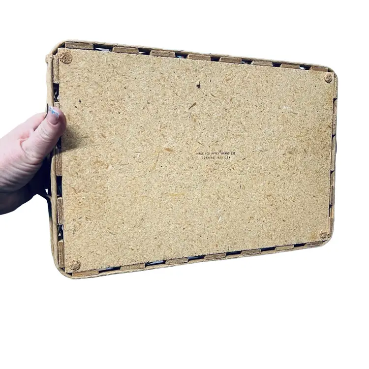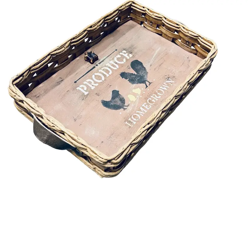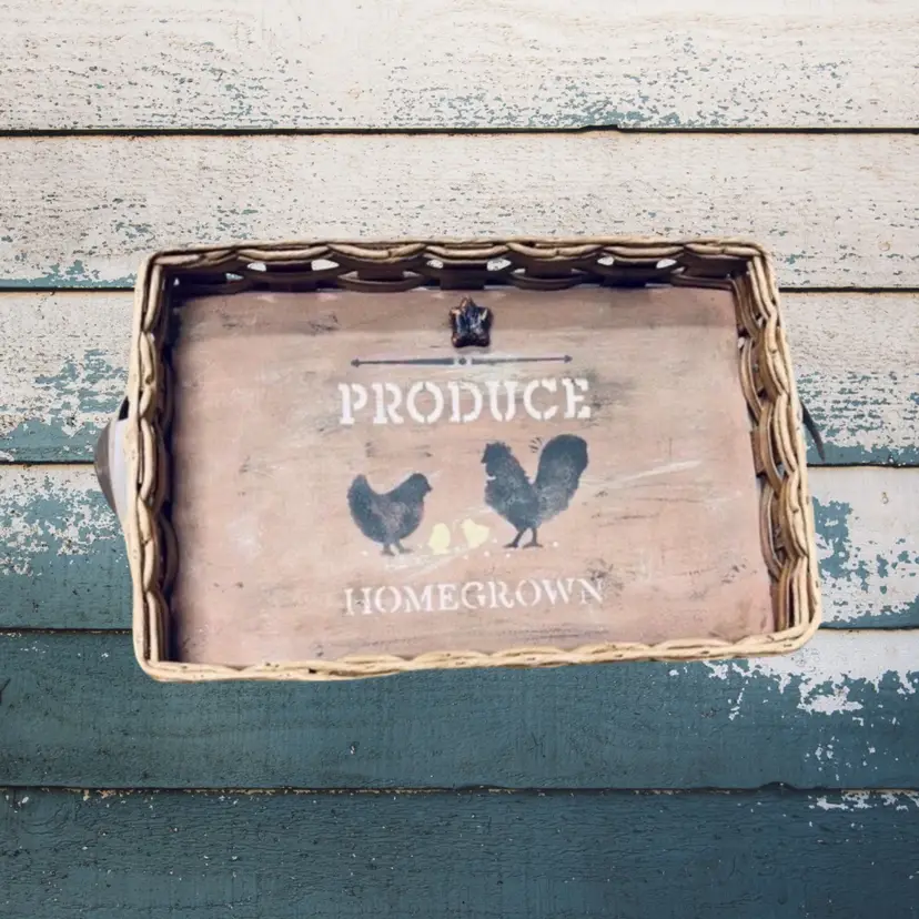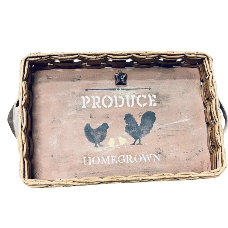 Vintage tray and up cycled by me! Hand painted and sealed Has a particle board bottom that was originally sold by Pyrex/ Corning I added some farmhouse charm to this adorable tray. Has leather handles on the sides. Measures approximately 14.5” long 9.5 “ wide