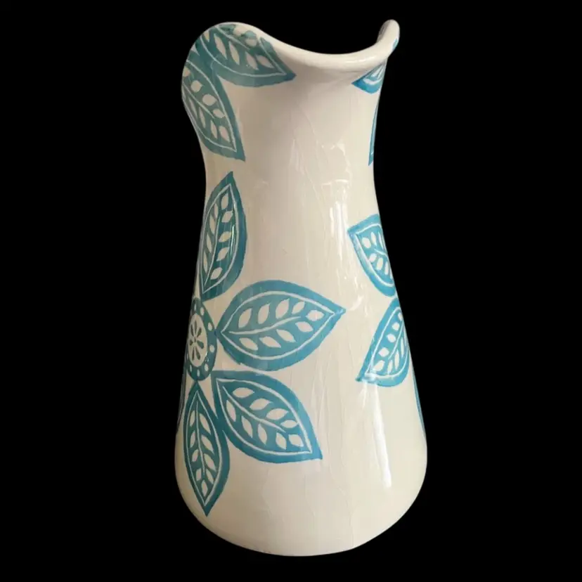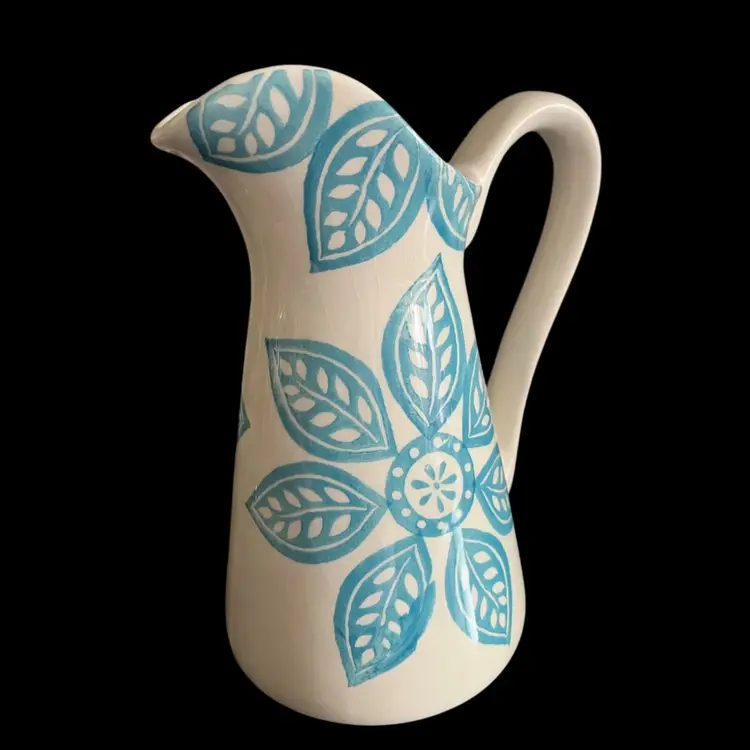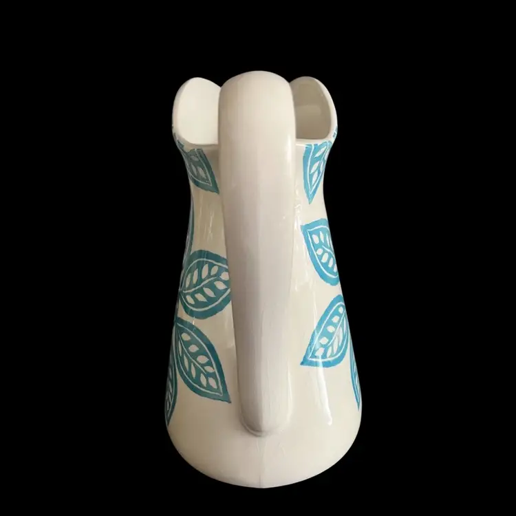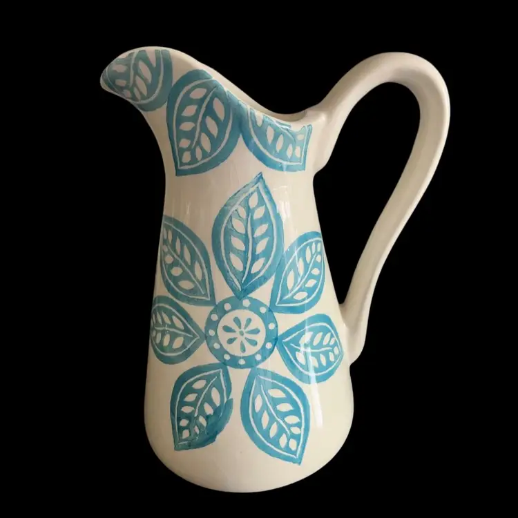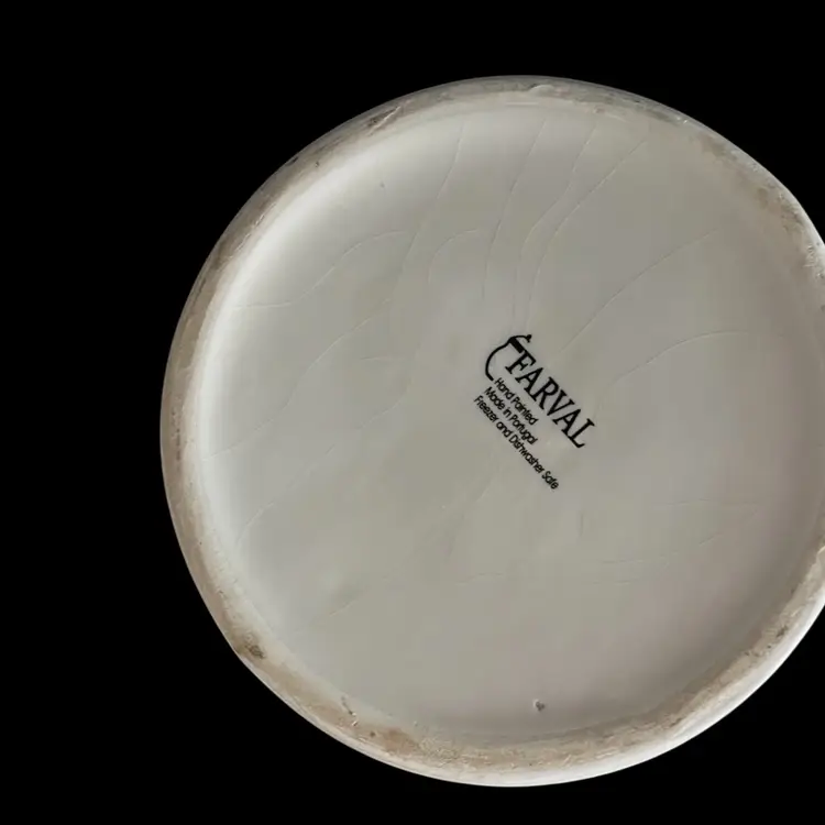 This pitcher just makes you smile! Hand Painted in Portugal the Pitcher measures 11.5” high x 9” Wide handle to spout x 7” Deep. It’s in great condition- no chips or cracks. Light crazing