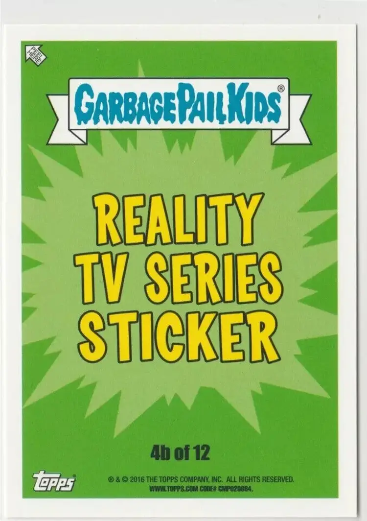 Related ID: overourheadz Card Size: Standard Autographed: No Set: Garbage Pail Kids - Prime Slime Trashy TV Subset: Reality TV Series Sticker Store ID: American Pop Cult Year Manufactured: 2016 Material: Card Stock Franchise: Garbage Pail Kids Original/Licensed Reprint: Original Vintage: No Series: 2016 Prime Slime Trashy TV Type: Non-Sport Trading Card Language: English Mononym: overourheads Manufacturer: Topps Features: Base Set, Sticker Genre: Comedy, Parody, Satire, TV & Movies Card Type: trading card sticker Country/Region of Manufacture: United States