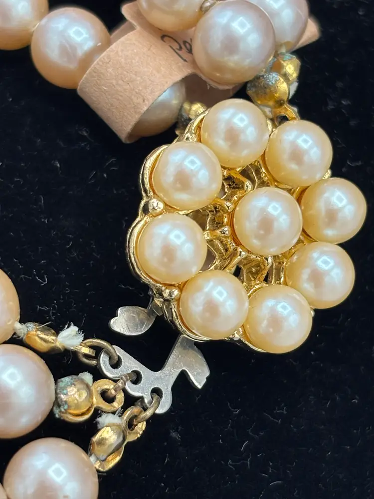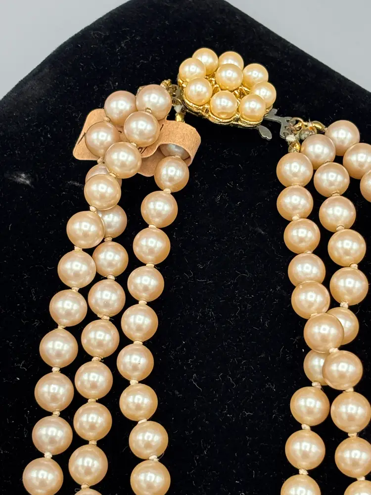 Faux Pearl 3 strand choker that has an amazing beige tone color. This has an easy clasp that anyone can get off and on easily. This measures 14 inches.