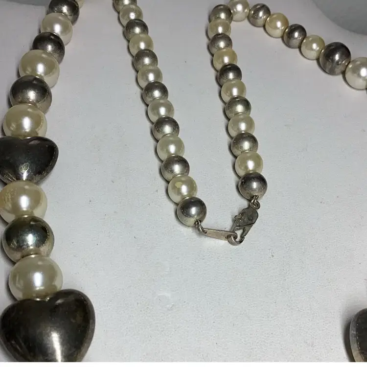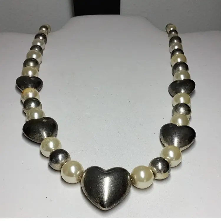 Faux Pearl & Silvertone Hearts Beads On Wire 22” - Signed Korea