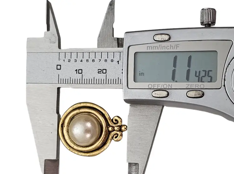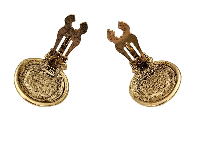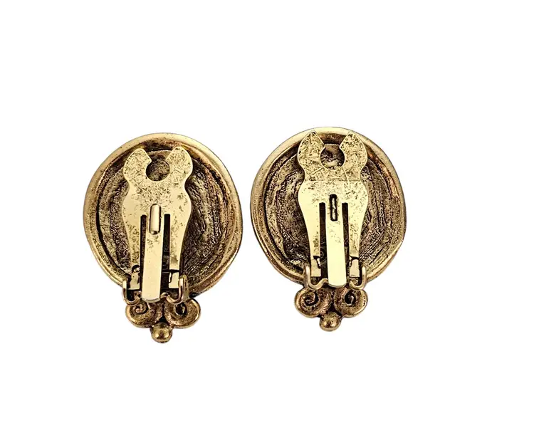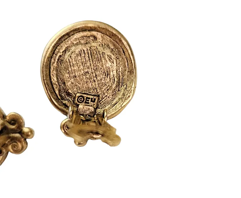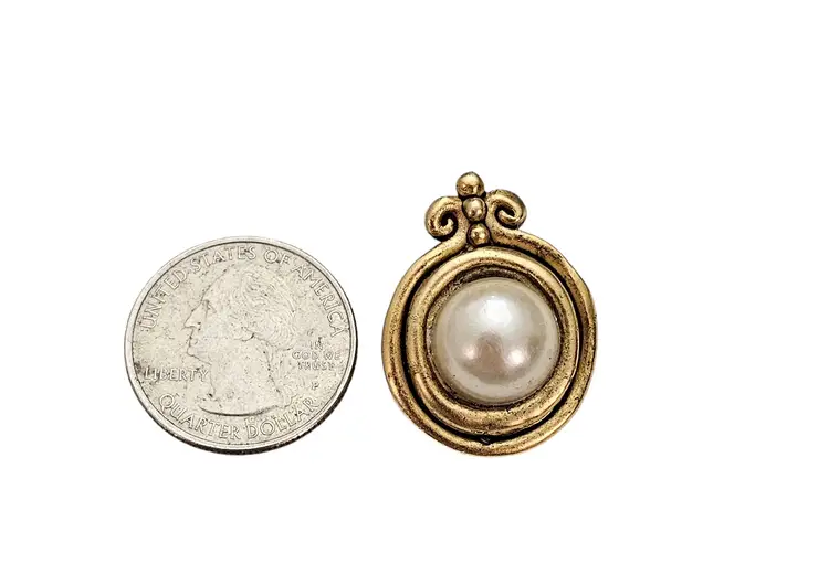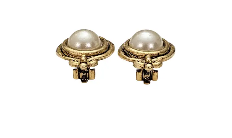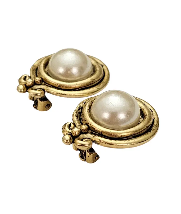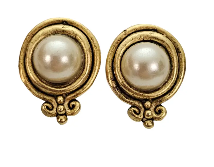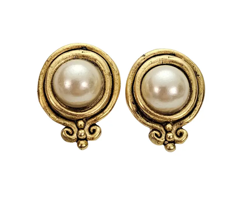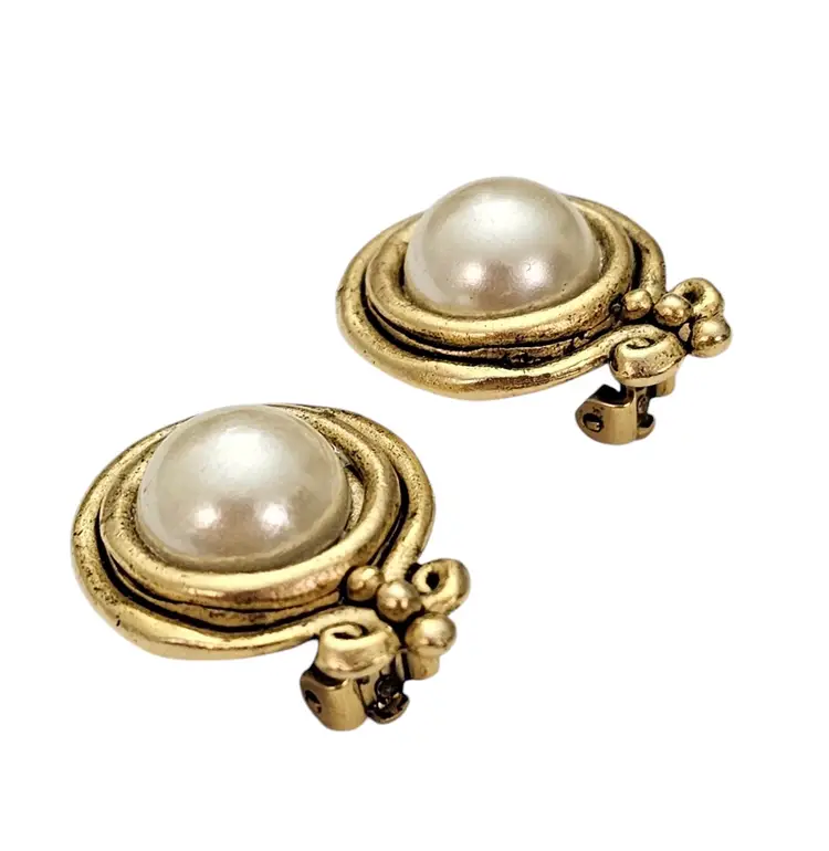 These classic and elegant clip-on earrings are a lovely gift for yourself or your loved ones. A great everyday accessory for those who love to wear gold-tone jewelry. These Designer round-shape earrings are crafted from a radiant gold tone base with intricate swirl and curved frame design encircling a lustrous white faux pearl, it accentuates the overall classic style and further adds an element of opulence. Each earring measures approximately 1.1 inches in diameter and is signed by the designer's marking on the reverse. Both earrings have paddle back clips that work like a hinge to open and fasten them to the ear lobes. The perfect pair of earrings for those who don't have their ears pierced. This pair will always be on trend and make you the center of attention.