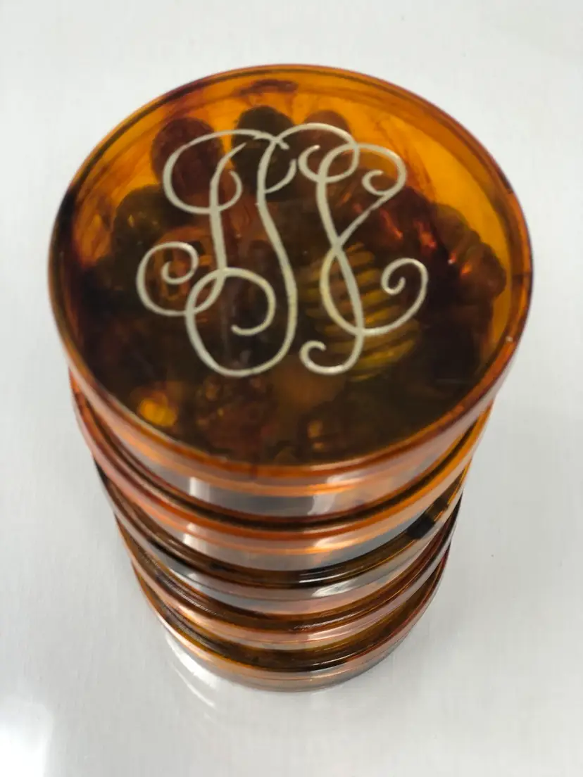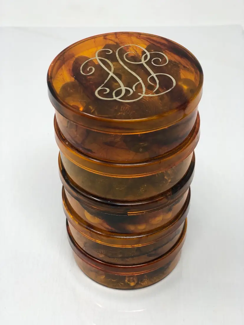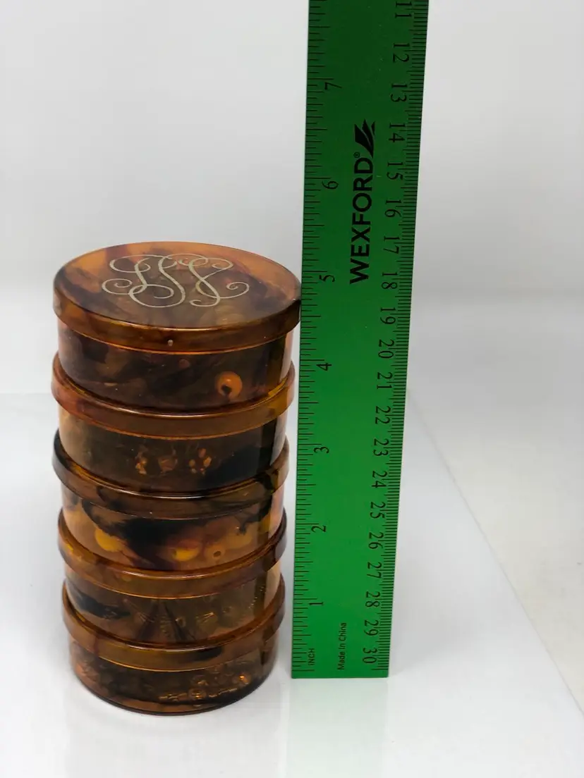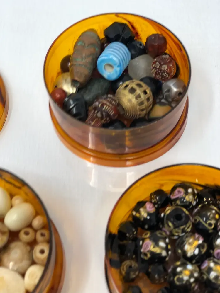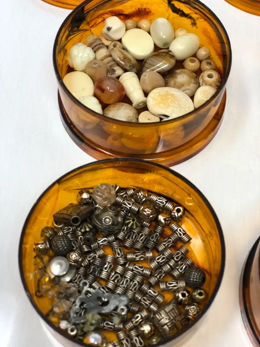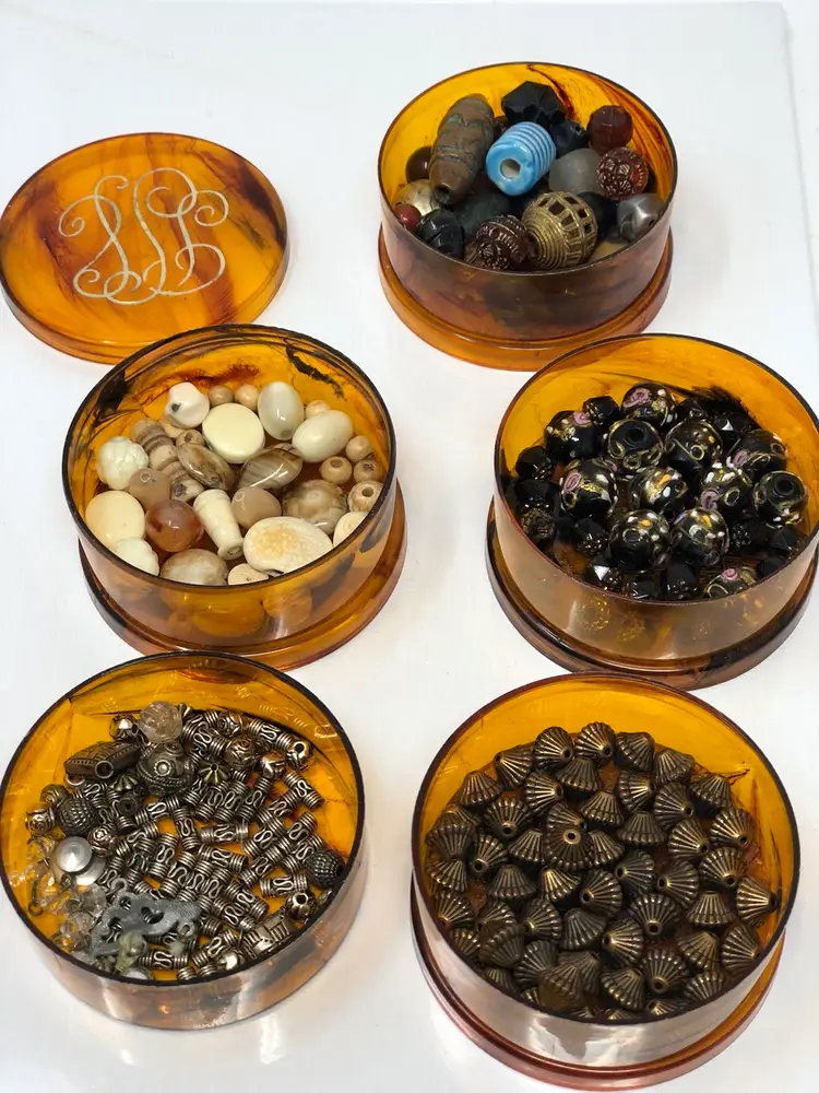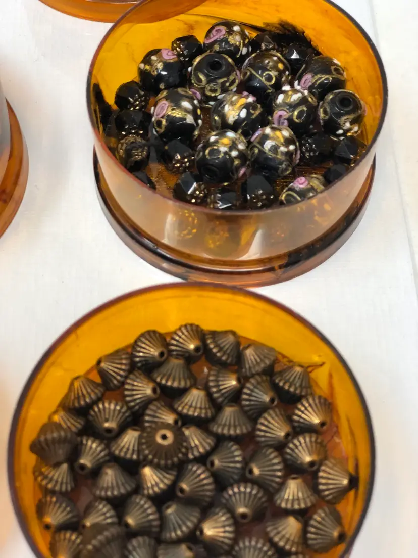 5 stacking 2 1/2" plastic containers in pure vintage style! Each has a collection of craft beads, from metal to glass. No chips or cracks, but there are some signs of age.