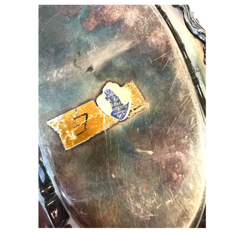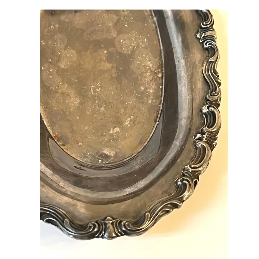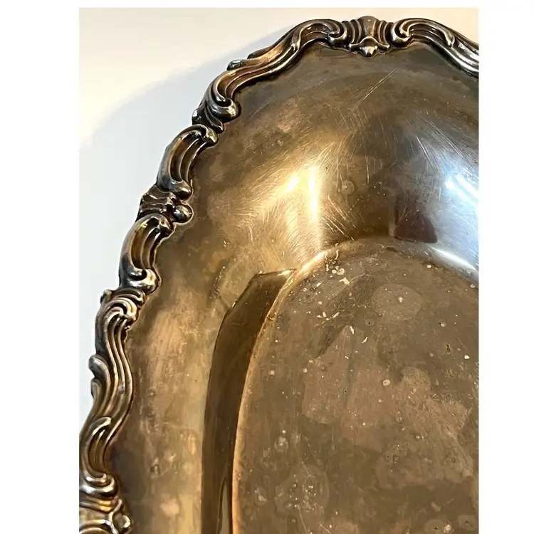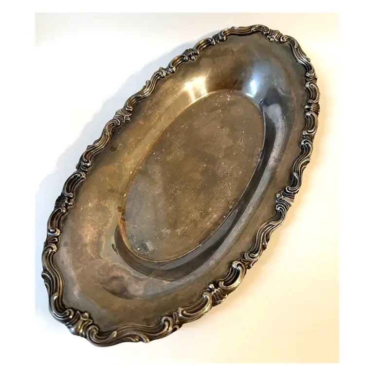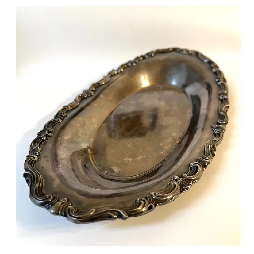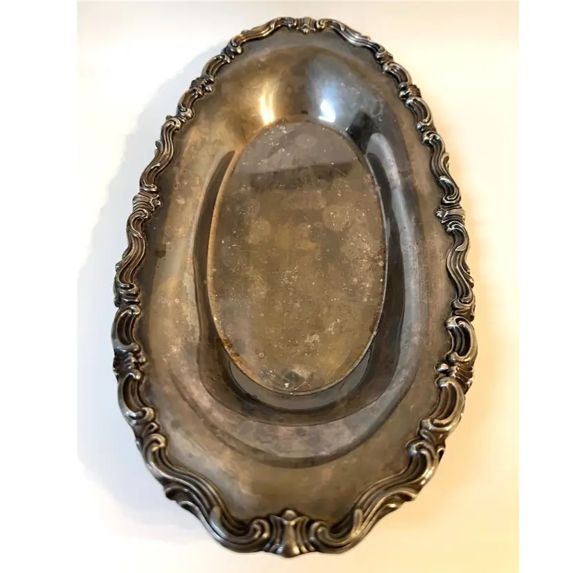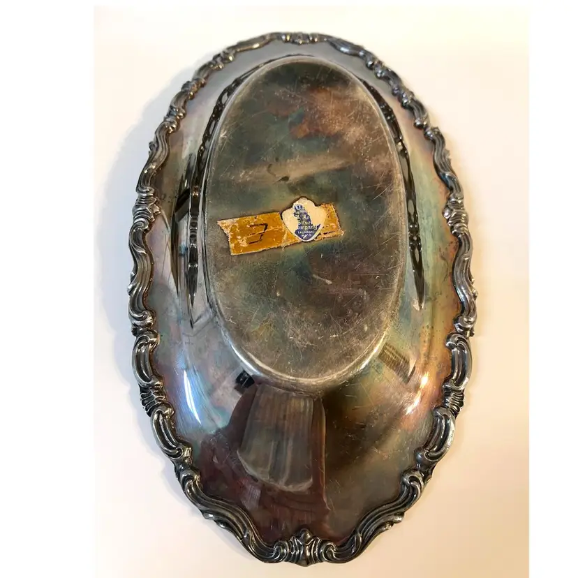 F.B. Rogers MCM Silver Co Silver Plated Oval Serving Tray Dish 13x7 in Taunton MA USA. Visible scratches, patina.