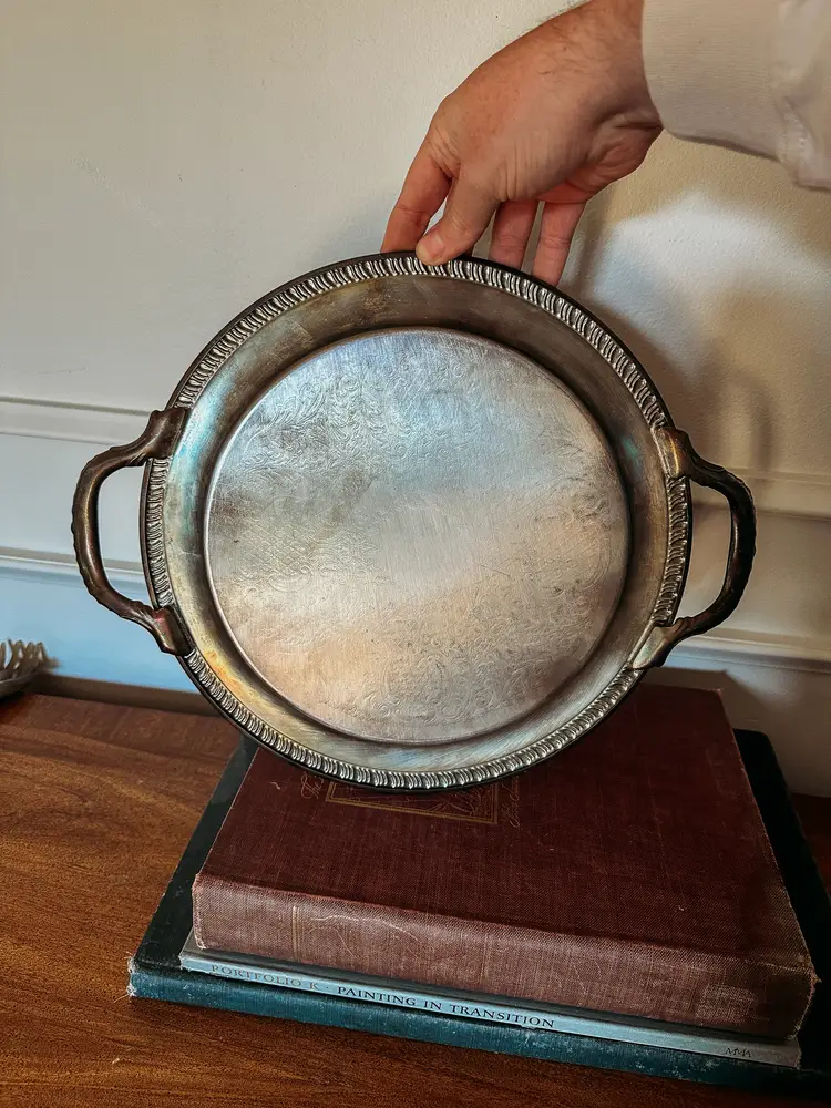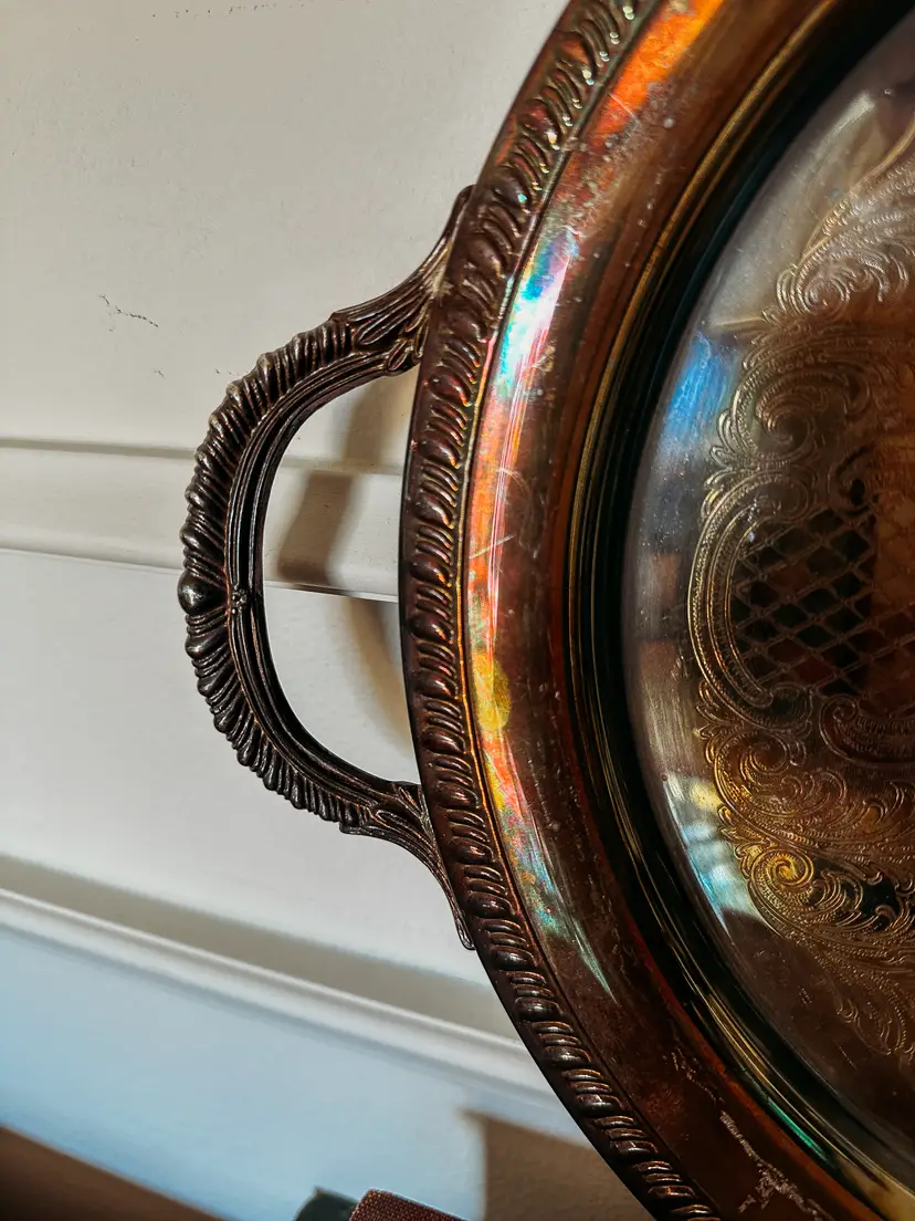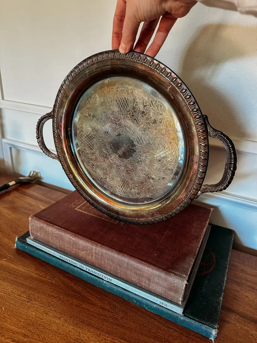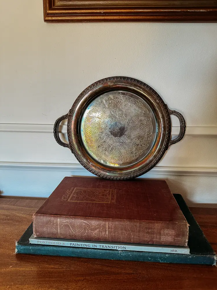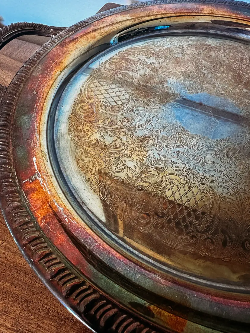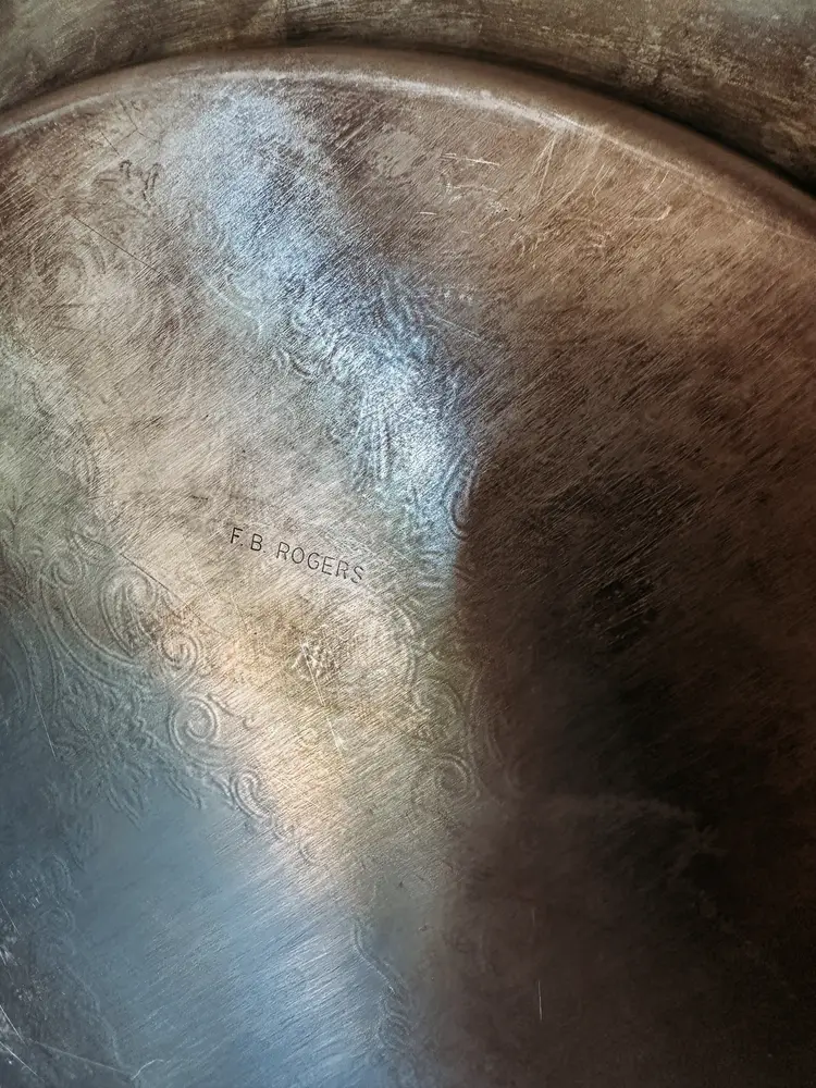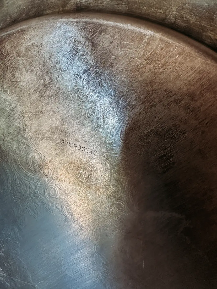 Gorgeous silver tray from FB Rogers with a stunning "oil slick" tarnish. Heavy and sturdy. Leave as is or polish. 15" x 12" x 1" (Width x Depth x Height)