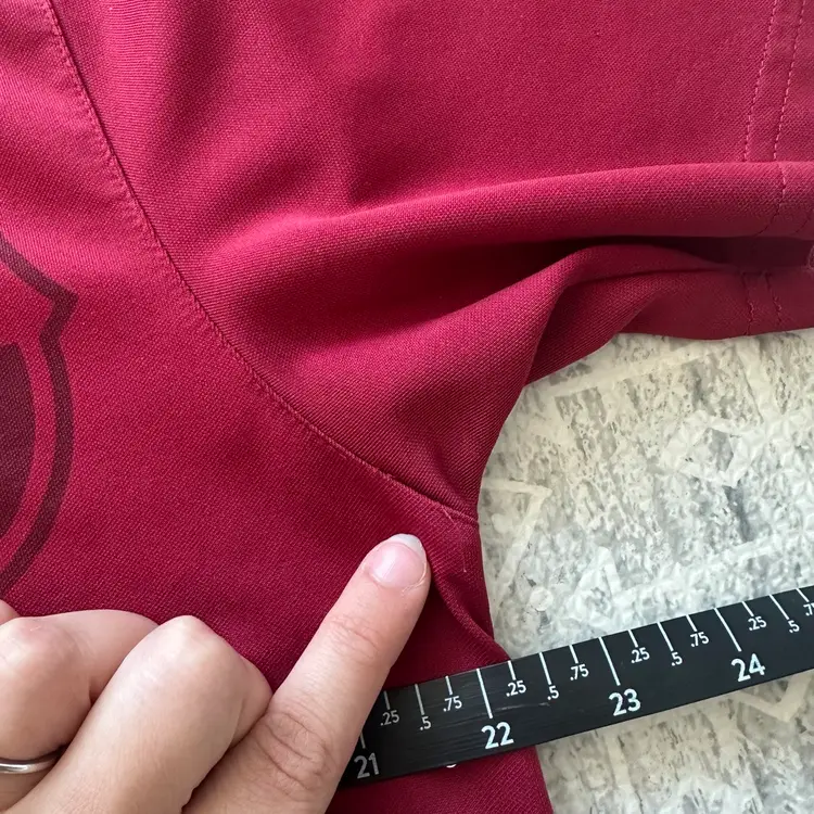 preowned has minor flaws, some runs shown on the front of tee and fading to the shoulder patch