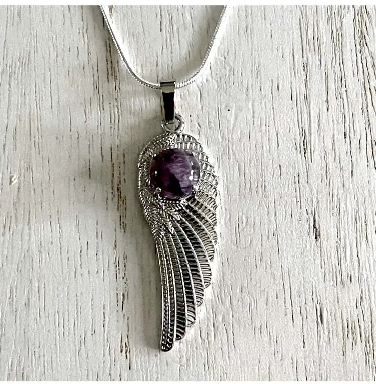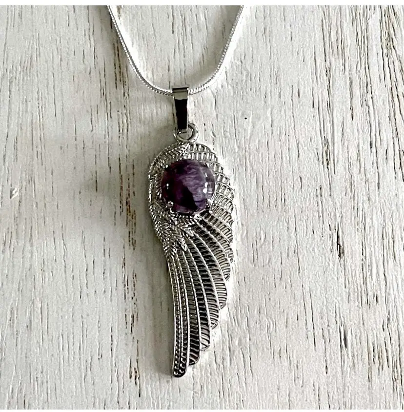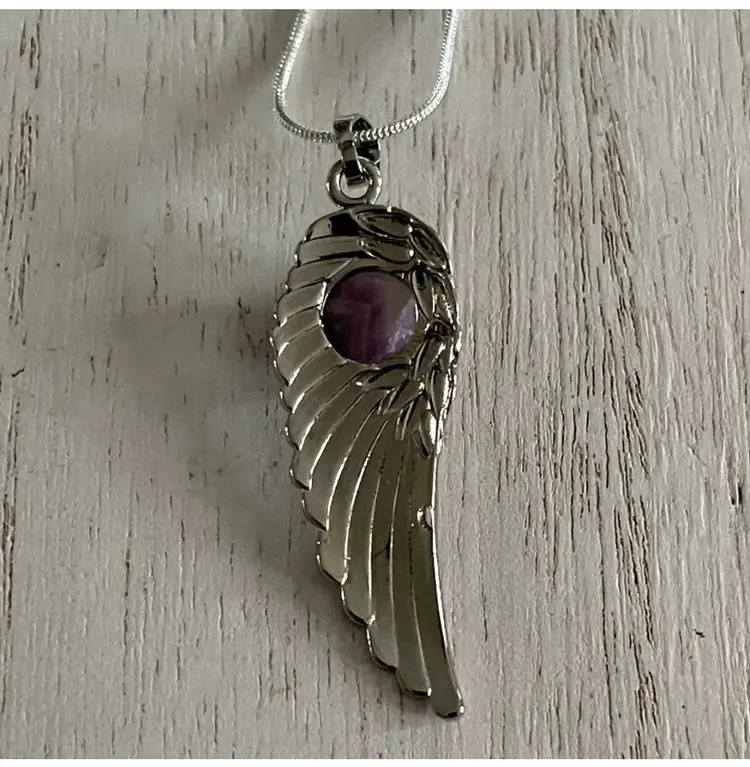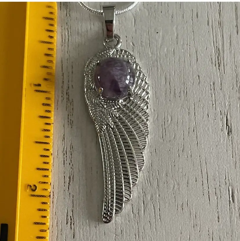 Angel wing/feather pendant with polished amethyst cabochon Silver plated Approximately 2 1/4" Comes on a silver plated chain approximately 22"