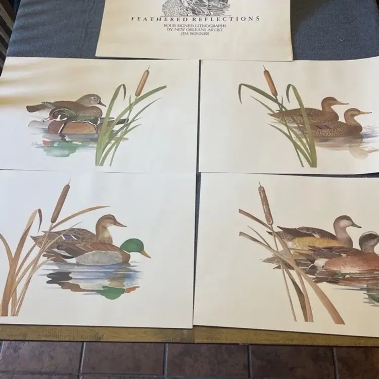 Youre receiving four of these signed lithographs by New Orleans artist Jim Bonner they come in the case theyve never been framed. One is mallard ducks, one is wood, ducks, and the other two ducks. Im not quite sure of which one they are, but I have taken pictures.Each lithograph is signed by the artist and measures approximately 19 1/2 x 12 and three-quarter inches please ask any questions you may have and thank you for looking.