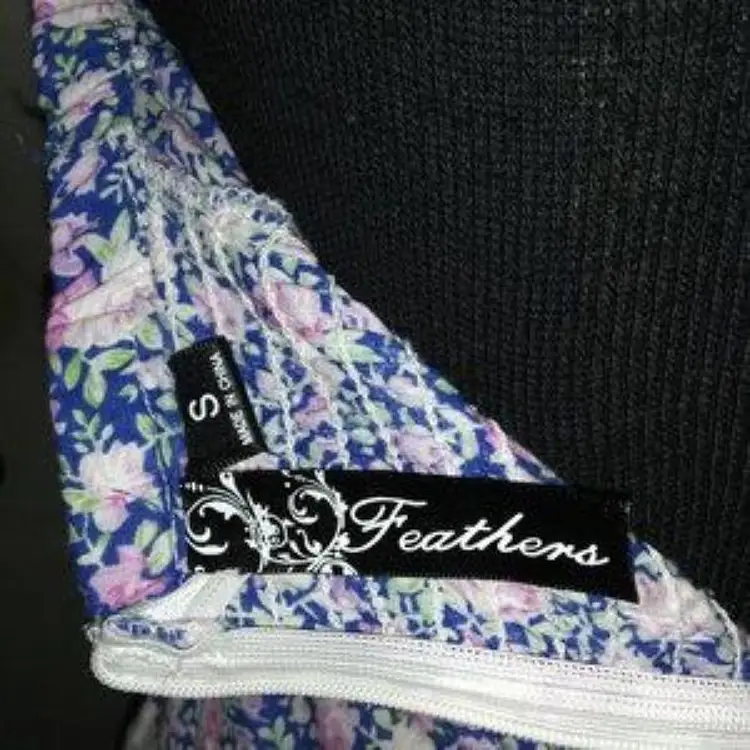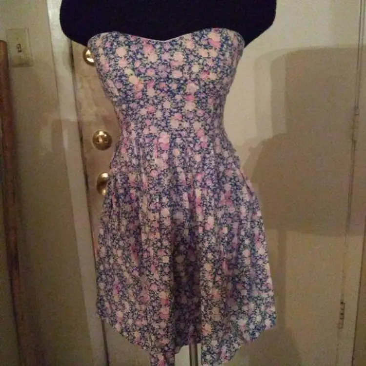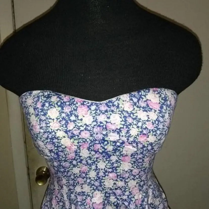 Feathers Navy Blue with Pink/Purple/Green Rose floral pattern strapless top. Gathered back that zips. Size: S (4-6) Pair with leggings or tights for a finished look.