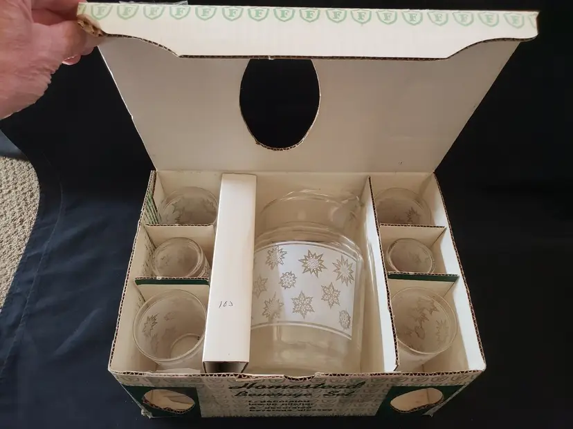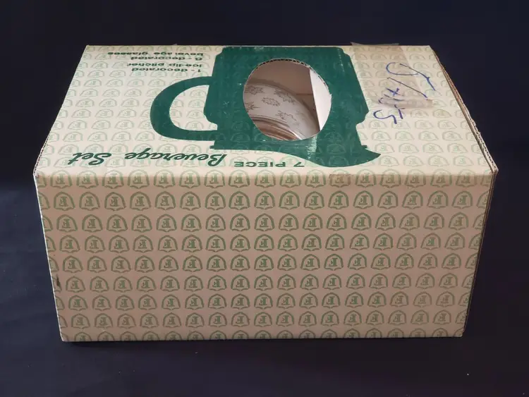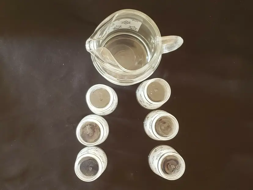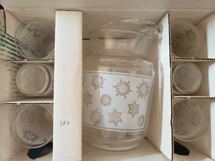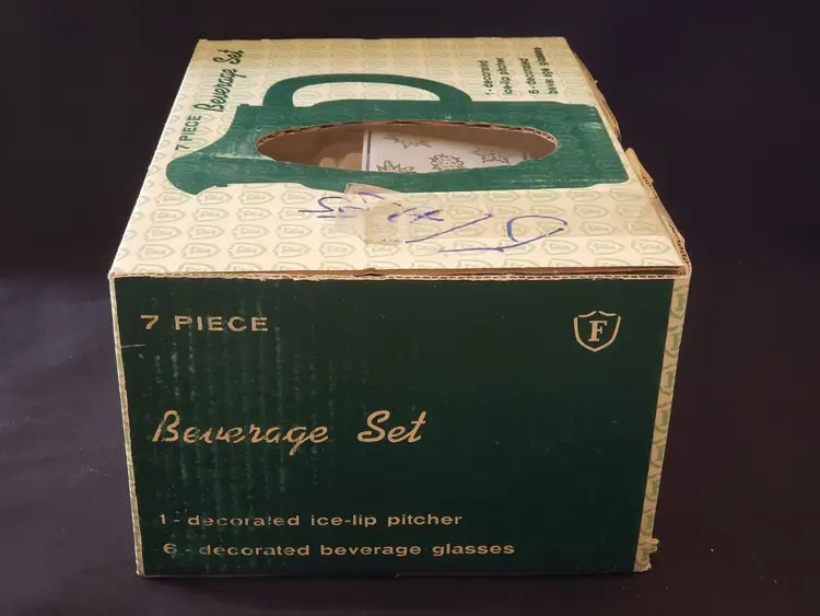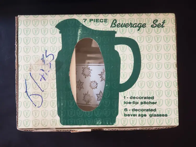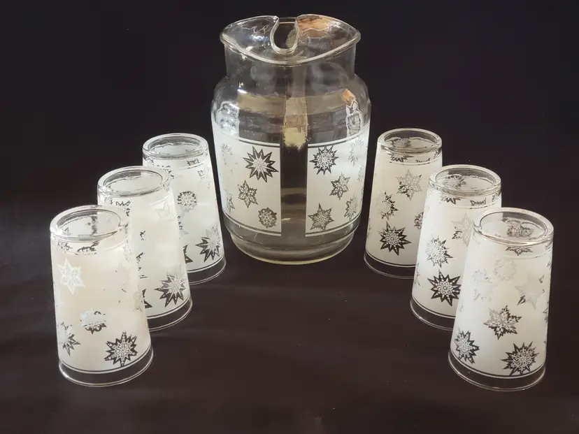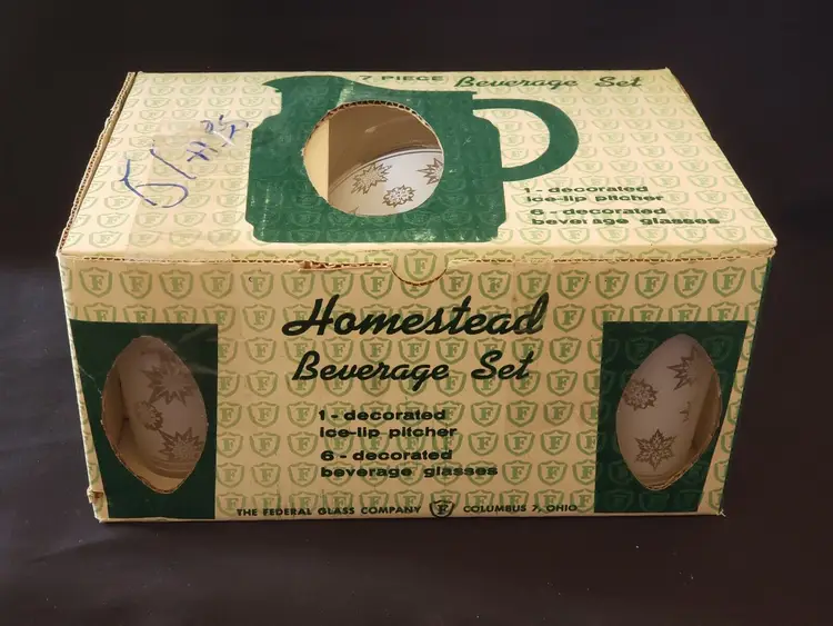 Occasion: All Occasions Type of Glass: Pressed Glass Color: Clear & White Material: Glass Vintage: Yes Brand: Federal Glass Type: Beverage Glasses & Pitcher Original/Licensed Reproduction: Original Style: Mid-Century Modern Original/Reproduction: Vintage Original Features: Decorative Production Style: Pressed Glass Country/Region of Manufacture: United States Product Line: Homestead