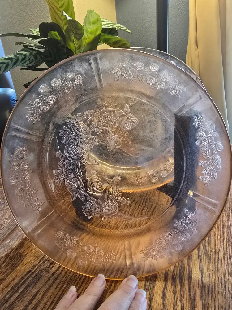 4 - 9" Federal Glass Sharon Cabbage Rose Pink Depression Plates. Vintage pieces originating from America in 1935. Wear and scratches can be seen in photos.