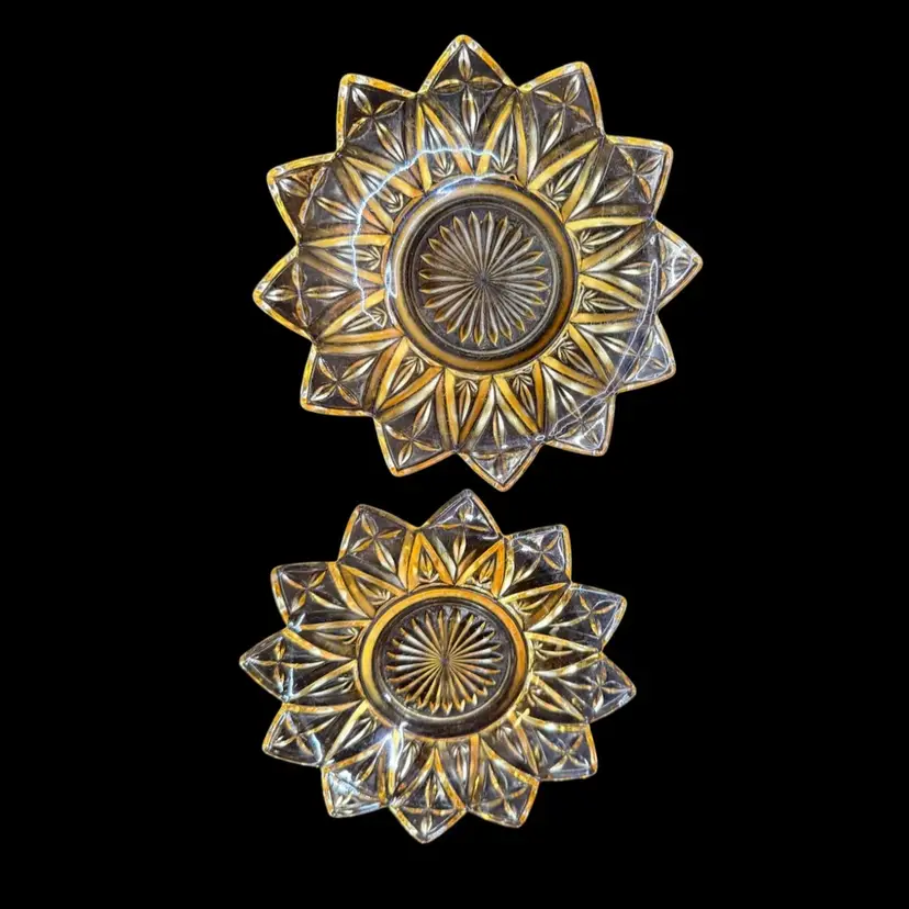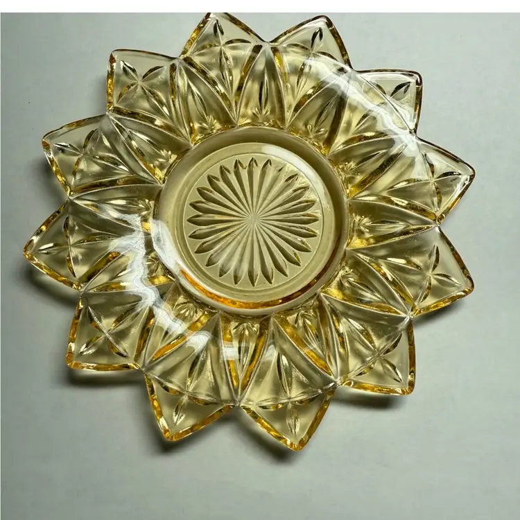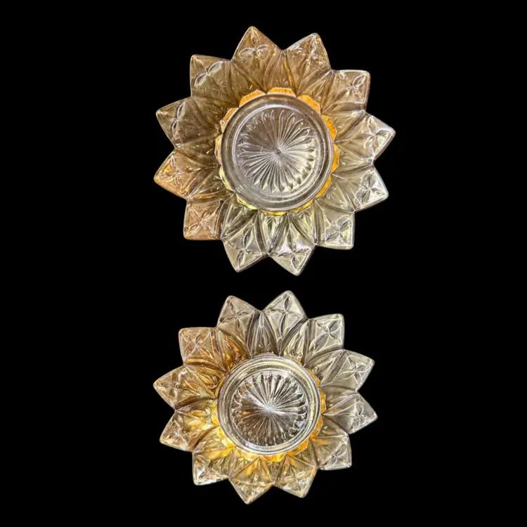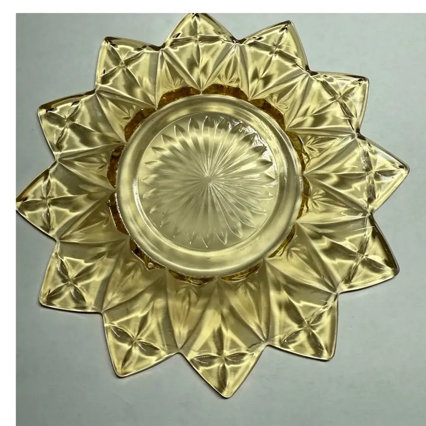 2 Vintage Federal amber yellow starburst sunflower dessert plates. Very good condition. 6 ½” across.