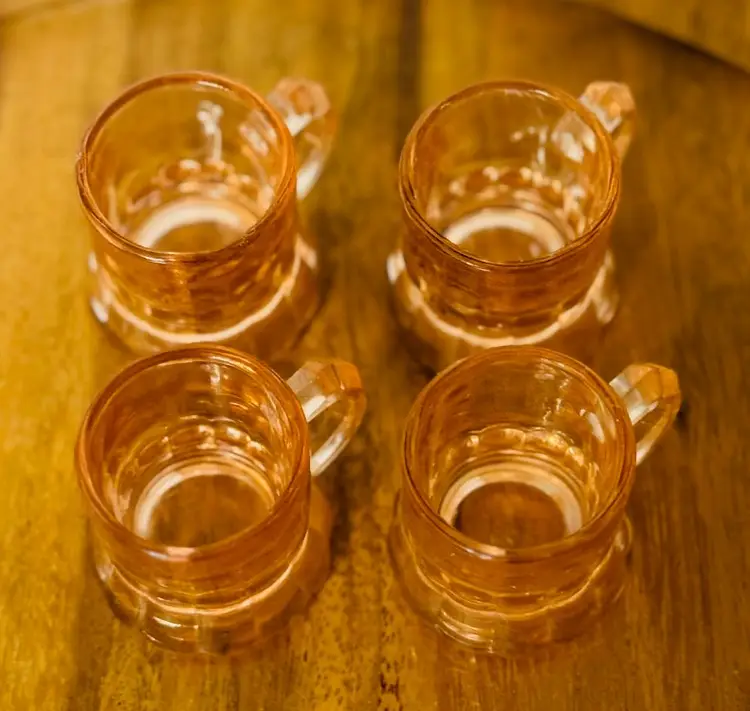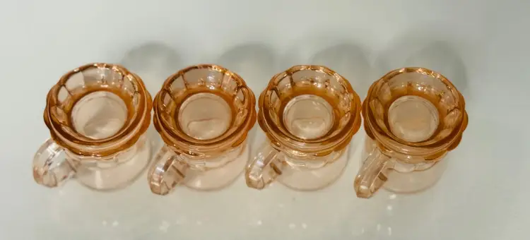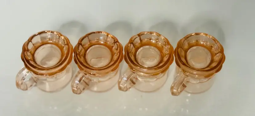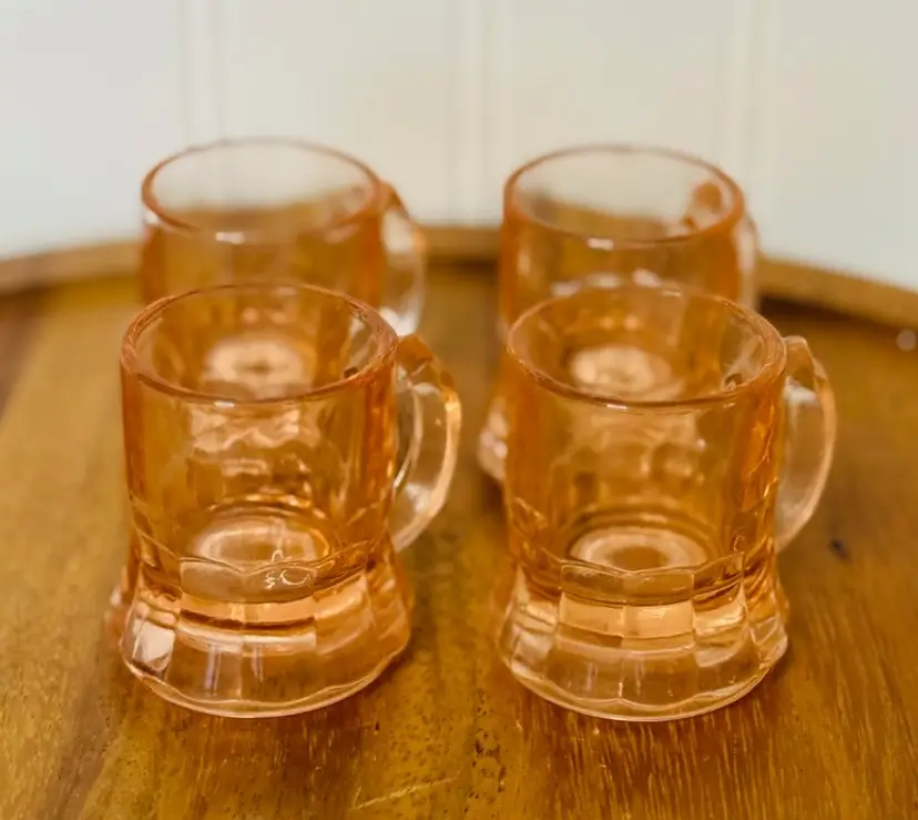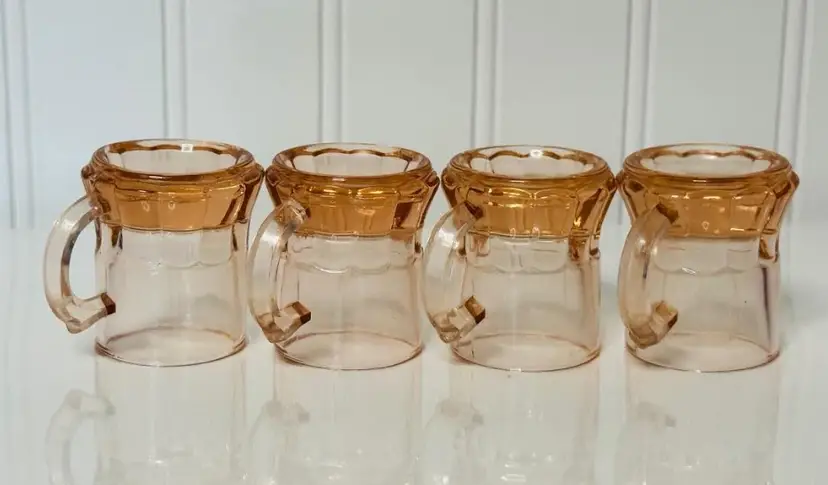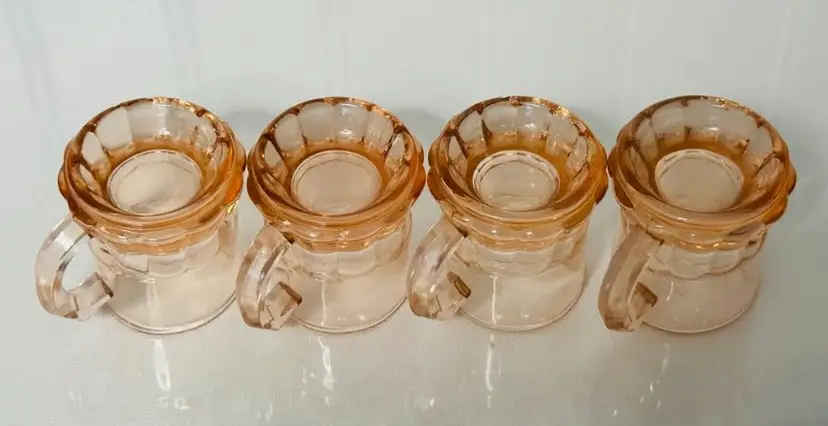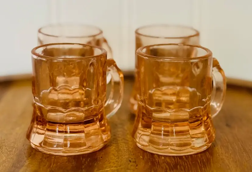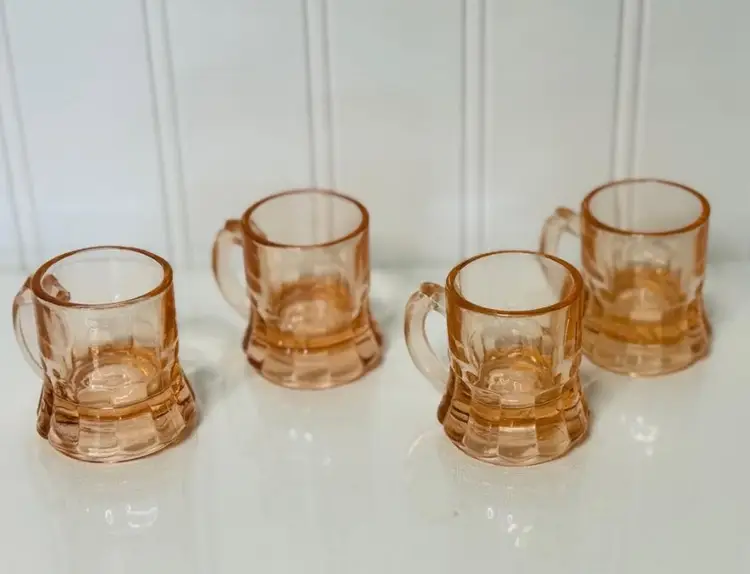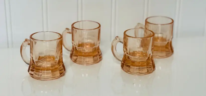 Add a touch of vintage charm to your collection with this beautiful set of 4 pink Depression glass mini mugs made by Federal Glass in the 1930s. These petite mugs are often used as shot glasses or child-sized play cups and feature the classic soft pink hue characteristic of Depression-era glassware. Details: • Set of 4 matching mini mugs • Manufacturer: Federal Glass Co. • Color: Pink • Material: Depression Glass • Approx. Size: 2.25” tall x 2” wide • Vintage 1930s These pieces are in good vintage condition with no cracks or repairs. They appear to be unused.