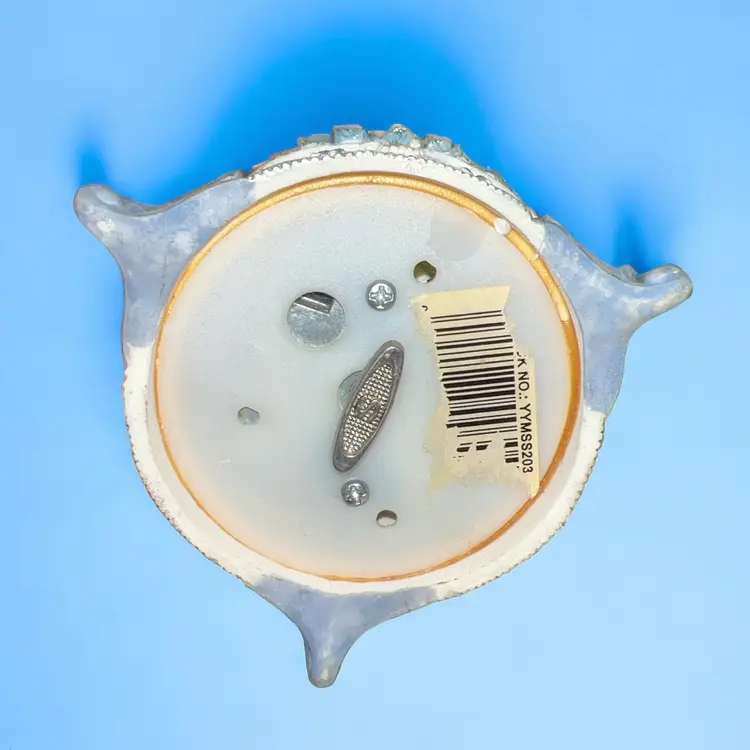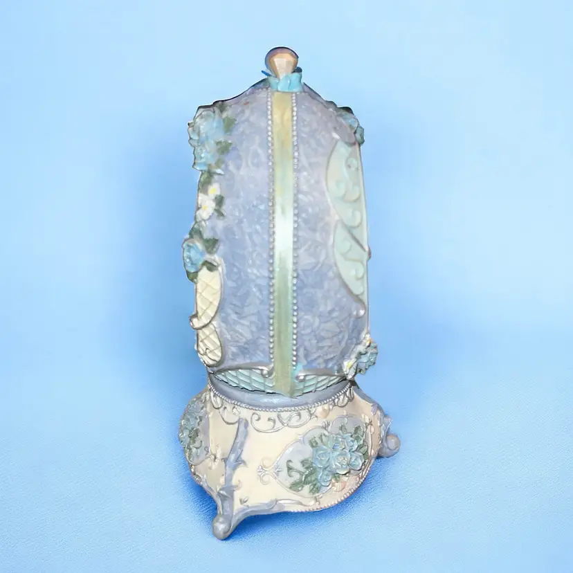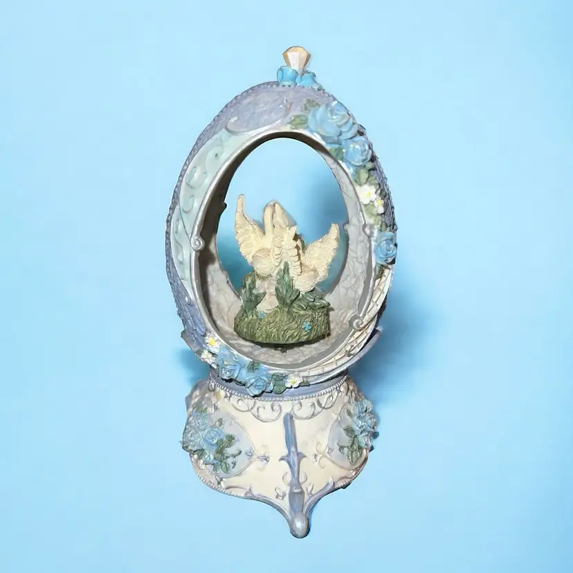This vintage musical piece features two swans in an egg-shaped case, playing the famous tune "Some Enchanted Evening". The swans elegantly turn in a circle as the music plays, creating a beautiful display piece. The primary material used is resin, with a lovely blue color and an Art Deco style, making it a great addition to any collection.