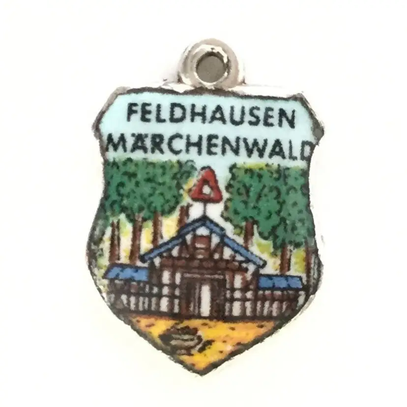 Feldhausen Marchenwald Germany - Vintage Enamel Souvenir Travel Shield Bracelet Charm - 800 Silver