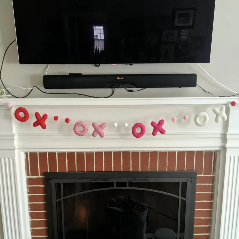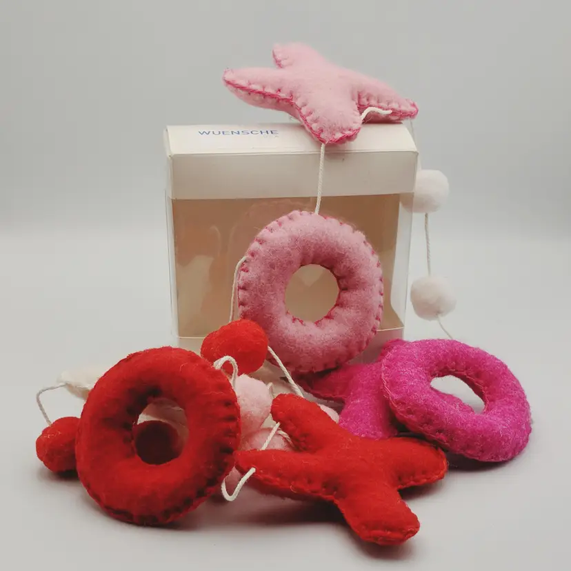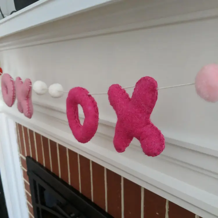 Felted Red Fushia and Pink Xs and Os and Pom Poms Garland 4-foot Valentine Decor