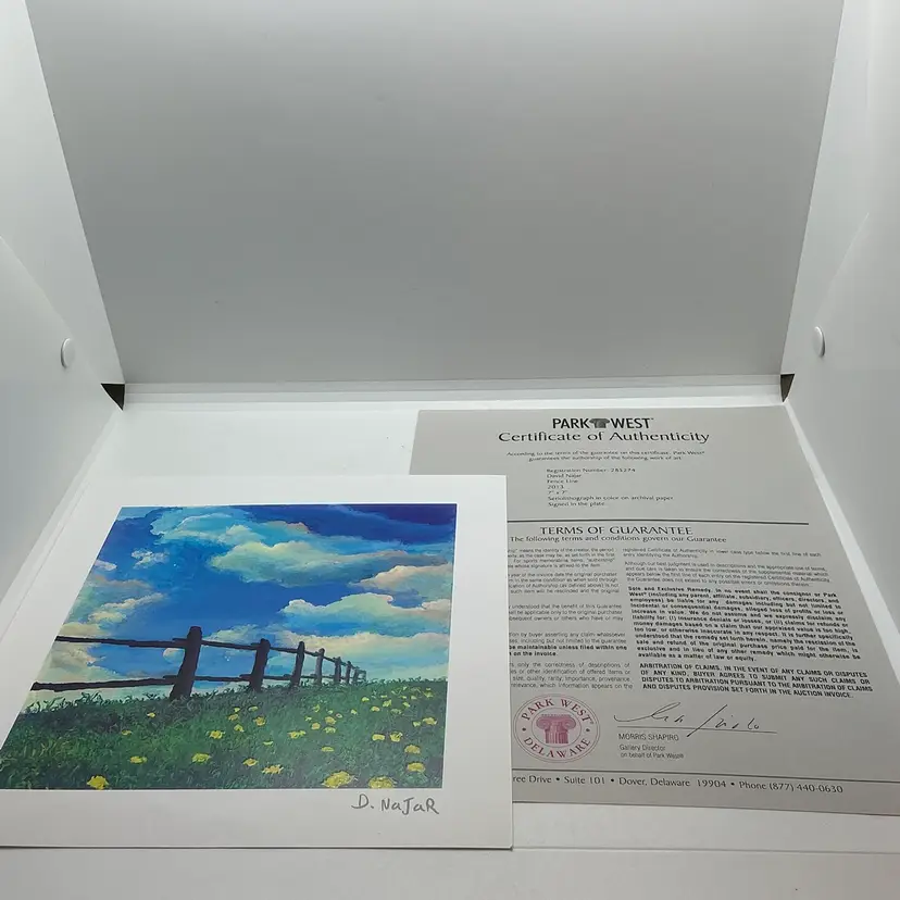 2013 seriolithograph by artist David Najar, measuring 7" x 7". This modern art piece features a multi-color landscape with a theme of gardens and seasons, making it a unique addition to any art collection. Unframed and signed by the artist, this open edition print is sure to stand out with its contemporary style and vibrant colors. Paper print with a COA makes it a valuable and sought-after item for art enthusiasts. From a non smoking home.