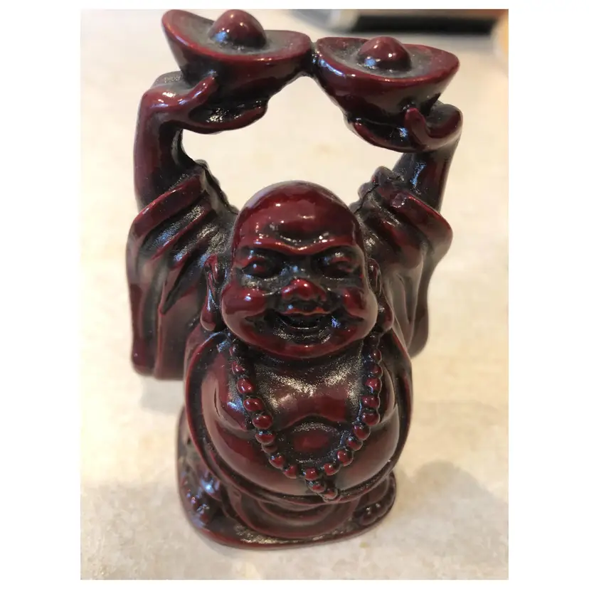 Feng Shui Laughing Buddha with gold ingots in each hand. Red Resin statue. 3 1/2" tall Assists in Wealth and Happiness.