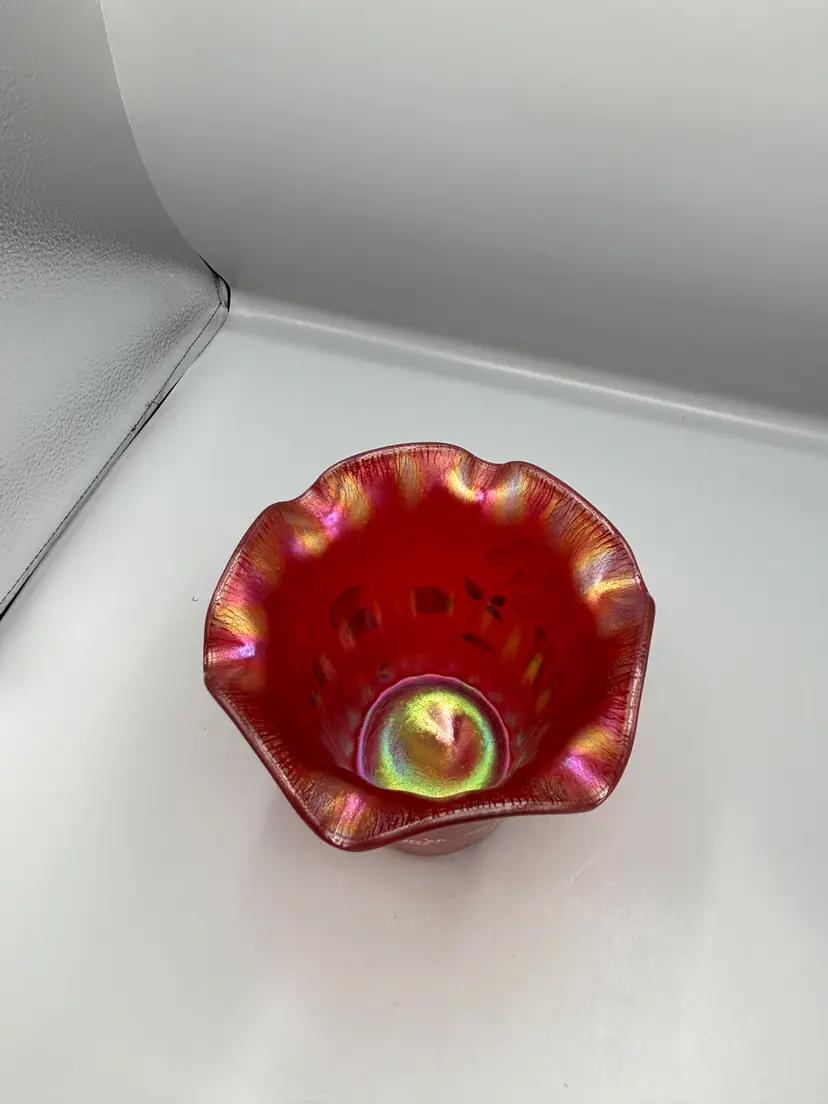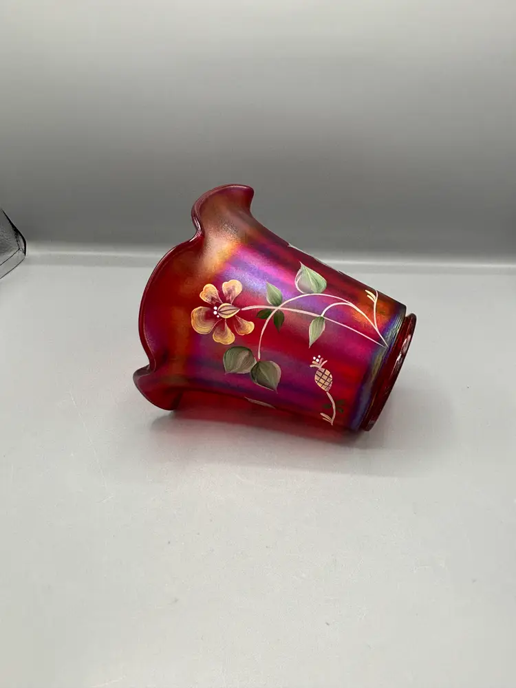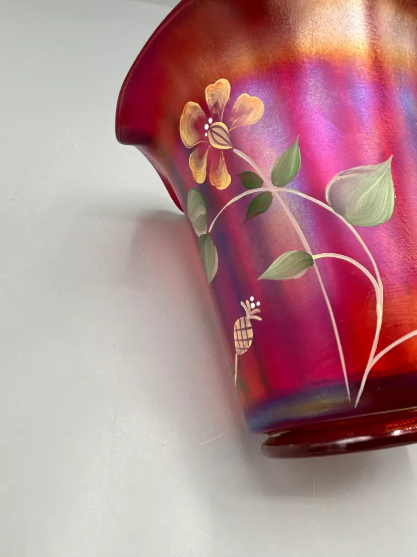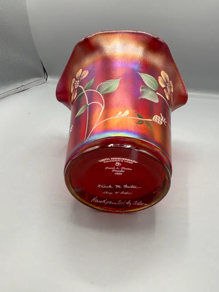 Celebrate a century of artistry with this striking Fenton commemorative piece. Crafted in luminous ruby red with the brand's signature stretch glass technique, this vase showcases delicate floral motifs that capture the elegance of Fenton's storied heritage. A distinguished addition to any glass collection, this 100th anniversary edition combines vintage charm with timeless design.