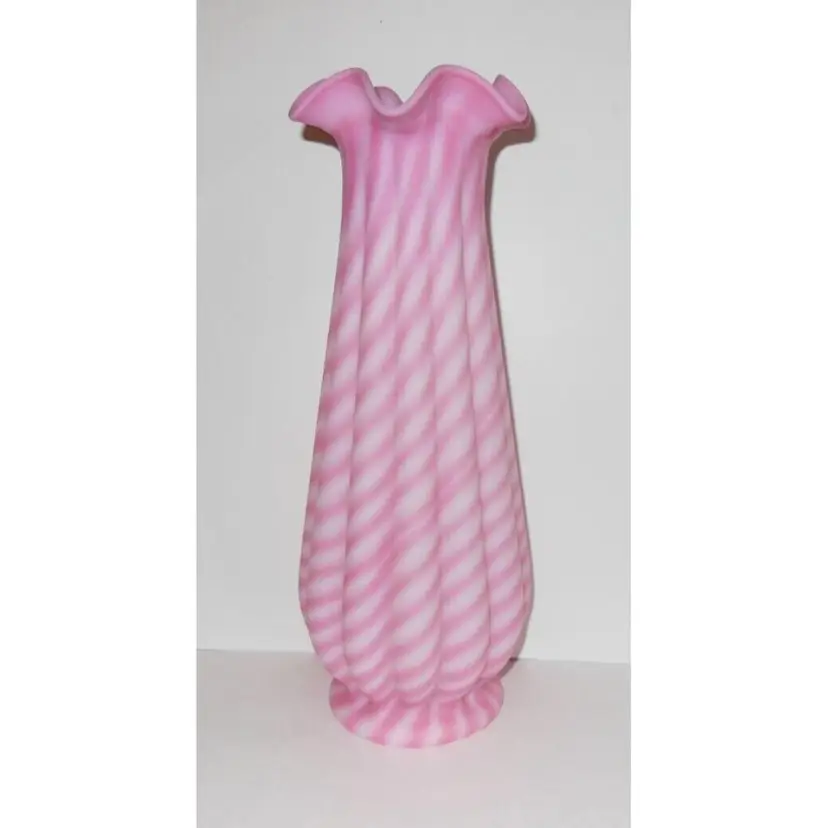 This is a GORGEOUS, Vintage Fenton Glass, QVC Exclusive, 1993, Rosaline Satin Spiral Optic Vase!! It is done in lovely pink rosaline and white spiral optic pattern and is a pretty tall beauty standing at 14.5" high and is 5.5" in diameter at the widest area. It is in GREAT CONDITION-no chips, cracks, etc. There is no fading of color..this is a gorgeous deep to light pinks with the white spiraled mix. STUNNING and it's tall height, makes it a statement piece in any #Fenton collection! Please see all pics, as they are part of the description. Will be insured fully for shipping!