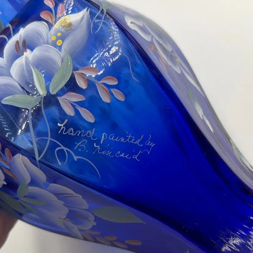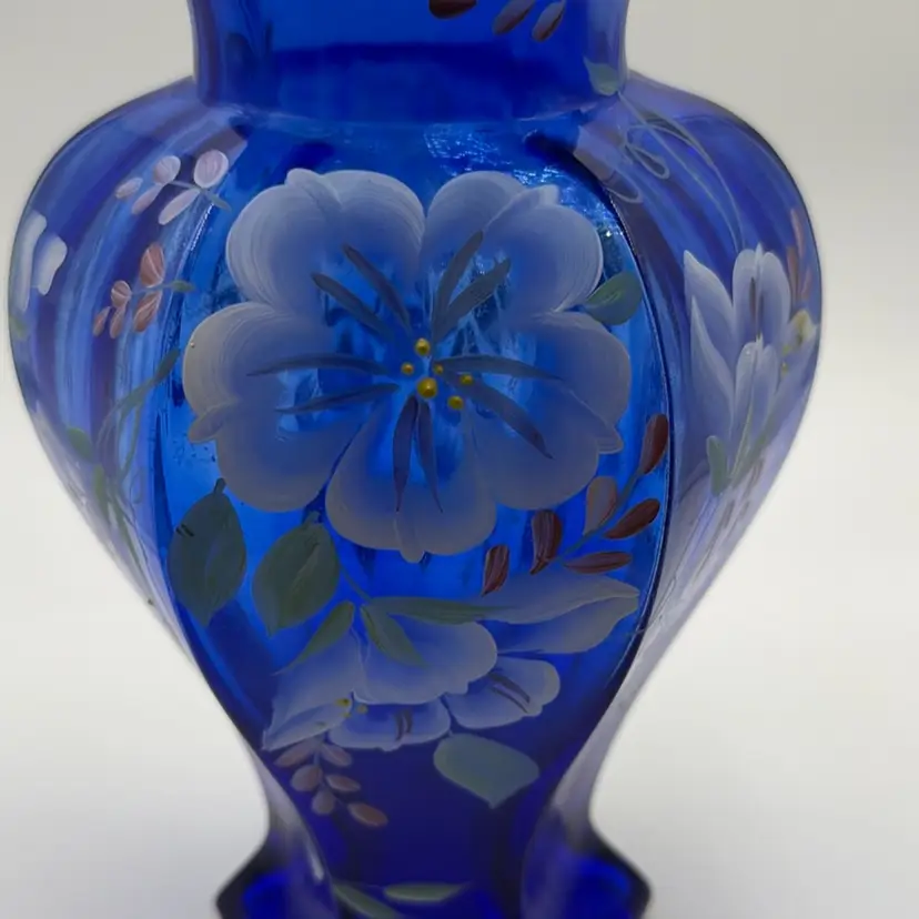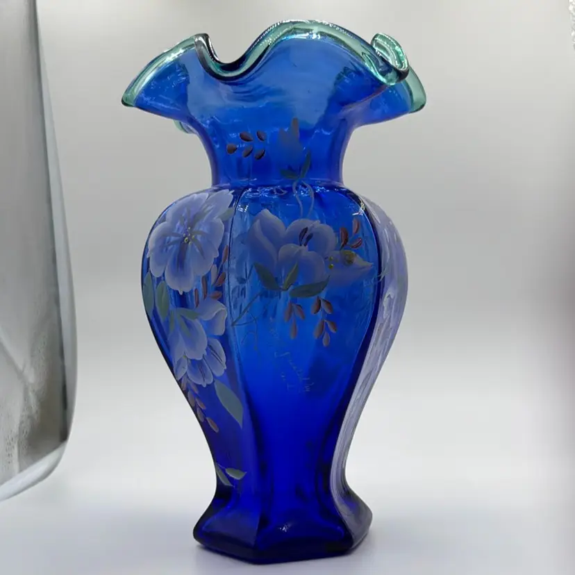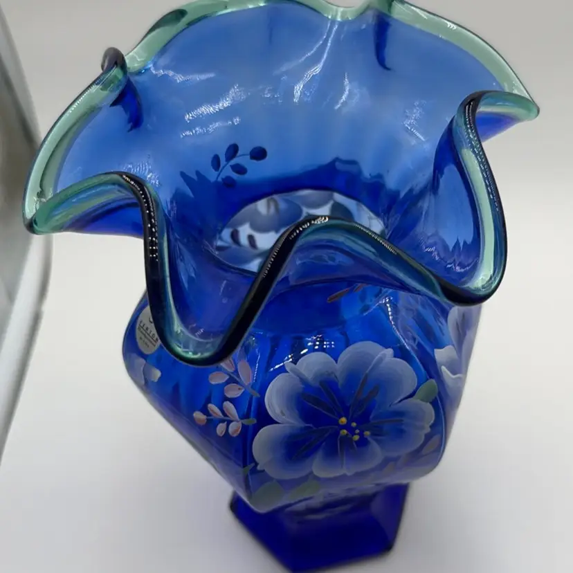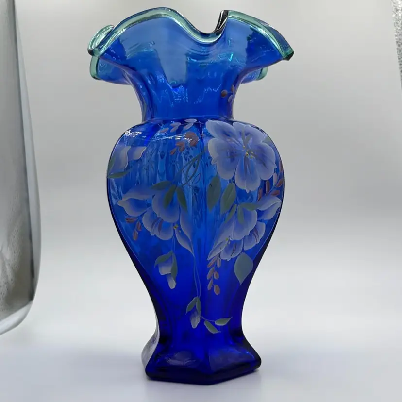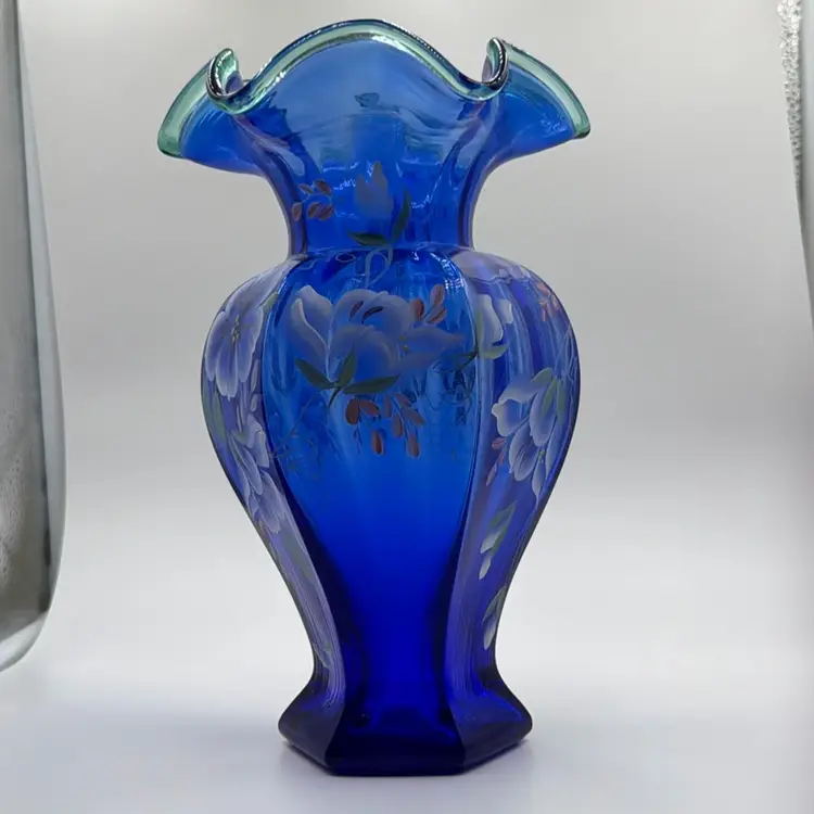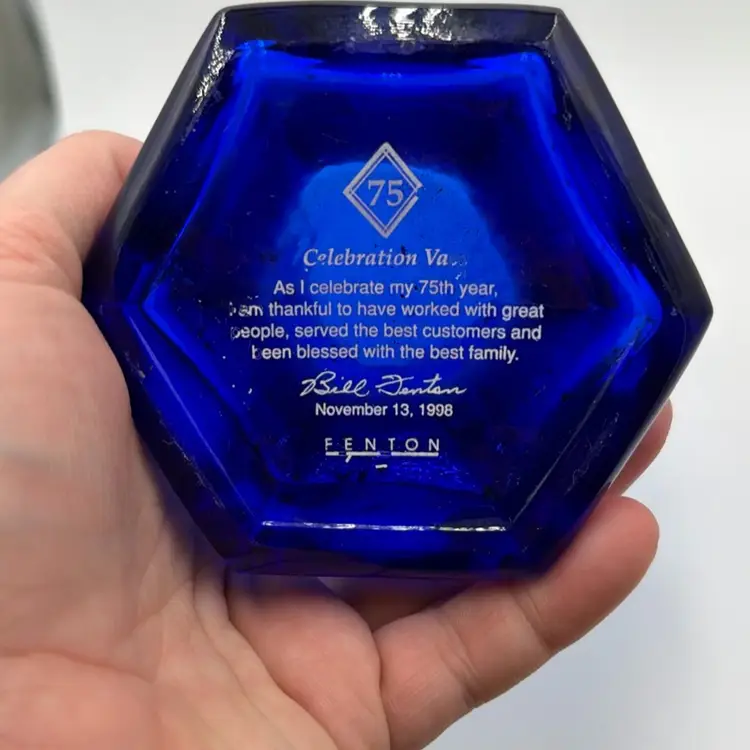 Fenton 1998 Cobalt Blue 75th Anniversary Hexagonal Vase Hand Painted Green Crest Hand-Painted and Hand-Signed.