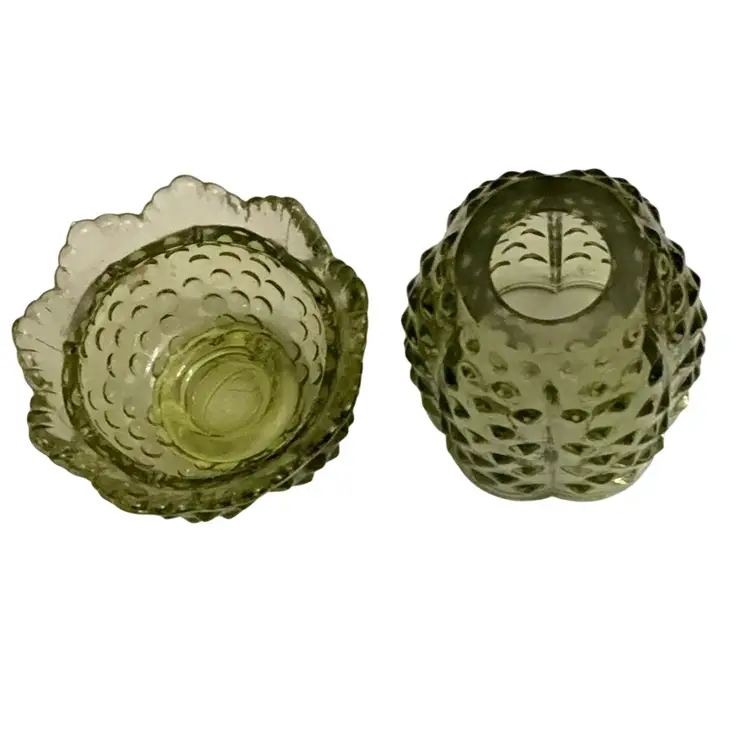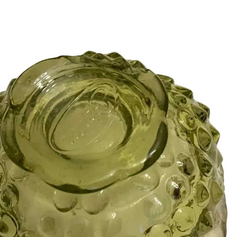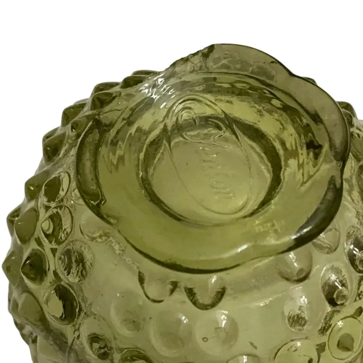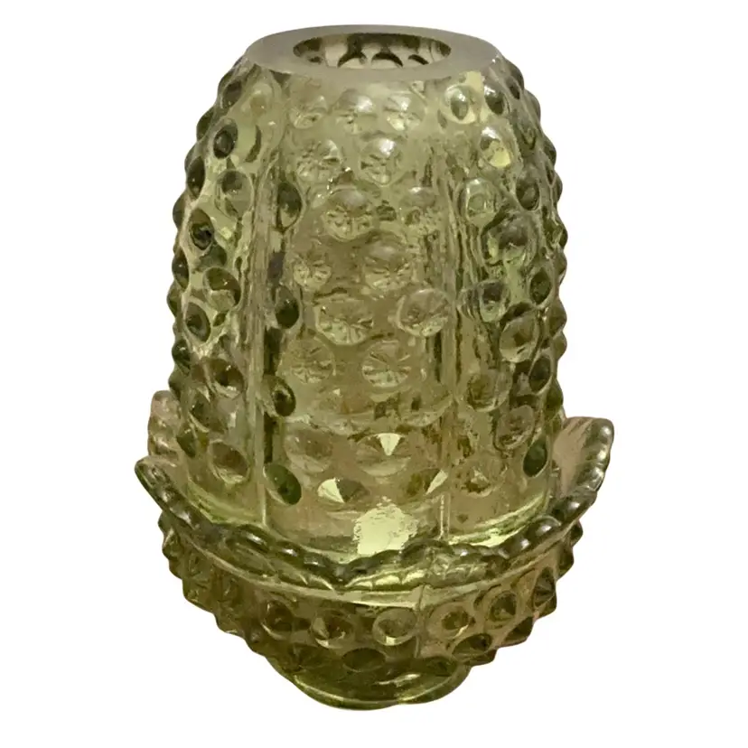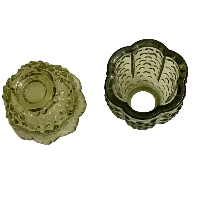 Lovely avocado green hobnail 2-piece fairy light. Has older Fenton stamped logo on base. Also there is a large chip on the pedestal base. It does not impact the item’s stability. It is not noticeable unless pointed out. Price reflects damage.