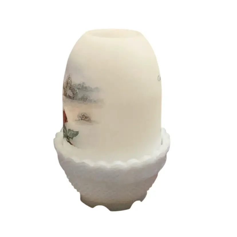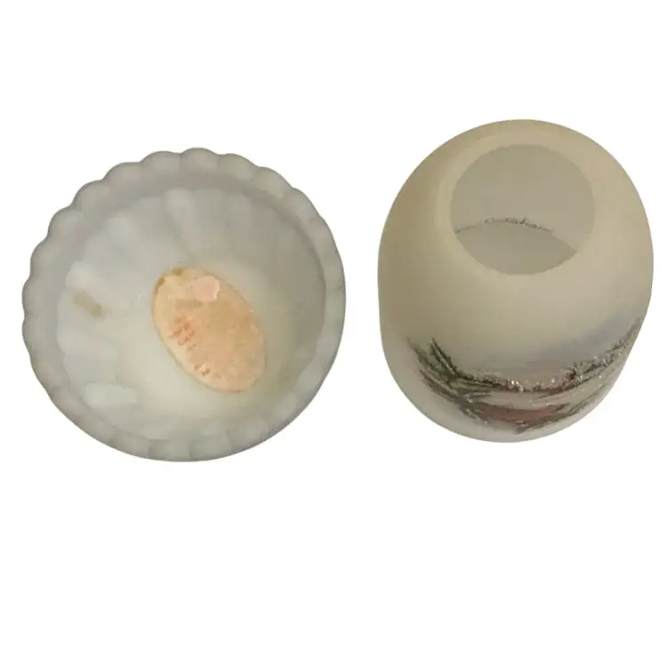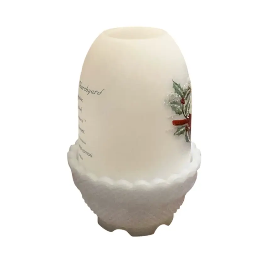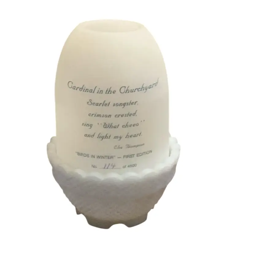 Stunning hand painted cardinal bird in a churchyard. Limited edition item #114/4500. Beautiful frit work to mimic the snowy ground. No condition issues. Artist signed but no original Fenton sticker. The Fenton stamped logo is on the base with the number 8 indicating the decade in which this piece was produced ( 1980’s.)